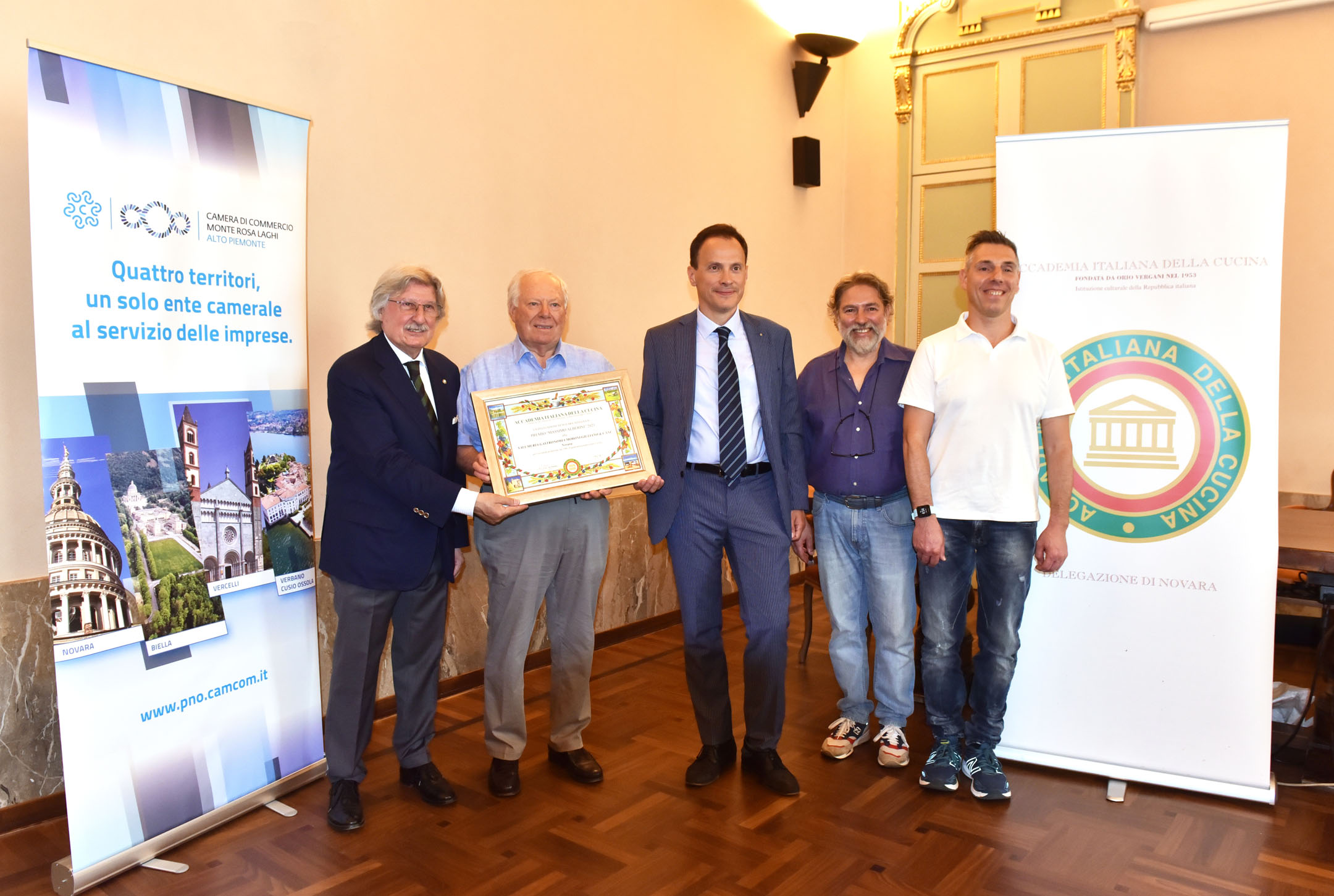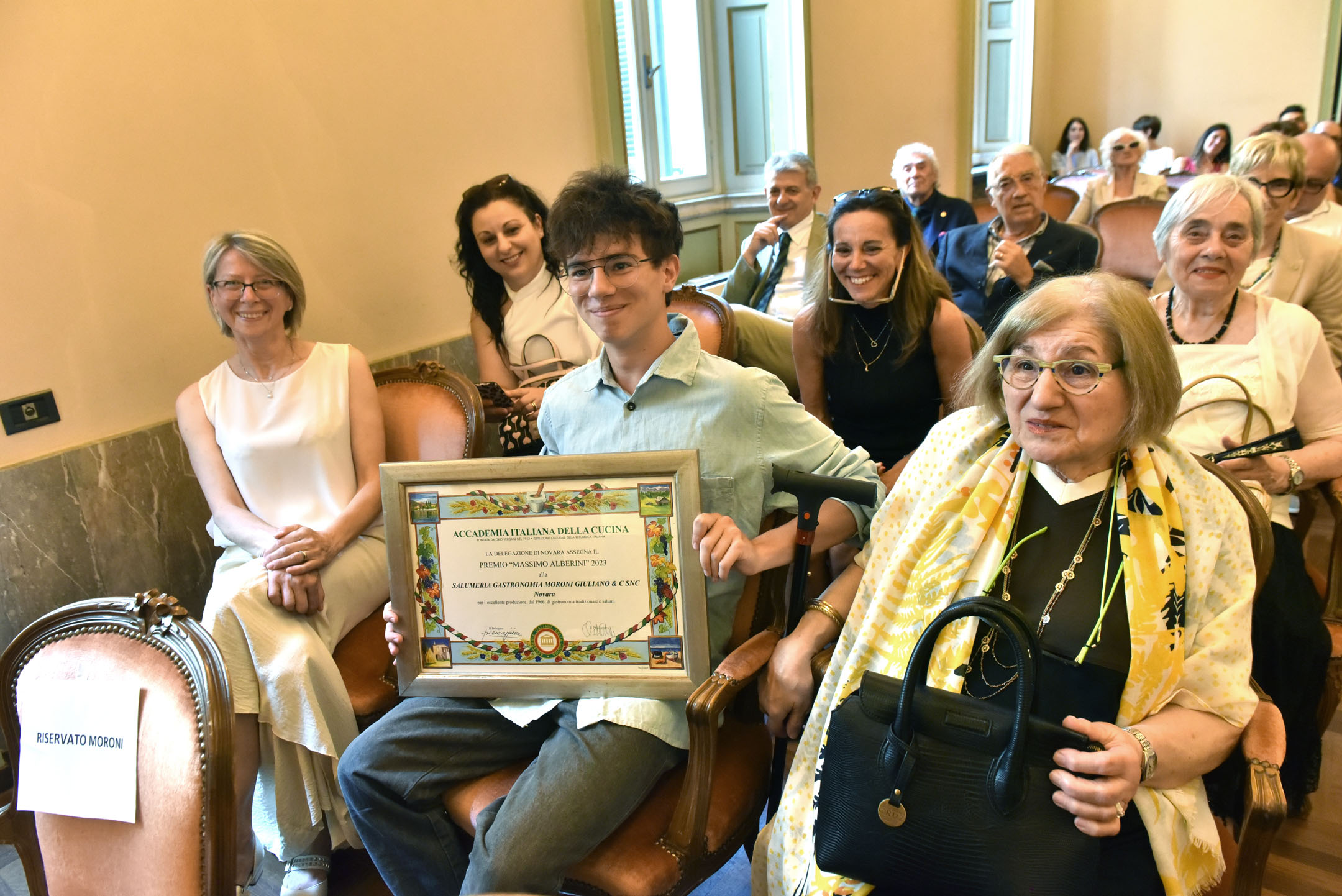 La Delegazione di Novara ha consegnato il Premio Massimo Alberini alla Gastronomia-Salumeria Moroni di Novara che dal 1966 offre al pubblico alimenti di grande qualità preparati in proprio. A Novara dire “andare dal Moroni“ significa, da oltre 50 anni, acquistare alimenti genuini, preparati con cura e amore. Il Premio è stato consegnato nella elegante sala del Consiglio della Camera di Commercio che riunisce le province di Novara, Vercelli, Biella, Verbano Cusio. Il presidente dott. Fabio Ravanelli ha avuto parole di elogio per la famiglia Moroni, tutta presente - padre, figli e nipoti - ed ha parlato dell’importante ruolo dell’Accademia Italiana della Cucina nell’opera di valorizzazione delle eccellenze dei vari territori. Il delegato Piero Spaini ha ricordato la nascita, gli obiettivi e gli scopi culturali dell’Accademia. Presenti il vice Sindaco di Novara, l’Assessore al Commercio della Provincia e il Direttore dell’Associazione Artigiani. È seguito un brindisi nel grazioso cortiletto della salumeria. Foto 1. numeroso pubblico presente alla premiazione. Foto 2. Il titolare Giuliano Moroni riceve il premio, al centro il Presidente CCIA. Foto 3. Il nipote del titolare mostra con orgoglio il premio Massimo Alberini. Foto 4. Brindisi nel cortile della salumeria Moroni.
