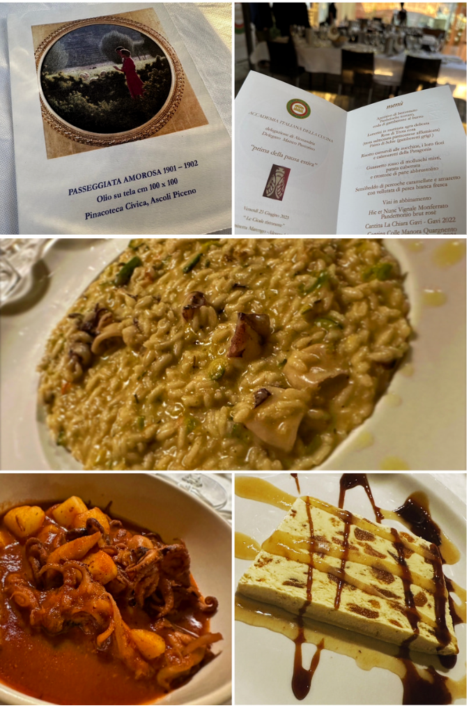 Straordinaria riunione conviviale della Delegazione di Ascoli Piceno condotta con la collaborazione della Simposiarca Dina Bruni presso il Ristorante “Il Tiglio” di Montemonaco (AP) dello chef Enrico Mazzaroni. Le pietanze sono state tutte illustrate con una encomiabile modestia e sono state tutte incondizionatamente apprezzate dalla generalità degli astanti. I piatti hanno riscosso tutti un alto gradimento ma in particolare vanno segnalati: il “carciofo ripieno alla mugnaia” (l’ortaggio è oggi ancora in fiore in montagna), i “tortellini con ragù d’anatra”; superba, poi, la “faraona arrosto”. L’Accademico Leonardo Seghetti, membro del Centro Studi F. Marenghi, ospite principale dell’incontro conviviale oltre al Delegato di Jesi Pietro Aresta, ha intrattenuto piacevolmente i commensali, disquisendo tra l’altro sull’indovinato abbinamento dei vini. Dunque esperienza assolutamente positiva che ha lasciato soddisfatti tutti. Foto 1. Lo chef E. Mazzaroni illustra le pietanze. Foto 2. La Simposiarca D. Bruni con lo chef. Foto 3. Accademici,ospiti e sala. Foto 4. Consegna del guidoncino e del piatto silver da parte del Delegato Vittorio Ricci.