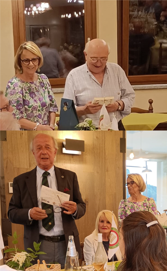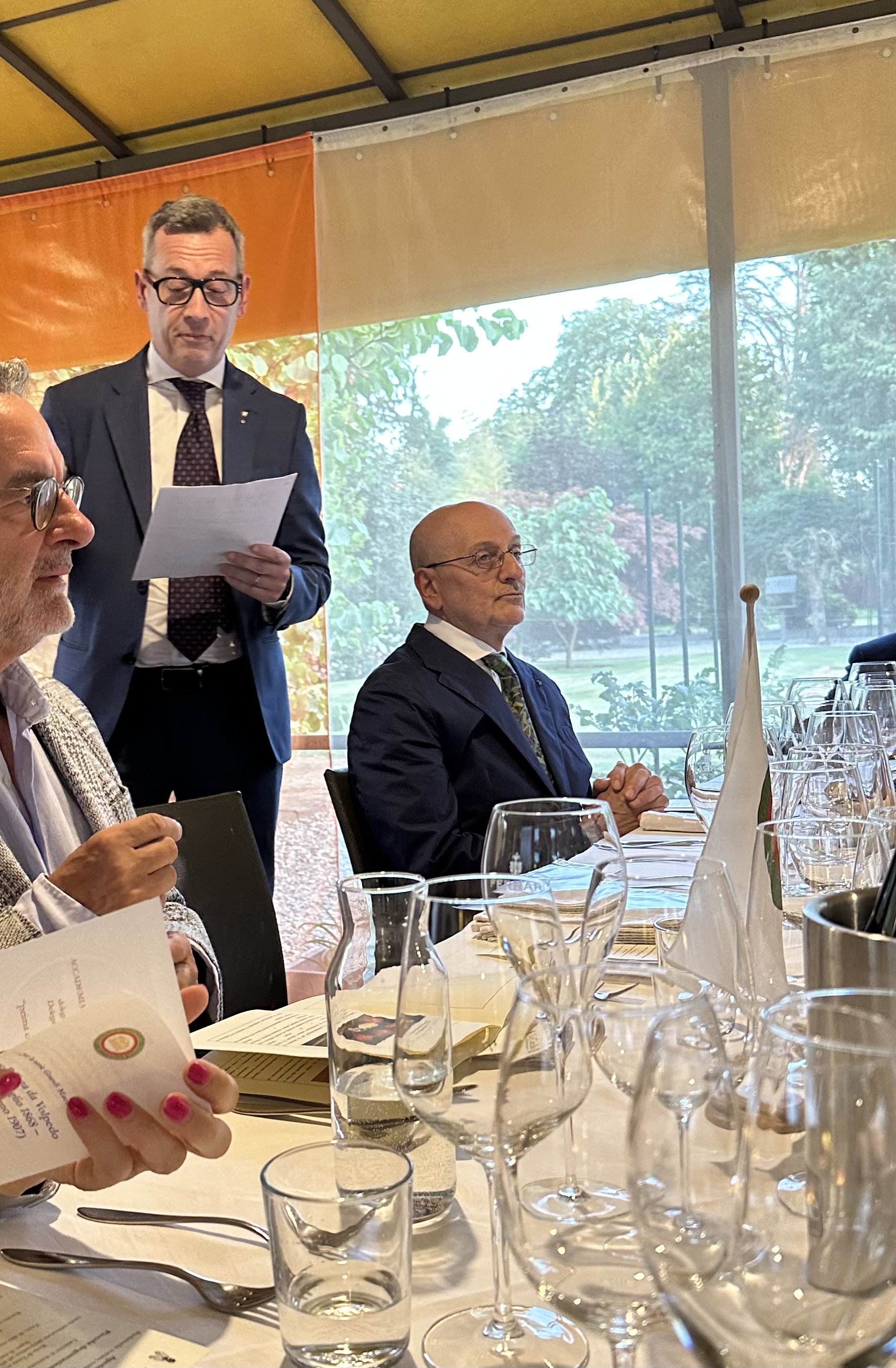Un bel dehors circondato dal giardino del ristorante Le Cicale ha fatto da cornice all'ultima conviviale degli Accademici alessandrini (foto 1) prima della consueta pausa estiva. Lo chef Roberto Molinari ha deliziato i presenti con un menù (foto 2) incentrato sul pesce declinato in più modi, cercando di trasmettere, come sottolineato dal Simposiarca della serata, Consultore Carlo Bajardi (foto 3), quelle sensazioni e quei ricordi legati al periodo estivo. Anche in questa occasione non è mancato l'intervento del Vice Delegato Giorgio Borsino incentrato su ulteriori quattro eccellenze alessandrine: le cipolle rosse e dorate di Castellazzo, i sedani di Alluvioni Cambiò e la melanzana violetta del casalese. Ha poi concluso il convivio l’intervento del Delegato Matteo Pastorino che, dopo aver sottolineato l'importanza della ricerca, della conoscenza e della tutela dei prodotti locali alla base della tradizione enogastronomica Italiana, ha esposto il programma delle attività della Delegazione per il secondo semestre e consegnato la vetrofania 2023 dell’Accademia allo chef del locale (foto 4). Particolarmente ricercata la versione grafica del menù curata dal Vice Delegato Adriano Benzi e da Rosalba Dolermo raffigurante un'opera di Pellizza da Volpedo (foto 2).