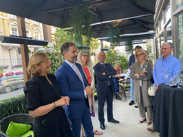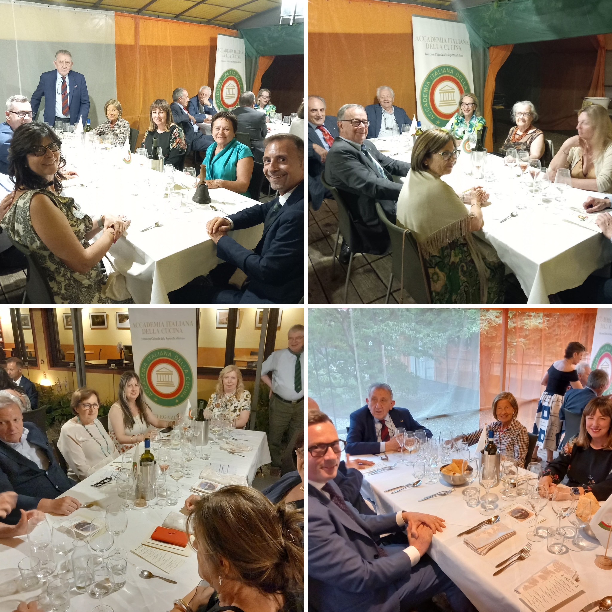 Come momento ideale per scambiarsi gli auguri estivi, la Delegazione di Londra ha scelto quell’abitudine tutta italiana, sana e conviviale, dell’apericena. All’aperto, in una limpida e tiepida serata londinese, La Terrazza dell’hotel Xenia di Londra della catena Marriott, sotto lo sguardo attento del manager Alessandro Convertino, ha accolto Accademici e ospiti di riguardo come il Console Domenico Bellantone e Signora e il Direttore dell’ICE Dottor Sacchi e Signora. Un calice di fresco Prosecco seguito da una sequenza colorata e deliziosa di stuzzicchini e piatti saporiti preparati dal bravo chef pugliese Raffaele Lauriola e accompagnati da vini siciliani. L’attenzione che Raffaele dedica alla provenienza, alle certificazioni e ai trattamenti delle materie prime si riflette nel sapore autentico e delicato delle creazioni per la serata. Arancini mignon; rotolini di verdure grigliate; quadratini di focaccia farciti con prosciutto di Parma, mozzarella e pesto; frittatine al forno con verdure; risotto con asparagi; ravioli con ripieno di carne di vitello e sugo di pomodori datterini freschi e, a concludere, mini Tiramisu, crostatine ai frutti di bosco su crema di limone; bicchierini di Bavarese al melone. A conclusione, dopo gli auguri di buone vacanze e un arrivederci a settembre da parte della Simposiarca della serata Silvia Mazzola, l'Accademico Filippo Scevola ha presentato un foglio di nocciolato fondente - una golosità tutta torinese - celebrando così una città che insieme a Milano ha contribuito a portare il rito dell’aperitivo nel mondo.