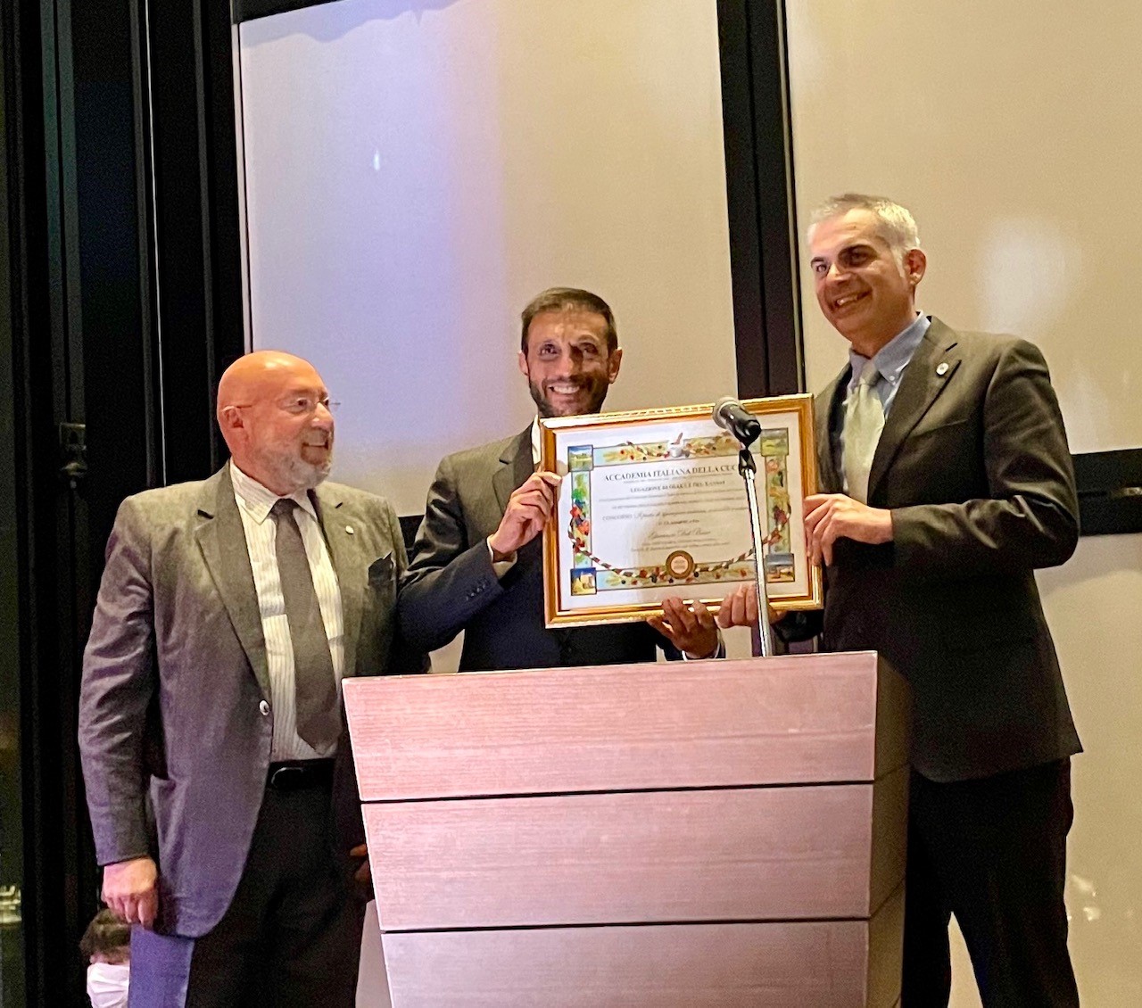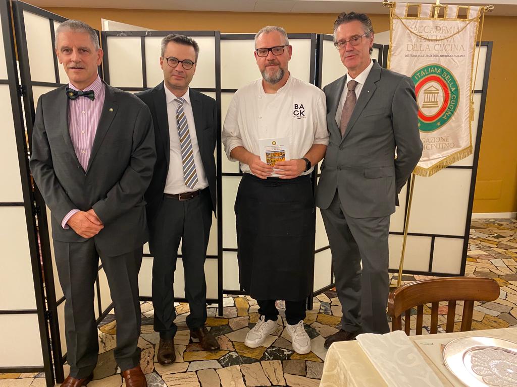 Nella cornice della cena organizzata dal Consolato Italiano di Osaka per la VII SCIM presso il ristorante Atmos (Conrad Hotel) di Osaka, si è svolta la premiazione ufficiale del concorso “Il piatto di ispirazione italiana, sostenibile e salutare” organizzato dalla Legazione di Osaka e del Kansai. Il concorso è stato proposto a oltre 150 cuochi di ispirazioni italiana residenti nell’area del Kansai e, tra tutti i partecipanti, la giuria composta dagli Accademici della Legazione, ha selezionato le migliori tre ricette presentate dai tre cuochi premiati dal Console Generale Italiano ad Osaka Marco Prencipe e dal Legato di Osaka e del Kansai Francesco Santi Formiconi. Il vincitore del concorso è stato lo chef Giovanni dal Bosco, titolare del ristorante Dal Chef's Table di Tanabe con la ricetta “Tortelli di Zucca Umeretto con salsa crema alle erbe”, seguito dallo chef Maurizio Roberti, titolare del ristorante Forno Italico ad Izumi con la ricetta “Gnocchi Cacio e Pepe all'ortolana autunnale” e dallo chef Alessio Taffarello del Ristorante Garden Giovanni di Shirahama con la ricetta “Tachiuo (pesce spatola in lingua giapponese) al beccafico moderno”. I circa cento invitati all’evento di premiazione hanno potuto conoscere e scambiare opinioni con i 3 cuochi premiati ed il concorso, il primo organizzato dalla Legazione di Osaka e del Kansai, nata solo nel 2021, è stato un bel successo che ha attirato anche l’attenzione della stampa locale.