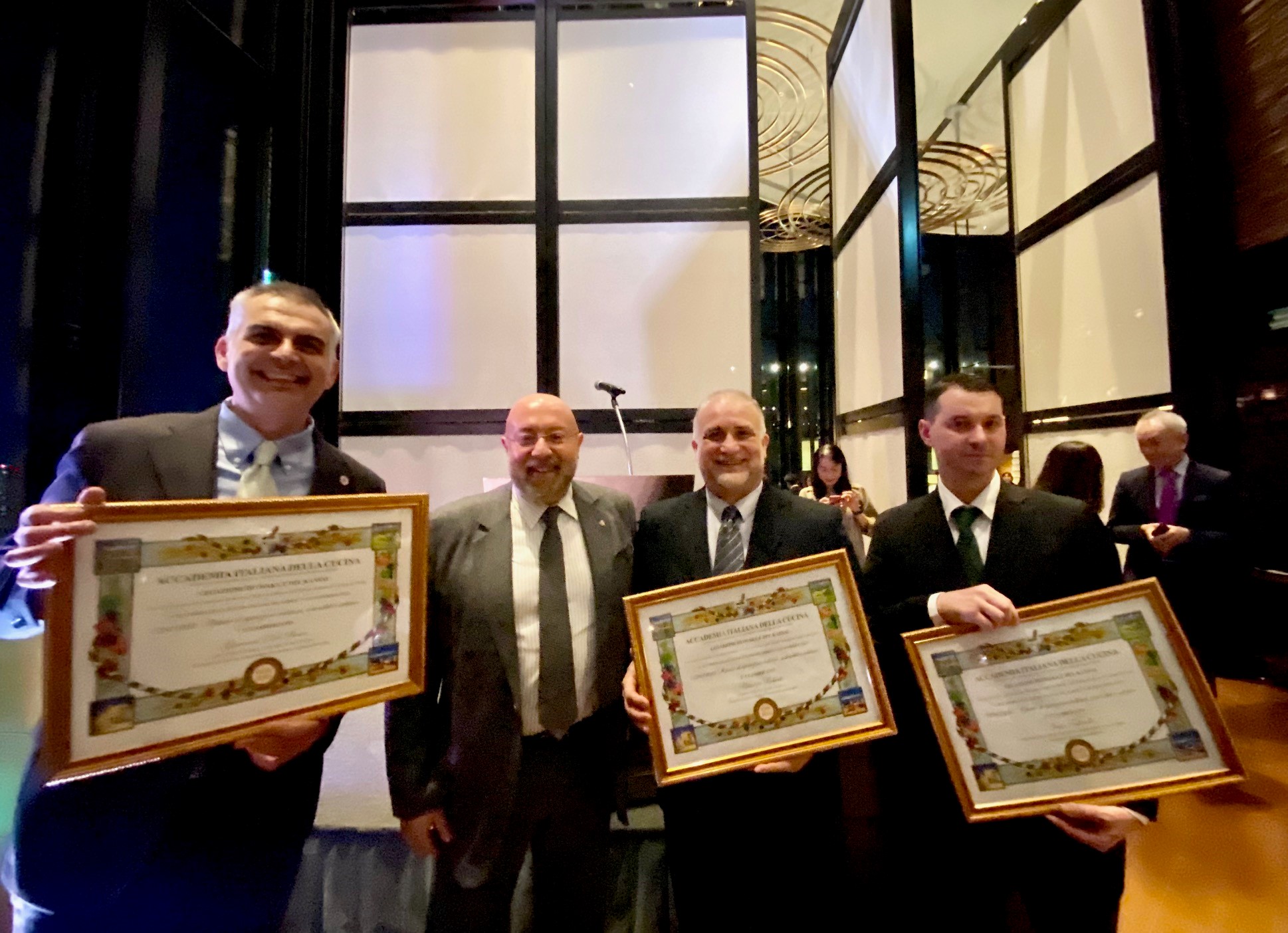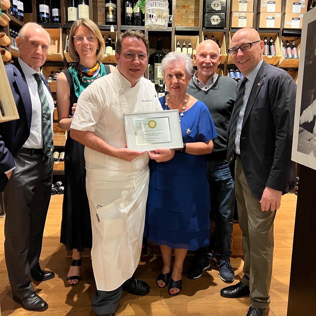 VII Settimana della Cucina Italiana nel Mondo celebrata a Singapore presso il ristorante “Da Valentino”. In questa occasione S.E. l’Ambasciatore Mario A. Vattani, il Delegato Giorgio M. Rosica e la Simposiarca Maurizia Debiaggi hanno consegnato, allo chef Valentino Valtulina, il Diploma di Buona Cucina assegnato quest’anno al suo ristorante (Foto 1) per la difesa e la diffusione della tradizione gastronomica italiana portata avanti da vent’anni da chef Valentino insieme con la sua famiglia. I piatti serviti sono stati apprezzati da tutti gli Accademici e dai numerosi ospiti (Foto 2). Dall’uovo con tartufo e funghi, attraverso tagliatelle caserecce al brasato di manzo (Foto 3) e branzino al sale, la cena è terminata superbamente con il panettone farcito preparato da Perla Valtulina (Foto 4). Numerosi e graditi gli interventi dello chef che, tra una portata e l’altra, ha parlato della tradizione, delle tecniche e della sostenibilità dei piatti, in un clima di grande convivialità che ha accompagnato tutta la serata.