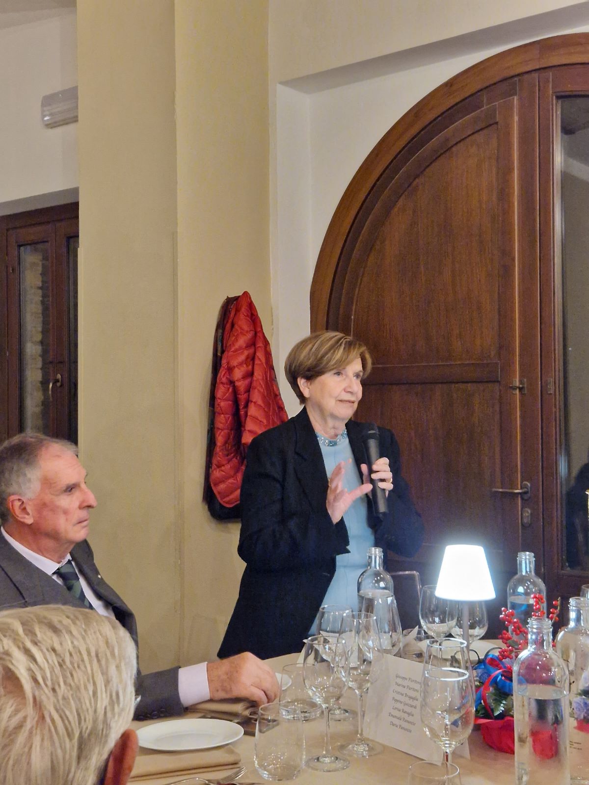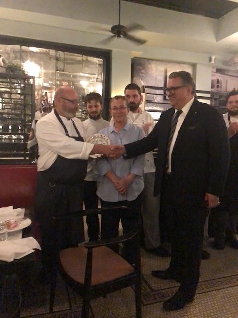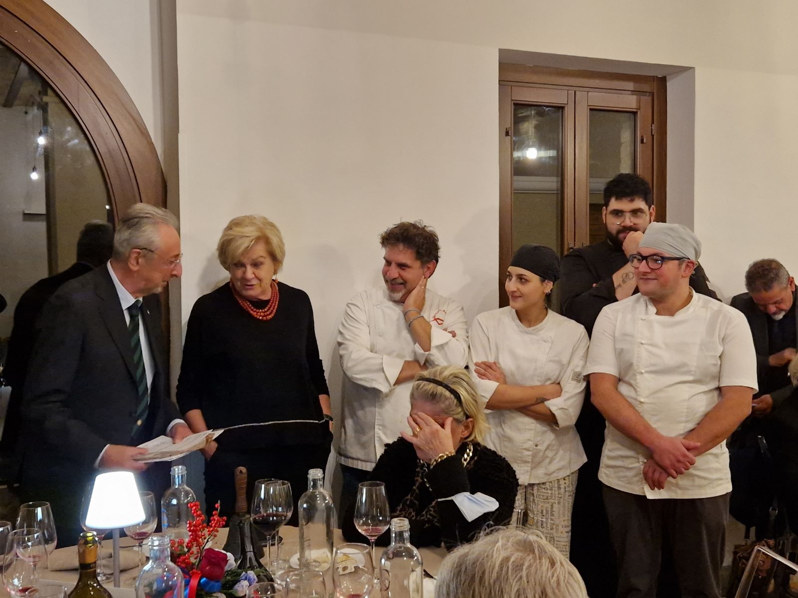 Gli Accademici si sono ritrovati al ristorante Cosimo de’ Medici a Barberino di Mugello (FI) per la riunione conviviale di novembre. Grande l'accoglienza di Claudio Fontani, responsabile di sala e gestore dal 1981 insieme alla sua famiglia di questo ormai storico locale, che per la serata ha riservato alla Delegazione un'apposita sala allestita con un bellissimo tavolo imperiale. Alto il gradimento del menu e degno di nota il servizio in sala, attento anche alle esigenze di chi, viaggiando, abbandona la vicinissima autostrada per una breve sosta. Una conviviale trascorsa in amicizia e piacevolezza, che si è conclusa con la consegna al ristoratore del piatto dell’Accademia. Foto 1. I saluti della Delegata. Foto 2. Un momento della serata. Foto 3. La brigata di cucina e il personale di sala. Foto 4. Zuppa di cipolle; pappardelle sulla lepre; tagliata di manzo.