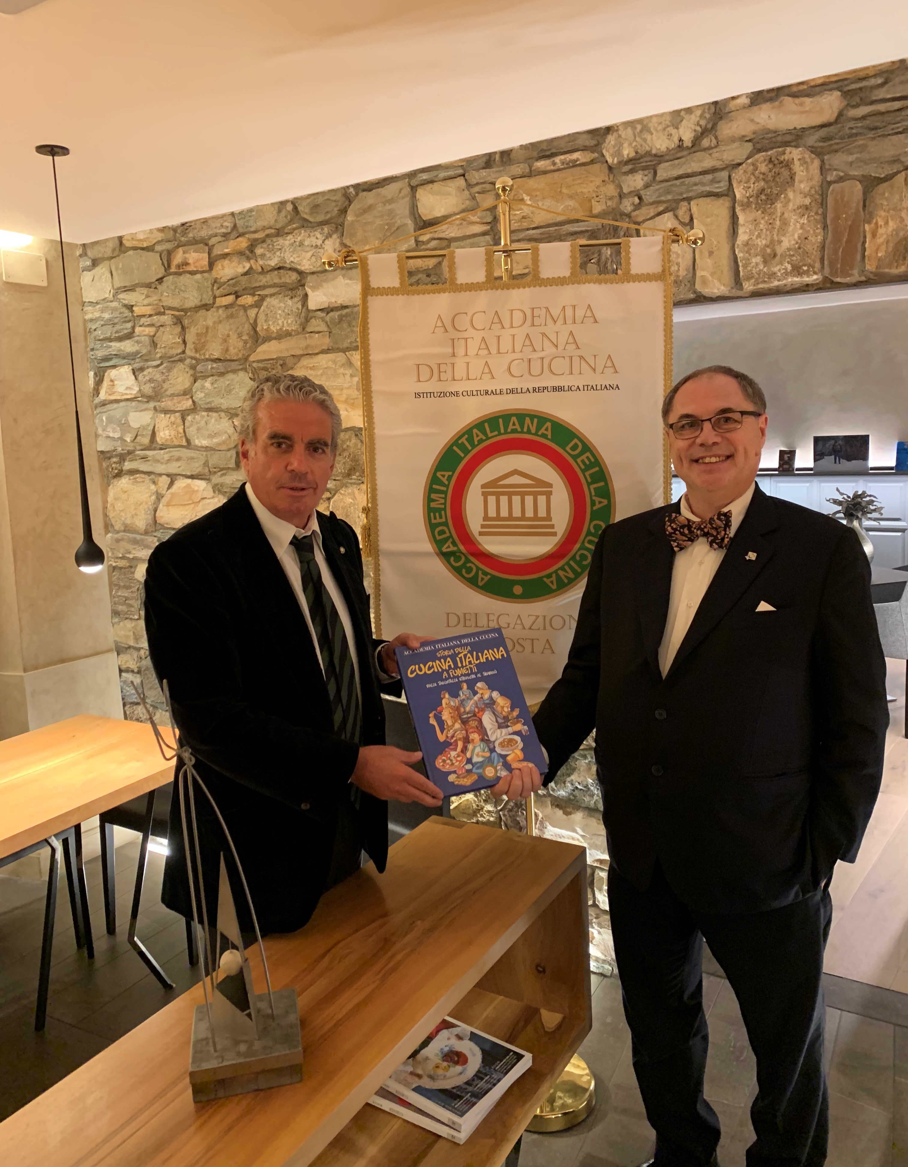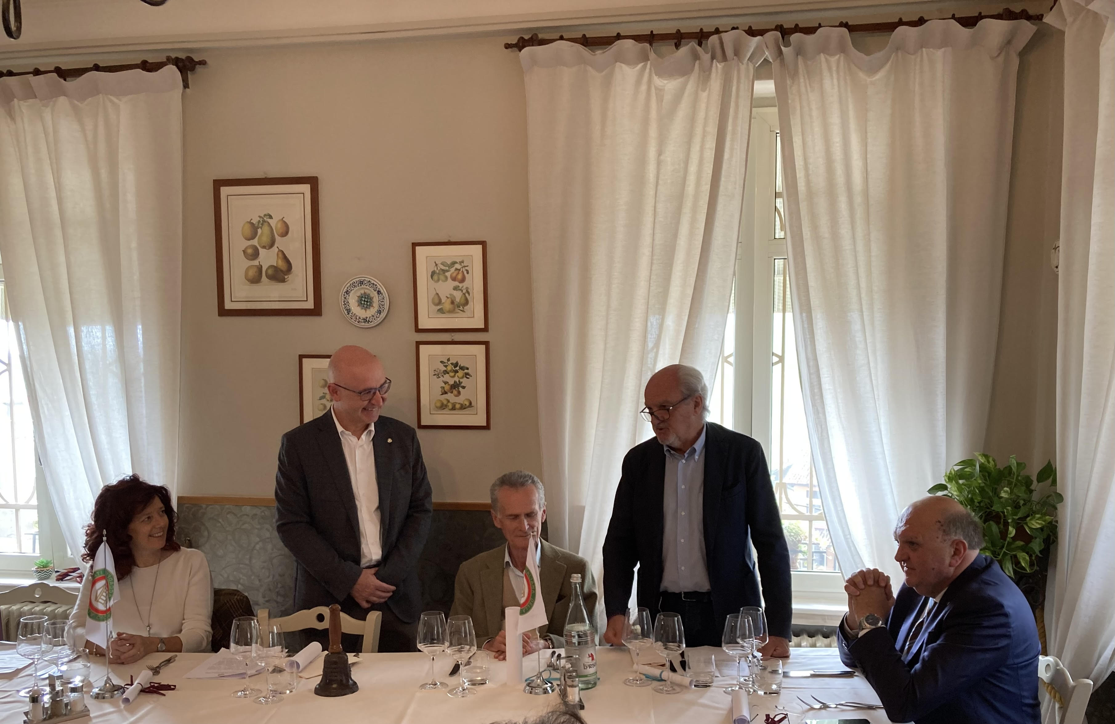 La cena ecumenica della Delegazione di Aosta si è svolta alla Locanda La Clusaz di Gignod con Simposiarca il DCST Valle d’Aosta Emiro Marcoz e relatori il giornalista enogastronomico Paolo Massobrio (in foto con il Delegato Andrea Nicola) e l’agrotecnico Diego Bovard.