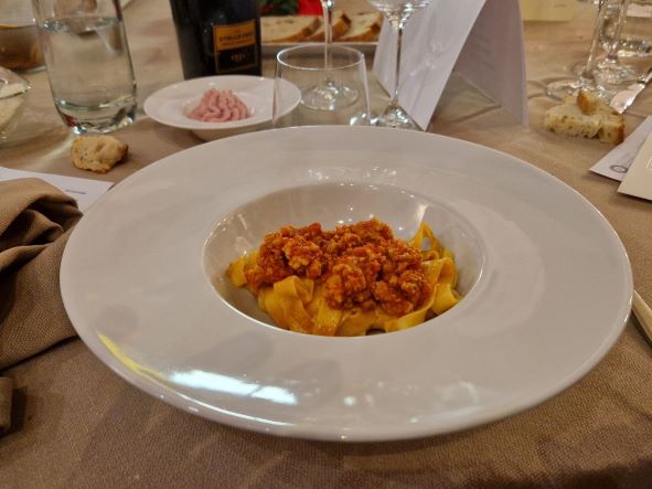 La conviviale di novembre si è tenuta all’osteria “La Corte” in località Spoltore. Tema della serata “la cucina bolognese”; relatrice la Delegata di Bologna Cristina Bragaglia (foto 1) che ha raccontato, con ricchezza di particolari, la storia e le peculiarità gastronomiche della cucina bolognese, dai tortellini in brodo, alla mortadella, alle lasagne e poi le tagliatelle al ragù, le crescentine, le cotolette petroniane e il bollito, capisaldi del gusto della capitale emiliana. Protagonista assoluta della serata è stata la Simposiarca Lorisa Ravaglia, bolognese d’origine ed Accademica di Pescara (foto 2). Il menu proposto è stato realizzato con prodotti rigorosamente del territorio emiliano: per iniziare spuma di mortadella e parmigiano reggiano; a seguire tortellini in brodo; quindi tagliatelle al ragù (foto 3) e bollito misto delle 7 carni con mostarda e contorni di purea e di friggione (foto 4). Per chiudere, il dolce fiordilatte. I vini rigorosamente emiliani dal Lambrusco al Barbera Bolognese. Un’esperienza davvero straordinaria per la qualità dei prodotti e dei piatti e per l'atmosfera serena e compiaciuta di tutti gli Accademici presenti.