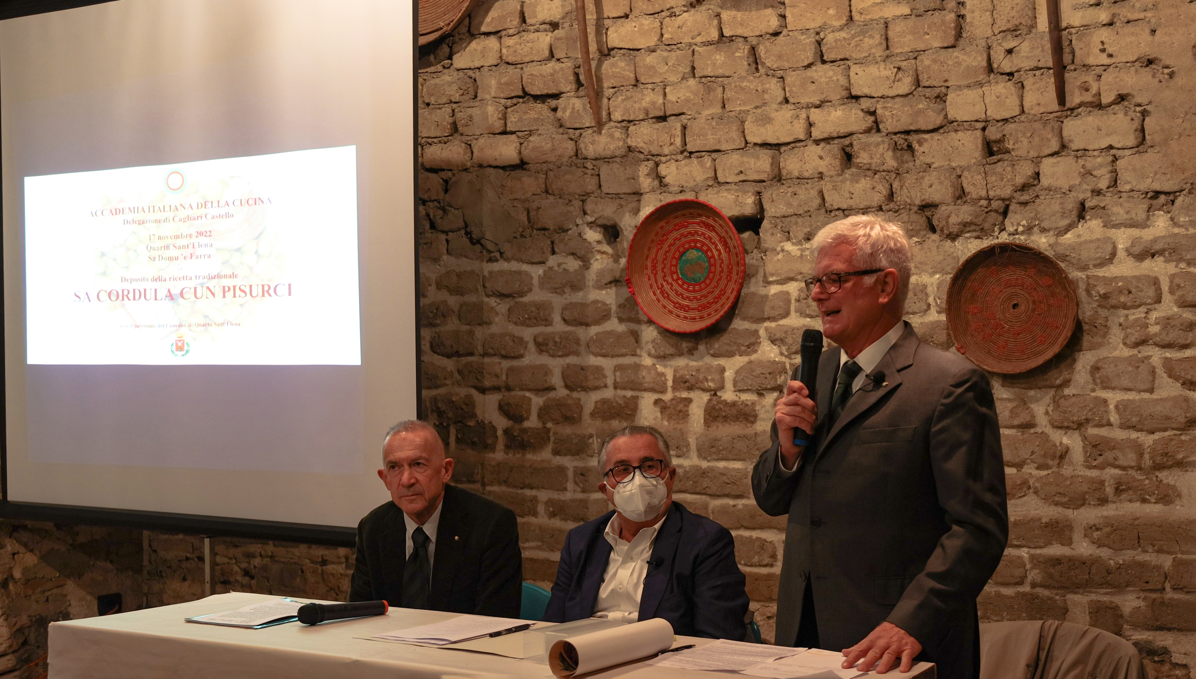 Nella cornice della bellissima Casa Museo ‘Sa Domu ‘e Farra’ (La Casa del Pane) a Quartu Sant’Elena, con la presenza di giovani in costume locale, la Delegazione di Cagliari Castello ha presentato il deposito della ricetta tradizionale ‘Sa Cordula cun Pisurci’ (treccia di budellini di agnello con piselli). Alla presenza degli Accademici e di un numeroso pubblico, il Delegato Franco Panu, dopo aver consegnato il premio nazionale “Dino Villani” alla Cooperativa 27 febbraio di Serramanna per una gustosissima salsiccia di capra, ha ricordato la missione dell’Accademia e il significato del deposito delle ricette tradizionali. Il Consultore Aldo Vanini ha illustrato la ricetta e i significati storici e simbolici del cibo ricavato dalle interiora animali. Dopo la presentazione di un video sulla preparazione della Cordula, il notaio Gian Massimo Sechi ha letto l’atto di deposito. È seguita nella corte della Casa Museo una degustazione apprezzatissima della Cordula con Pisurci preparata in vari modi dal cuoco Efisio Mameli di Quartu Sant’Elena e di dolci tradizionali quartesi, is candelaus e is pardulas.