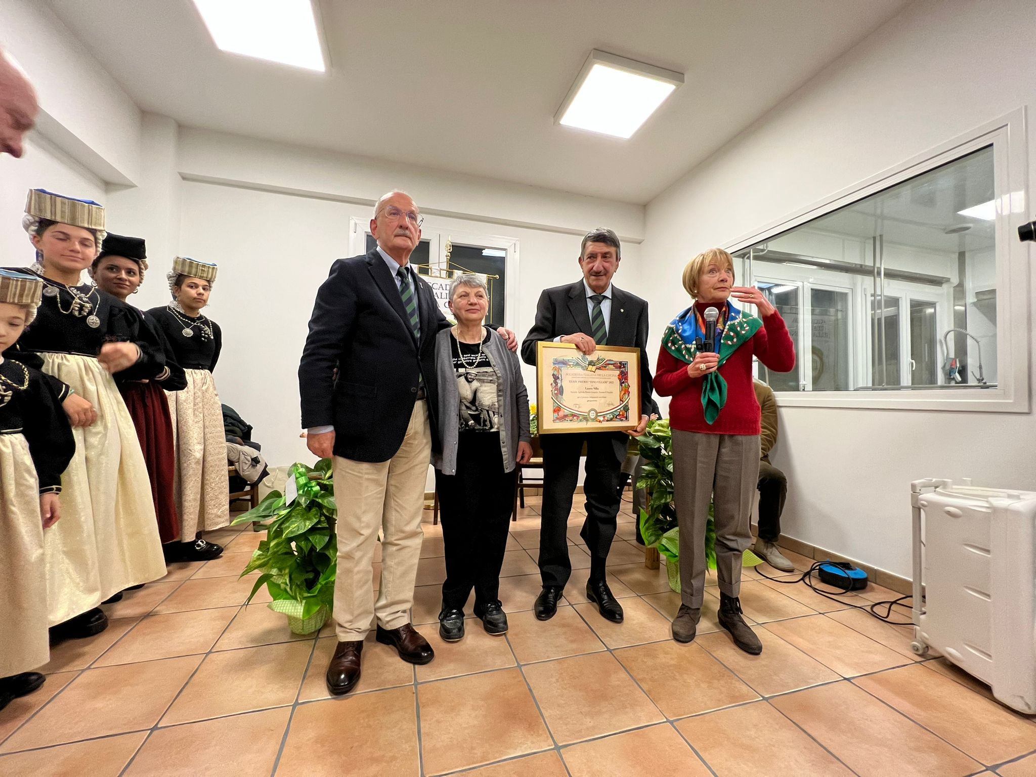 Consegnato a Scanno il Premio "Dino Villani" assegnato al Formaggio Gregoriano dell'Azienda Rotolo. La cerimonia è avvenuta alla presenza del Sindaco Giovanni Mastrogiovanni, delle autorità e di un numeroso pubblico di Accademici e ospiti. Un momento accademico veramente importante e significativo. Foto 1. Il Delegato Giovanni Maria D'Amario introduce i relatori: la Vice Delegata Maria Carmela Petrucci, l'Accademico Gianvincenzo D'Andrea, Il Sindaco Giovanni Mastrogiovanni, il veterinario Luca Farina. Foto 2. Consegna del Premio alla signora Maria Rosaria Rotolo. Foto 3. Foto della sala.