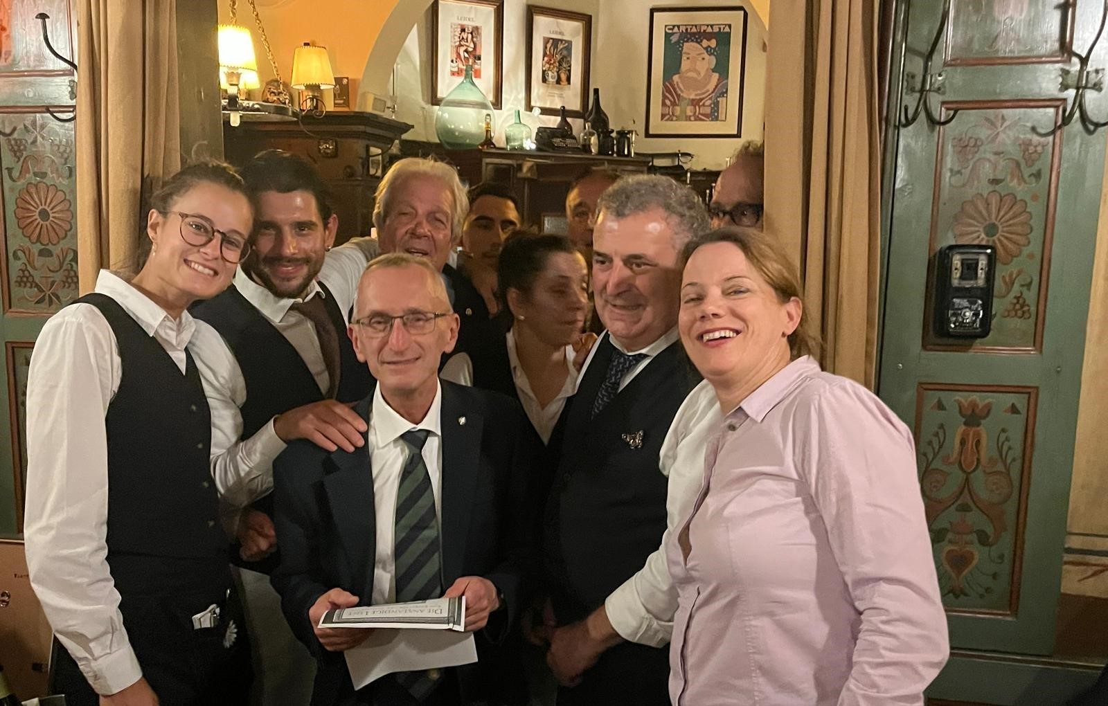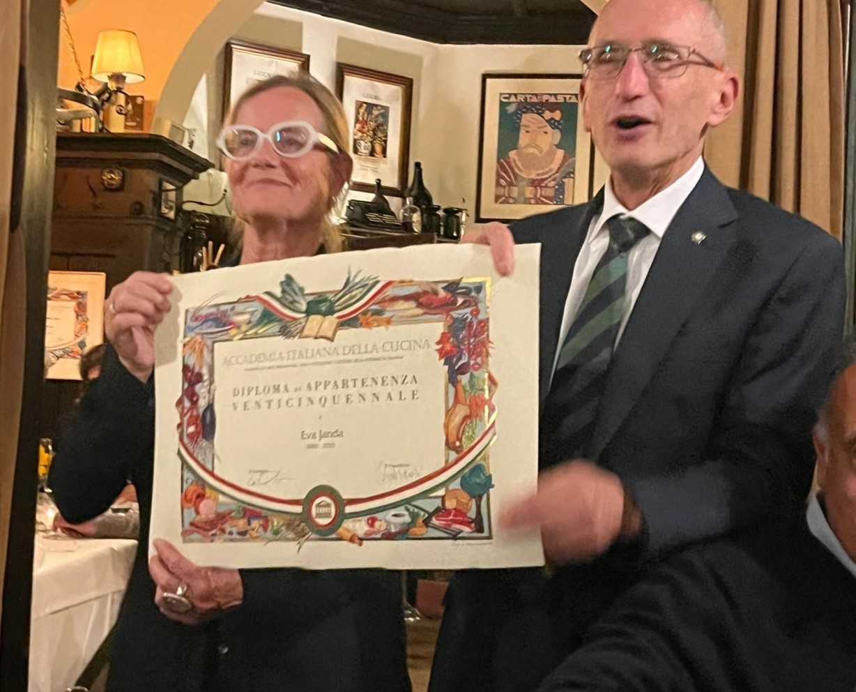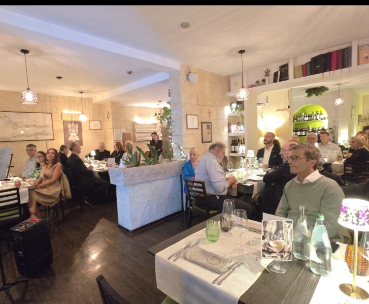 La Cena Ecumenica della Delegazione di Monaco di Baviera si è svolta in un clima di grande convivialità presso l’Osteria Italiana, il più antico ristorante italiano ancora attivo in Germania, fondato nel 1890. Durante la serata sono stati consegnati due riconoscimenti: l’Attestato di Benemerenza a Beppe Cannici, per i quarant’anni di appartenenza all’Accademia, e il Diploma di Appartenenza venticinquennale ad Eva Janda. Entrambi hanno espresso gratitudine verso l’istituzione e gli altri membri, sottolineando il ruolo dell’Accademia nella diffusione della cultura gastronomica italiana. Stephanie Deiters, Simposiarca dell’evento, insieme al gestore Prisco De Stefano e allo chef Umberto Bressanin, ha sviluppato il tema dell’anno proponendo un bollito misto servito al carrello, accompagnato da salse preparate in cucina. Il menù, aperto e concluso da portate dai sapori autunnali e da un primo dedicato alle carni arrosto, ha ottenuto grande apprezzamento, anche per la scenografia del bollito e la preparazione a vista dello zabaione. L’abbinamento dei vini e l’eccellente servizio di sala hanno completato la serata.