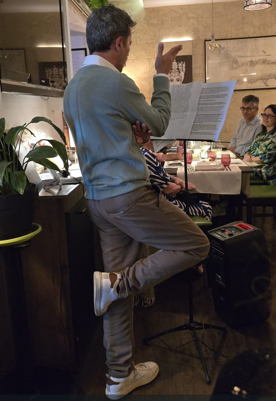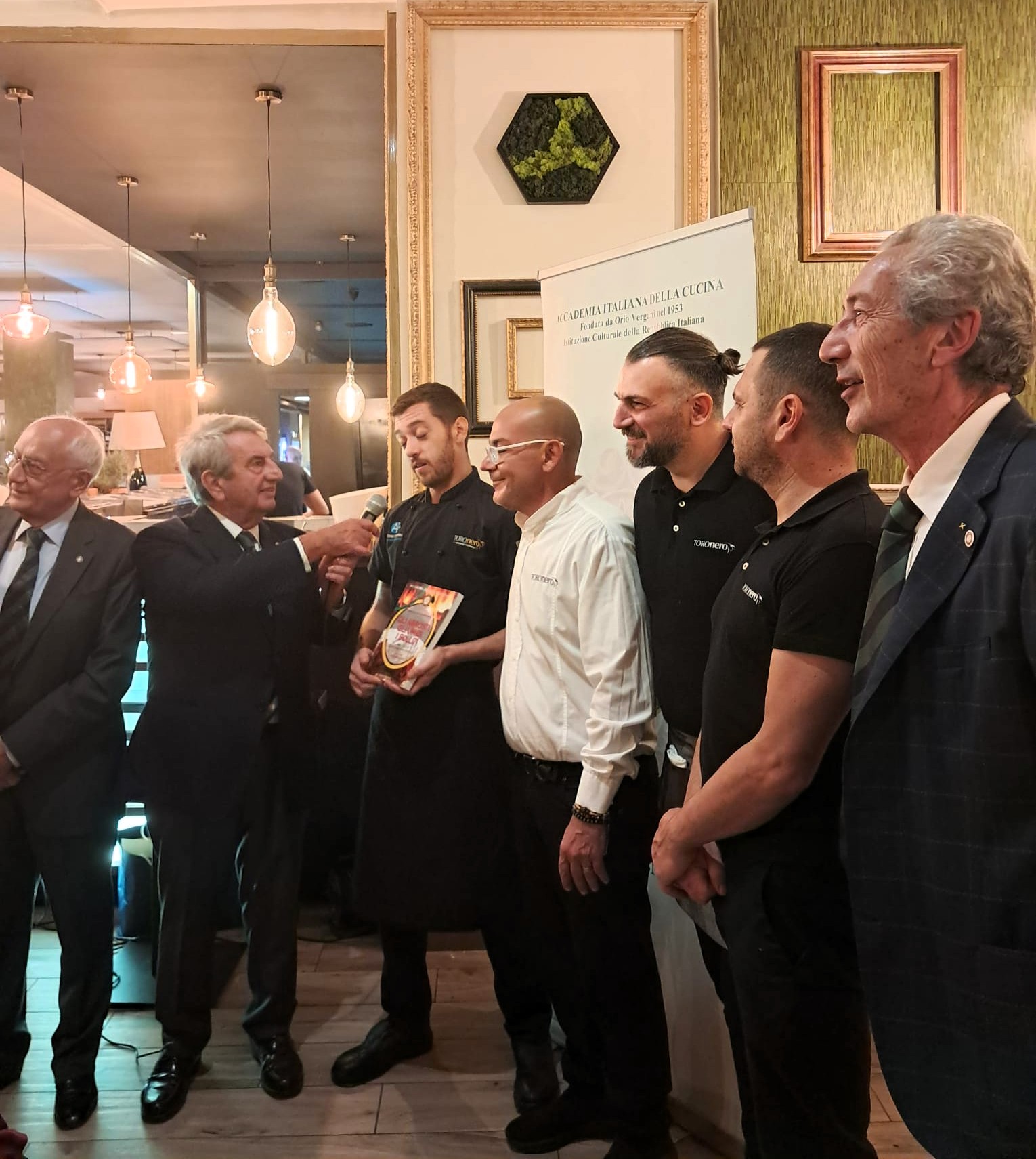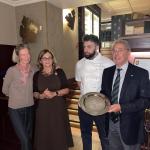 La Cena Ecumenica si è tenuta presso il ristorante Torno Subito, che ha saputo realizzare un piacevole menu tematico rispondente alle indicazioni del Simposiarca, Renato Sirtori. Dopo aver tenuto la sua relazione dedicata al tema dell’anno “Gli arrosti, gli umidi e i bolliti”, che ha sottolineato il valore di queste preparazioni nella cucina tradizionale italiana, nell’attenzione alla convivialità e nella valorizzazione delle carni e delle cotture lente, il Simposiarca ha brevemente descritto il menu, soffermandosi in particolare sull’equilibrio tra tradizione e innovazione espresso dallo chef. Alessio Pirozzi ha infatti interpretato con maestria il tema della serata, proponendo piatti, tra cui la porchetta cucinata secondo la tradizione abruzzese, che hanno saputo coniugare memoria gastronomica e tecnica contemporanea. Al termine della serata, il Delegato Giorgio Maria Rosica ha consegnato allo chef Alessio Pirozzi il Diploma di Buona Cucina, con cui la Delegazione ha premiato il ristorante Torno Subito per i valori di tradizione, qualità e creatività della sua cucina.