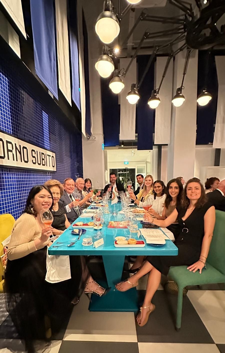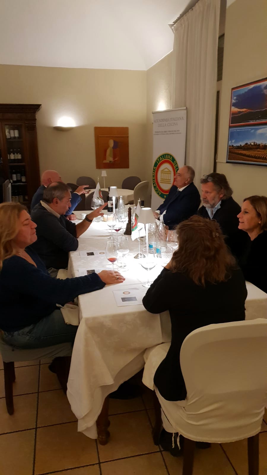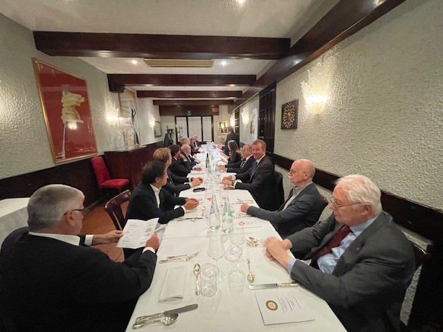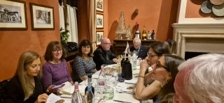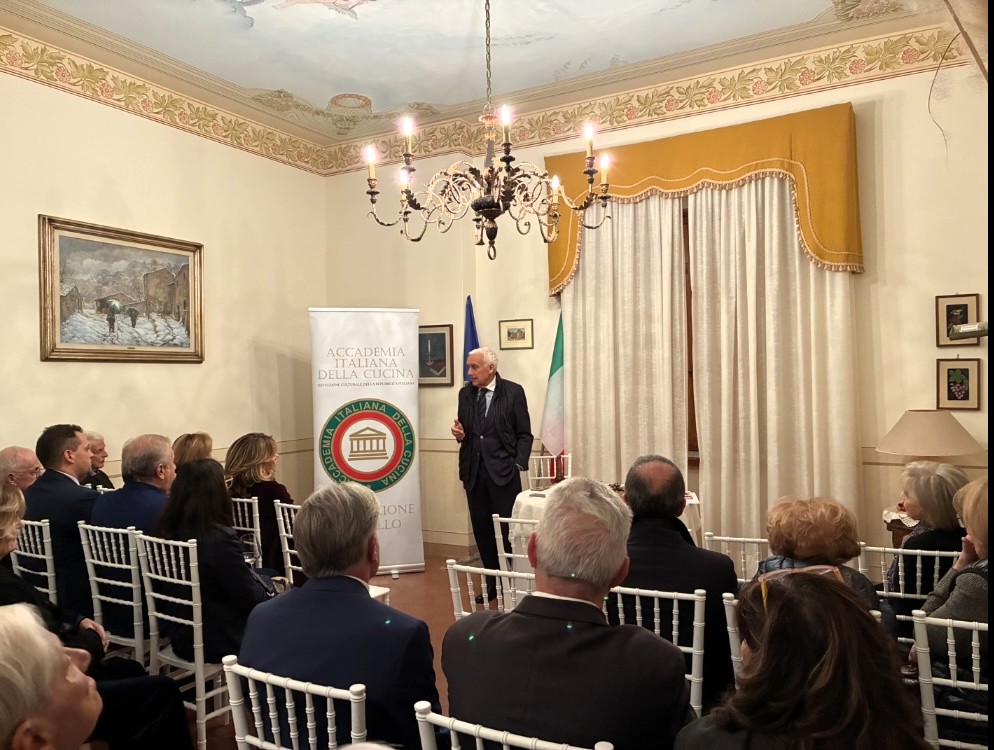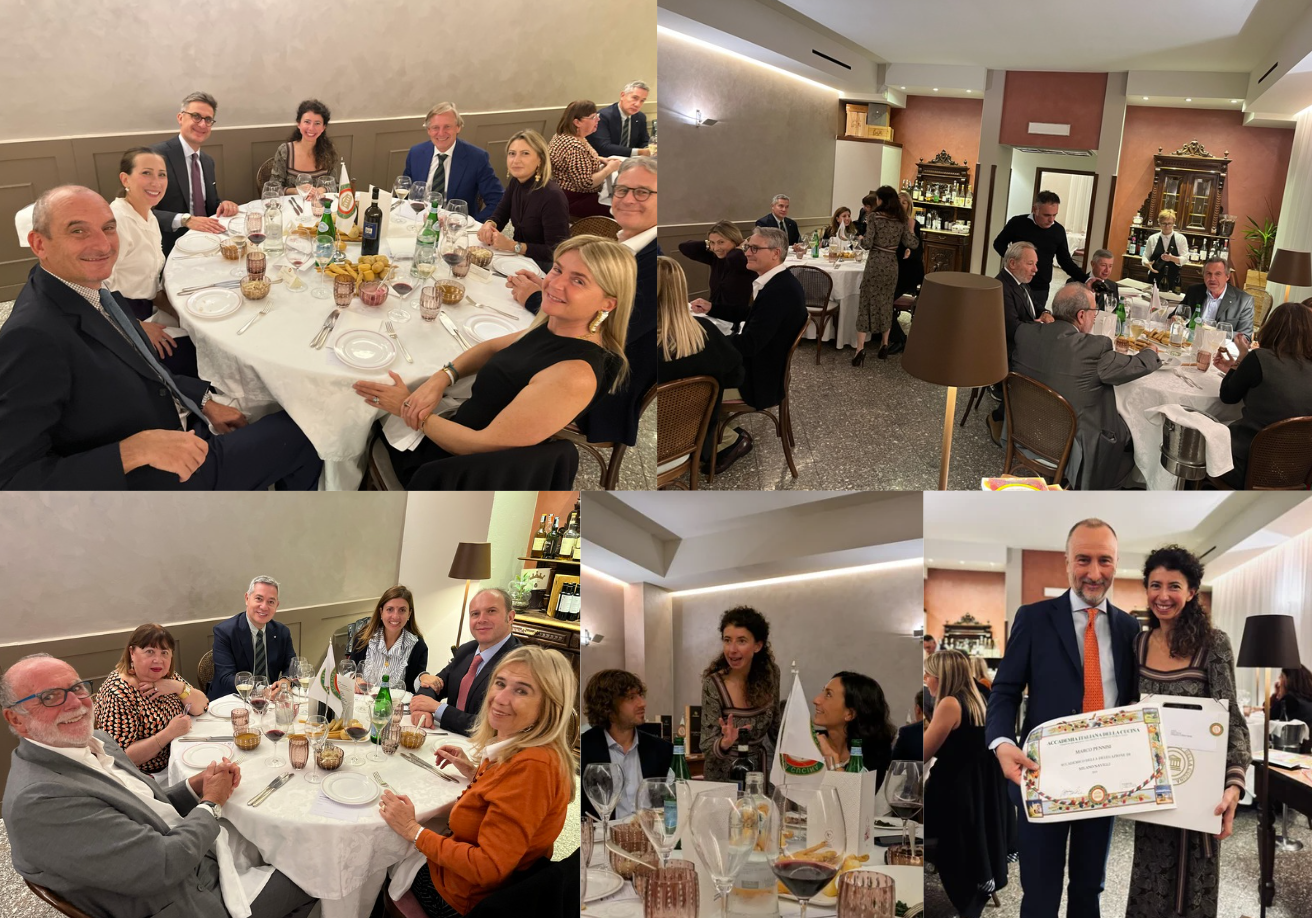 Gli Accademici della Delegazione di Londra e alcuni ospiti, tra cui il Console Generale Domenico Bellantone e consorte, si sono riuniti nei locali della Cantinetta Antinori, ristorante dell’omonima nobile famiglia, per celebrare la Conviviale Ecumenica 2025. Dopo un ricco aperitivo con prodotti tipici toscani, il Delegato ha presentato il volume redatto quest’anno dall’Accademia Italiana della Cucina "Gli Arrosti, Gli Umidi, I Bolliti" illustrando alcune ricette tipiche regionali e la loro evoluzione nel tempo. È stato quindi servito un menu di grande tradizione piemontese e toscana: salumi e formaggi della zona, crostini con pomodorini e basilico; a seguire agnolotti del plin con sugo d’arrosto e arrosto di fesa di manzo, in armonia con il tema della Conviviale, accompagnati da contorni di patate novelle e broccoletti con peperoncino dolce. Entrambi i piatti hanno suscitato commenti entusiasti, così come i cantucci fatti in casa con vin santo. Ottima la selezione dei vini della Cantina Antinori, serviti durante l’aperitivo e la cena. La serata, all’insegna della convivialità e dell’allegria, si è conclusa con un caloroso applauso allo chef Luigi Borelli, al quale il Delegato ha consegnato il piatto ricordo dell’Accademia, e a tutto il personale, nonché alle Simposiarche Silvia Mazzola e Jacqueline McKay per l’impeccabile organizzazione della Cena Ecumenica 2025.