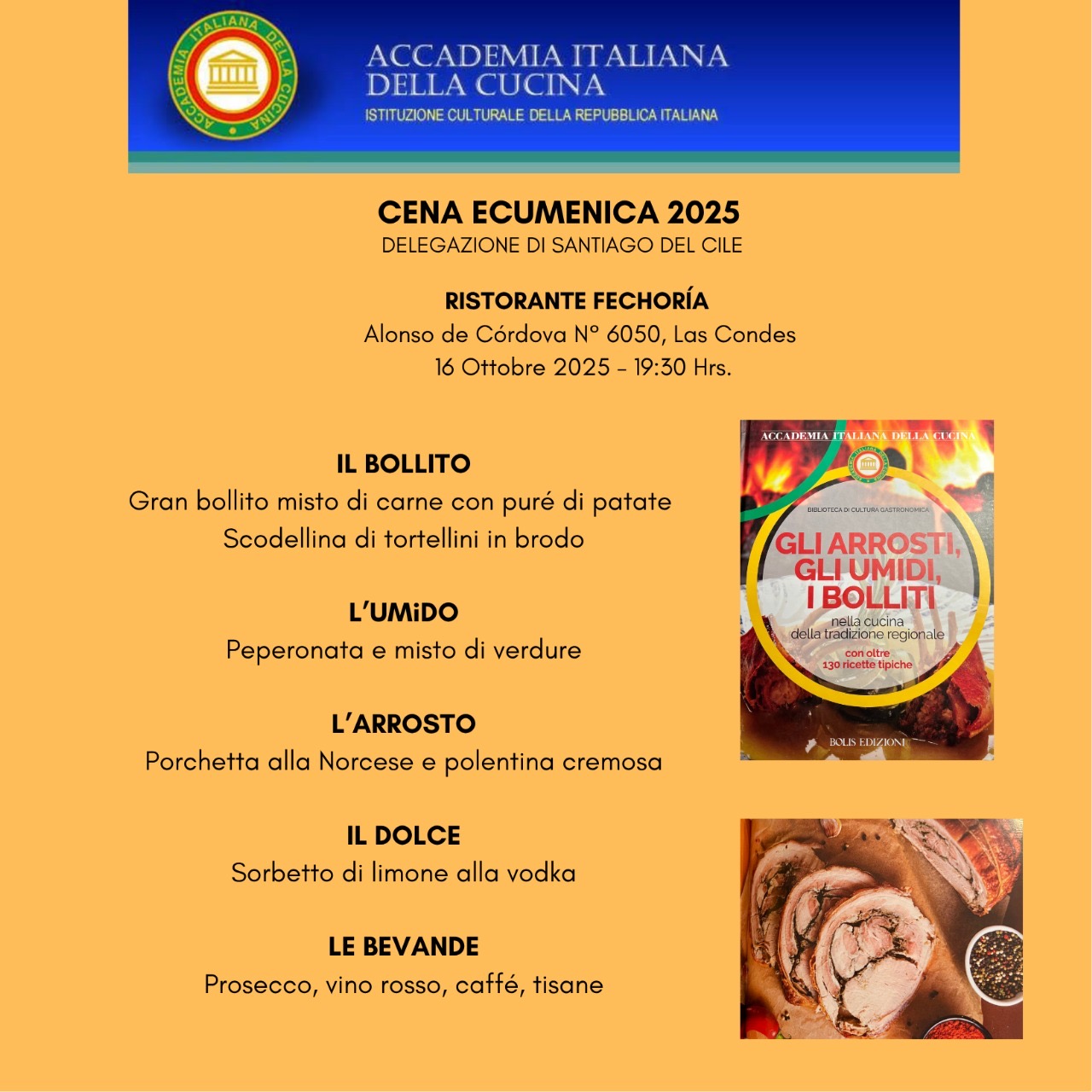 Presso il ristorante "Fechoria" dell’hotel Icon di Santiago del Cile si è tenuta la cena ecumenica, presieduta dal Delegato Alessandro Bizzarri, dalla vice Delegata Floria Orsini, dalla Segretaria Patricia Angelini e dal Tesoriere Enrique Sacchetti. Era presente l’Accademica Onoraria S.E. Valeria Biagiotti, Ambasciatrice d’Italia in Cile, con il marito Andrea Tappi. Il ristorante, aperto dal 2023, è guidato dallo chef Alessandro Tridenti, nato a Chieti e veneziano d’adozione, oggi residente in Cile. Tridenti ha maturato esperienze prestigiose presso la famiglia Cipriani, l’Hotel Posta di Cortina d’Ampezzo e vari ristoranti a Hong Kong e Londra. Il menu proposto (in foto) ha rispettato appieno il tema dell’anno 2025. I piatti sono stati accompagnati da Sauvignon Blanc e Carménère, vitigno tipico cileno. Il Delegato ha ringraziato l’Ambasciatrice per la partecipazione e dato il benvenuto ai nuovi Accademici Marilena Sias e Ginetto Rossi. Durante la serata, l’Accademia Sias ha tenuto una lezione magistrale sul bollito, avviando una vivace conversazione. La cena è stata un vero viaggio nei sapori italiani, dalle Langhe alla pianura Emiliana e al cuore dell’Italia Un’esplosione di sapori ed emozioni: raro trovare, a 13 mila chilometri di distanza, persone e luoghi capaci di soddisfare così eccellentemente il palato di tutti, senza esclusioni.