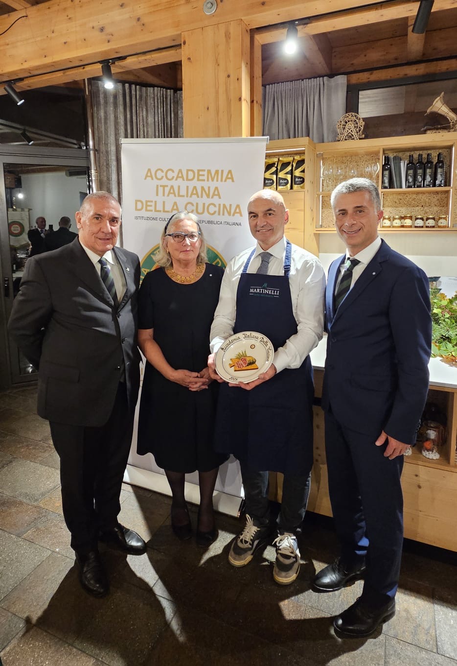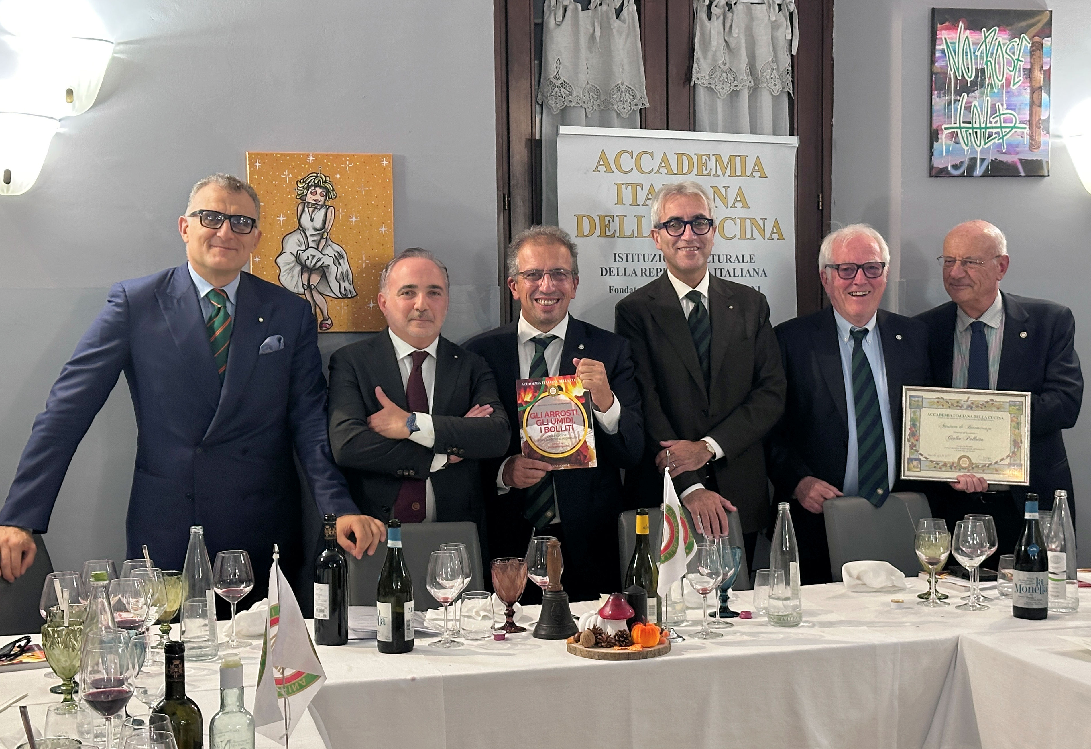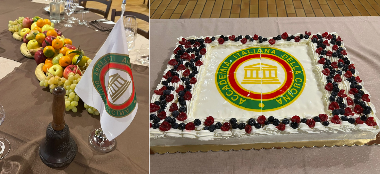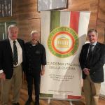 Cena ecumenica al ristorante La Kiuva di Arnad con un menu predisposto dal Simposiarca Cesarino Collé rigorosamente a base del tema della serata: finissima di carne salée con insalata croccante e dressing di noci; bis di pappardelle al ragù di cinghiale e gnocchetti di castagne con fonduta al Bleu d’Aoste; carbonade di manzo cotto allo Chardonnay con polenta; torta di compleanno della Delegazione Monterosa. Al termine della serata, l’Accademico Robert Rosset ha presentato l’edizione 2025 del volume della Biblioteca di Cultura Gastronomica dell’Accademia intitolato “Gli arrosti, gli umidi, i bolliti nella cucina della tradizione regionale”. Oltre alla cena ecumenica gli Accademici hanno festeggiato la ricorrenza dei venti anni della Delegazione Monterosa con una meravigliosa torta preparata per l’occasione da Gloria della pasticceria Gatò di Aosta. Gradito ospite, il Presidente della Regione Valle d’Aosta Renzo Testolin, da sempre amico della Delegazione e dell’Accademia Italiana della Cucina.