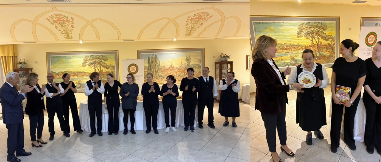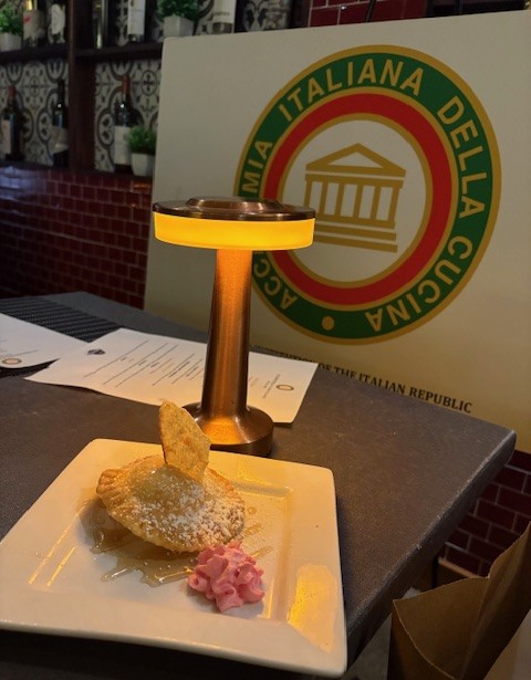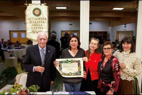 Da anni la Cena ecumenica riempie la sala del ristorante didattico dell’I.S. Pacinotti-Belmesseri di Bagnone, dove Accademici e ospiti hanno degustato un menu ispirato ai piatti vincitori del “10° Premio Accademia Italiana della Cucina – Delegazione della Lunigiana 2025”, preparati dagli allievi guidati dal Prof. Mitola: raffinato antipasto di lingua di manzo con salsa verde, mousse di ricotta e crumble di pane (primo premio), “Ravioli al brasato” (secondo premio), “Agnello in crosta di erbette con crema e spinaci”, e il dessert “Pere e blu, tentazione croccante” (terzo premio). Portate eseguite e presentate con professionalità, sostenute dall’impeccabile servizio degli studenti di sala diretti dal Prof. Barontini. Il Delegato ha ricordato i dieci anni di collaborazione con la Scuola, elogiando la crescita professionale degli allievi; la Vicepresidente Vettori ha ringraziato l’Accademia per le preziose opportunità offerte. Nel corso della serata è stato conferito dal Delegato Tomellini il premio “Giovanni Nuvoletti 2025” a Cinzia Angiolini, figura simbolo della tutela della Pecora e dell’Agnello di razza Zerasca. Emozionata, ha ringraziato e invitato gli studenti a diventare cuochi capaci di valorizzare le tradizioni e le eccellenze del territorio. Un lungo applauso ha chiuso la serata.