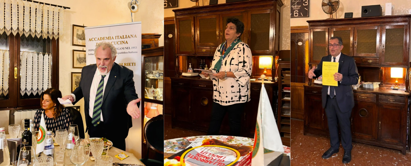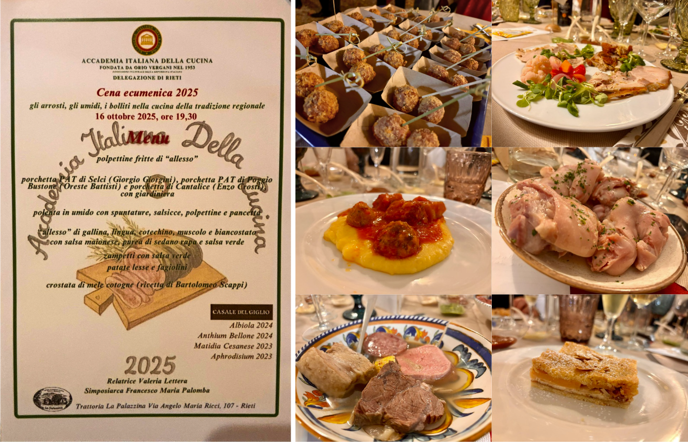 La tradizionale cena ecumenica della Delegazione reatina si è svolta alla trattoria “La Palazzina” di Rieti. Dopo i saluti del Delegato Francesco Maria Palomba e la presentazione del menu nella veste di Simposiarca, l’Accademica Valeria Lettera ha tenuto un intervento culturale. I vini sono stati illustrati da Enrico Maria Concutelli, responsabile di area della Cantina Casale del Giglio. Tra i partecipanti: il Prefetto di Rieti Pinuccia Niglio, il Colonnello Valerio Marra, il Colonnello Gianluca Ferraro e il Dr. Michele Tota, Vice Questore Vicario. Dopo l’aperitivo di polpettine fritte di “allesso”, i partecipanti hanno degustato le porchette PAT di Selci (Giorgio Giorgini), Poggio Bustone (Oreste Battisti) e Cantalice (Enzo Crosti), accompagnate da una giardiniera e da altre preparazioni della chef Oksana Pidhorodetska, eccellente interprete della cucina reatina. Il menù comprendeva polenta in umido con spuntature, salsicce, polpettine e pancetta; “allesso” di gallina, lingua, cotechino, muscolo e biancostato con varie salse; zampetti con salsa verde; patate lesse e fagiolini; e crostata di mele cotogne secondo la ricetta di Bartolomeo Scappi. In abbinamento, i vini di Casale del Giglio.