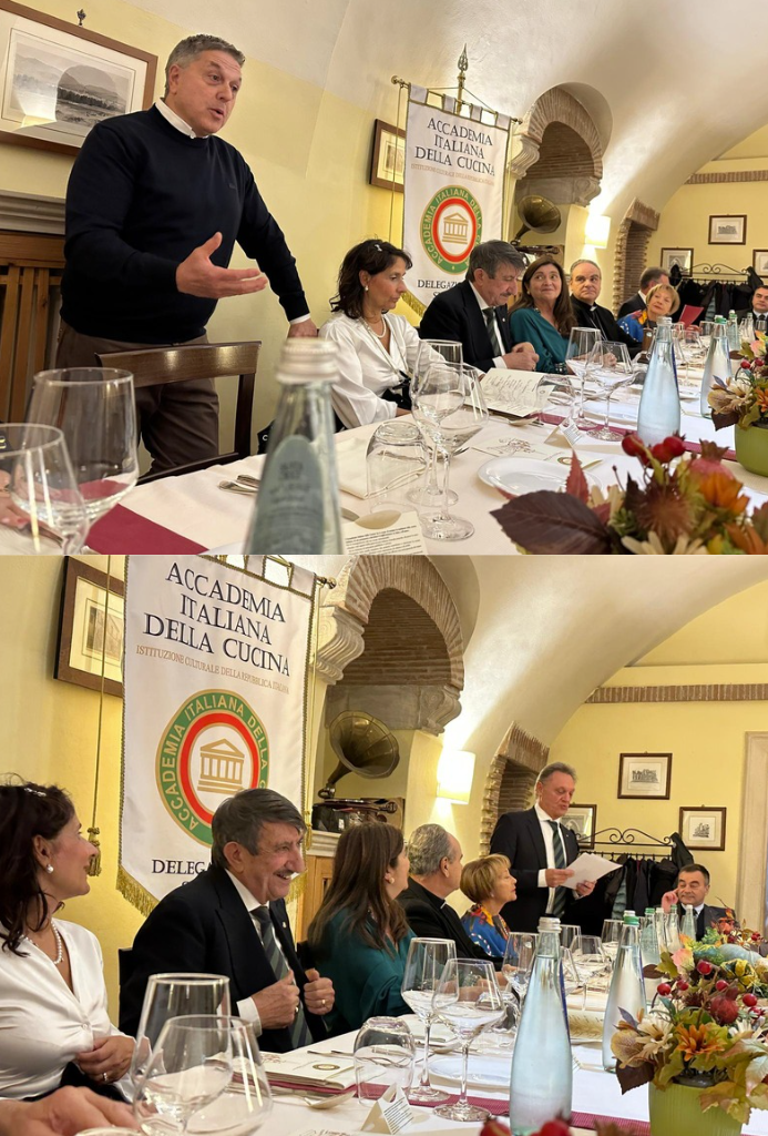 Il tema di quest’anno è stato interpretato dai Simposiarchi della Delegazione di Terni, Federico Carli e Giuseppe Malvetani, con uno sguardo ampio e coraggioso, capace di oltrepassare i confini territoriali per tracciare un percorso che ha attraversato tutto lo Stivale. Il viaggio gastronomico è iniziato con un bollito misto accompagnato da mostarda di Cremona, giardiniera e salsa verde, per poi proseguire con le mezze maniche alla coda alla vaccinara, simbolo del quinto quarto e della cucina popolare, capace di trasformare la necessità in virtù. Il secondo, un piccione ad arrosto morto con broccoletti ripassati, ha riportato il racconto alle radici umbre. Anche il percorso enologico, coerente e narrativo, ha avuto un ruolo centrale, così come l’olio extravergine “Nuovo” dell’Azienda Malvetani, a suggellare il legame con il territorio. Momento di particolare rilievo è stato l’intervento di Giuseppe Fatati, direttore del Centro Studi Territoriale Umbria dell’Accademia, che ha proposto una visione attuale della dieta mediterranea: non uno schema rigido, ma uno stile di vita sostenibile che unisce salute, territorio e comunità. La Cena Ecumenica si è così inserita in un più ampio progetto di valorizzazione della cultura culinaria italiana, arricchito quest’anno dall’ingresso del nuovo Accademico Andrea Carducci e dalla celebrazione dei 40 anni di appartenenza di Giulio Pallotta, esempio di dedizione e passione.