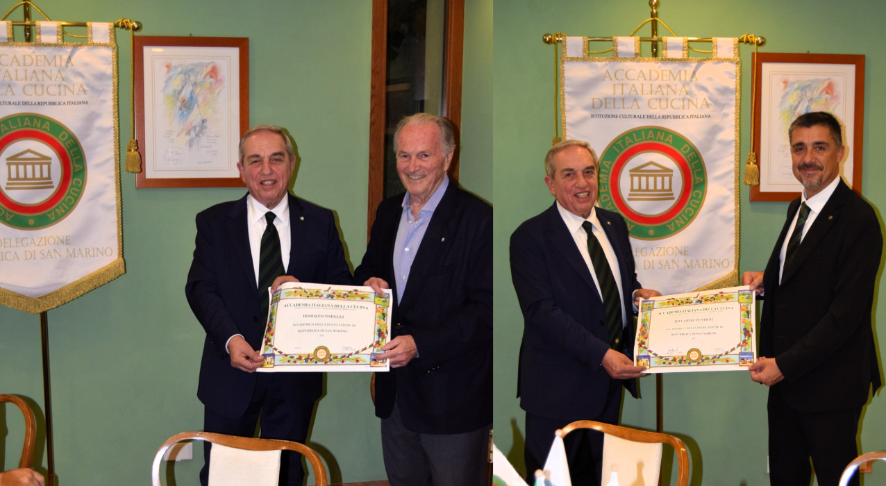 Il Delegato Stefano Valentino Piva ha introdotto la Cena Ecumenica, svoltasi nelle eleganti sale del Ristorante e Hotel Cesare di San Marino, come un momento di incontro e riflessione: non una semplice cena, ma un’occasione di dialogo e valorizzazione della tradizione gastronomica locale, capace di unire storia, cultura e innovazione. ll tema annuale scelto ha richiamato le radici dell’allevamento e della trasformazione dei prodotti della terra, valorizzando la carne come simbolo di civiltà, espressione di una cucina rispettosa dei cicli naturali e del lavoro agricolo. Arrosti, bolliti e carni in umido evocano la convivialità familiare e la sapienza delle antiche cucine domestiche. Il tema dell'anno è stato presentato dal Simposiarca Cesare Tabarrini e dallo Chef Graziano Canarezza. Il menu, frutto di ricerca e rispetto per il territorio, ha proposto piatti eseguiti con materie prime locali: insalata di spinaci con lingua e cotechino, mostarda di pere e pomodori verdi marinati; cappelletti al sugo di arrosto con polentina e guancia di vitello; arrosto di faraona ai funghi spontanei e coniglio in porchetta. Per concludere, una crema al cioccolato bianco e mascarpone con castagne, accompagnata dai vini della Cantina di San Marino. La serata, impreziosita dal conferimento delle insegne ai nuovi Accademico Rodolfo Torelli e Riccardo Fantoni, si è chiusa con il suono della campana, in un clima di convivialità e cultura gastronomica.