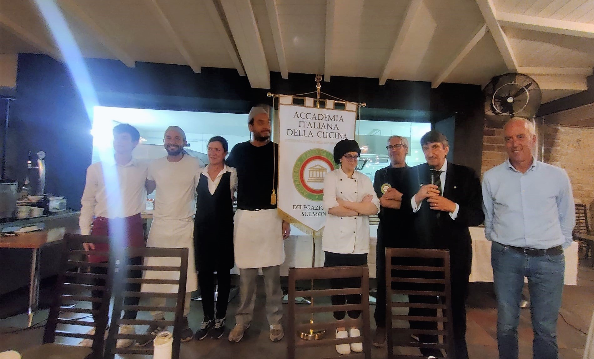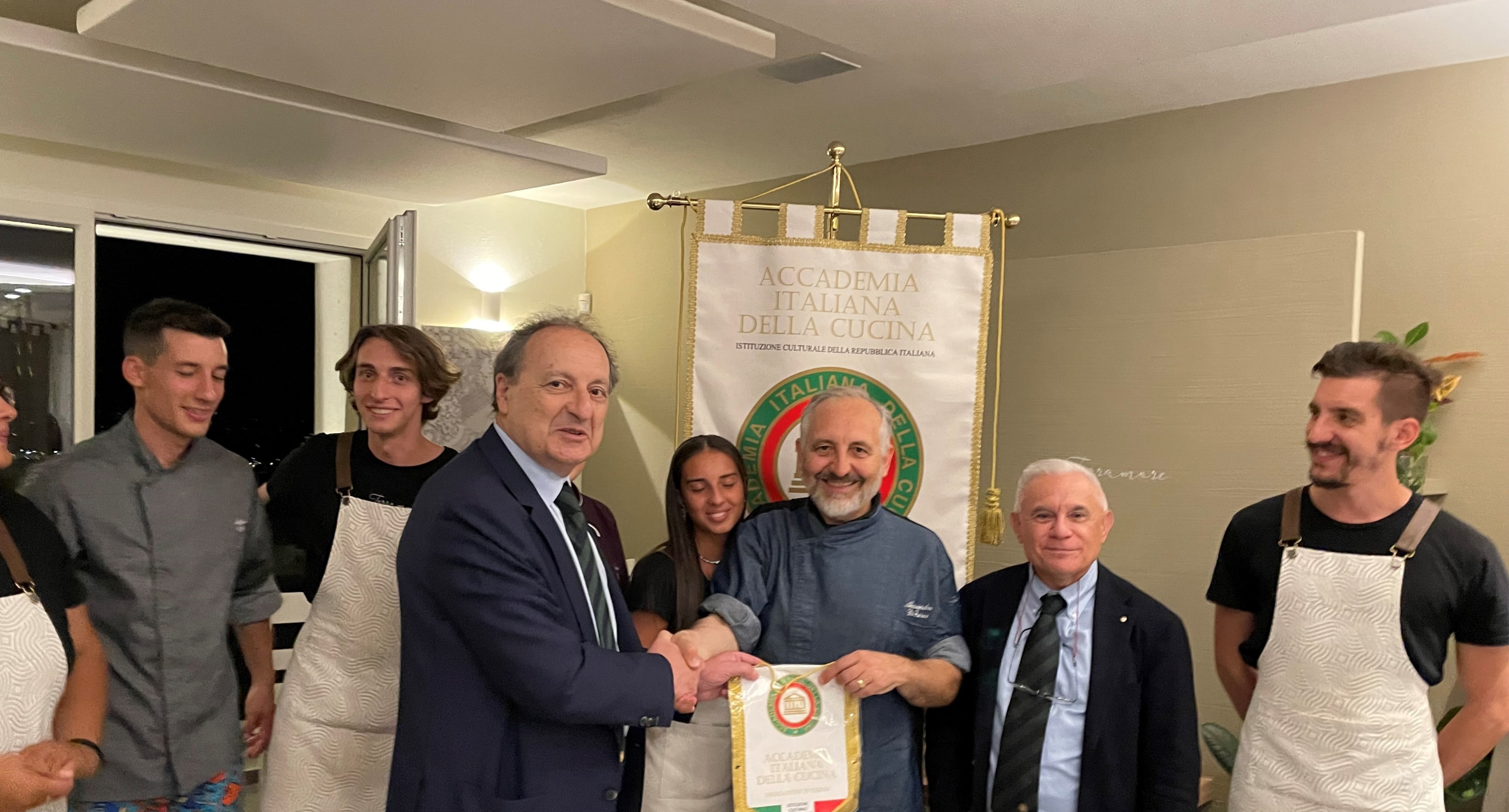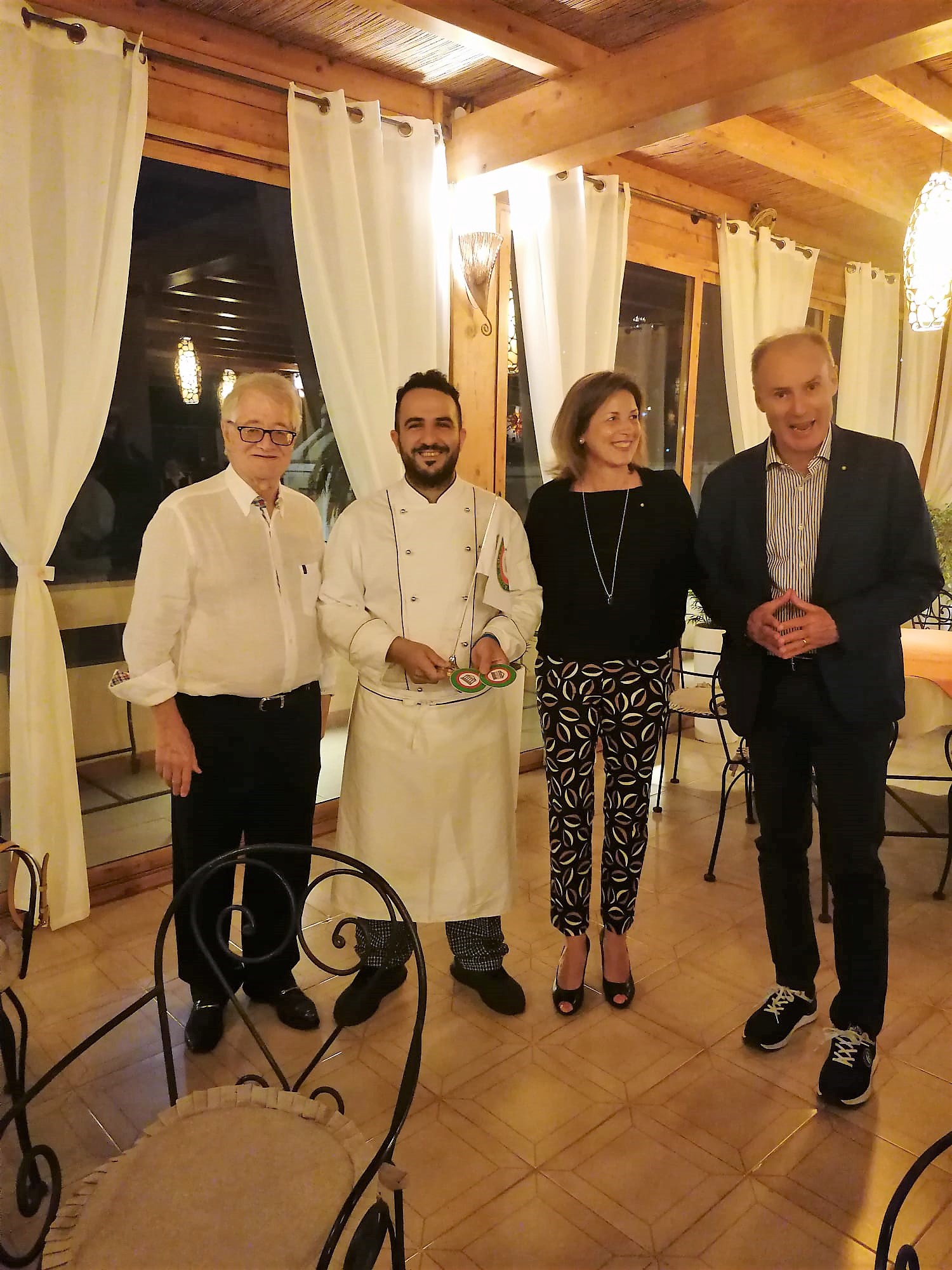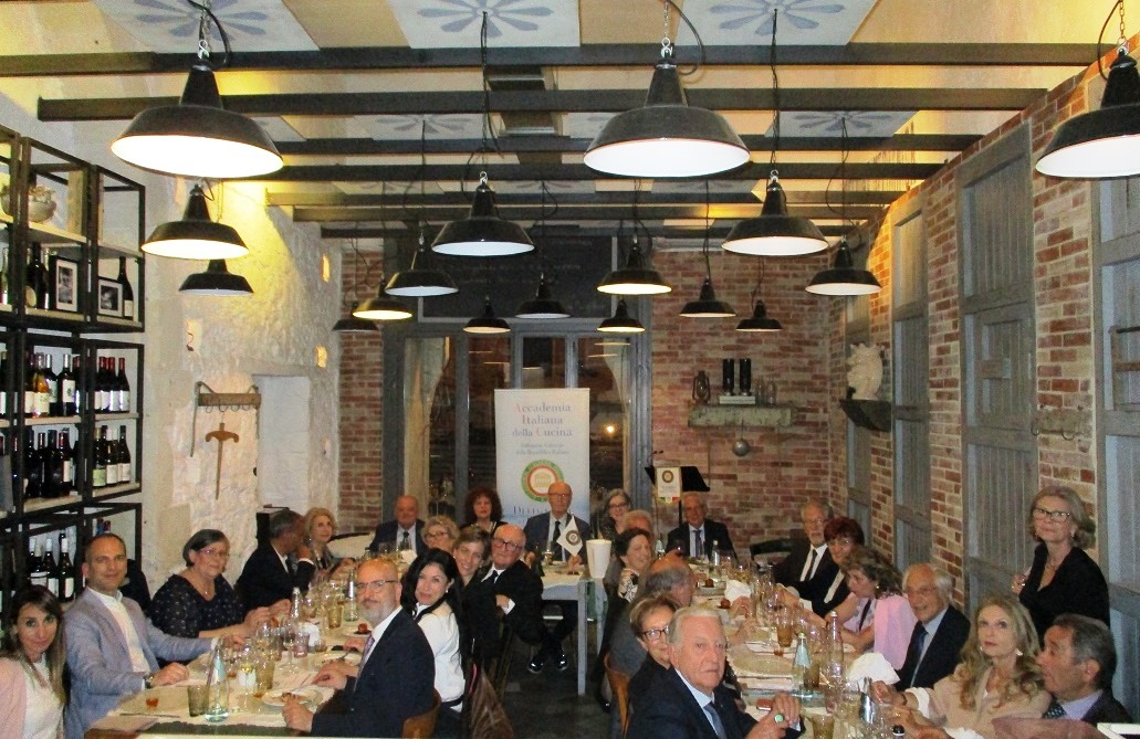 In una serata molto piacevole che ha riscosso un alto gradimento, la Delegazione ha visitato il ristorante “La Terrazza” dell’Hotel Filadelfia. La Vice Delegata Cettina Berenati, con la collaborazione di Romeo Palamara, ha splendidamente condotto la Delegazione alla scoperta di uno sfizioso e gustosissimo menu che ha soddisfatto i presenti: portate mai banali, concrete, con gusti ben distinti e cotture appropriate hanno messo in risalto i prodotti del territorio e le capacità dello chef Aurelio D’ambra che ha saputo sapientemente rivisitare l'anima “eoliana” dei piatti proposti con un tocco di innovazione, coniugando creatività e rispetto della tradizione. Ottimi gli antipasti, sublime il turbante di spigola con ripieno eoliano (pangrattato, scagliette di mandorle di Avola, olive, pesce spada tritato e pomodorino fresco) in salsa di cozze. Eccellente il dessert: mini-tortino al limone. Una serata, quindi, pienamente riuscita grazie anche all'ottima accoglienza. È stata molto apprezzata anche la mise en place e la gentilezza del servizio puntualmente accompagnato da una esauriente spiegazione dei piatti. Anche l'affluenza degli Accademici ha contribuito favorendo la conversazione e la convivialità. Infine la consegna del guidoncino e della vetrofania dell’Accademia allo staff di cucina e di sala con un lungo applauso di gradimento dei presenti.
