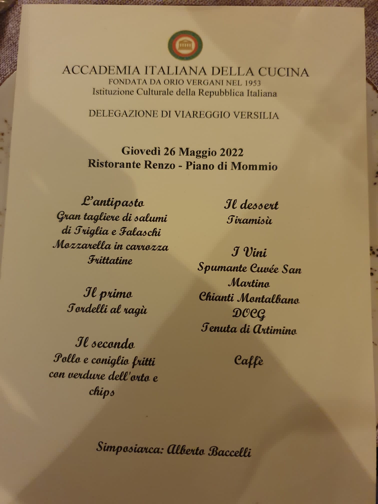 Una serata all'insegna di piatti tradizionali della ristorazione apuana organizzata dalla Delegazione londinese presso il ristorante “Il trillo” che ha proposto piatti con un giusto equilibrio tra carne e pesce e un ottimo mix fra raffinatezza e costume locale. Il menu, un anticipo della cena ecumenica che l’Accademia celebra nel mese di ottobre: baccalà, lardo, verdure, tagliolini, polletto, torta di riso, piatti semplici ma ricchi di sapori, tradizioni ed emozioni. Il tutto cucinato da Andreina Riccardi, madre dei proprietari, arrivata appositamente dal ristorante di Massa. Ad eccezioni del prosecco, sono stati serviti vini di produzione propria. Un grande applauso al Simposiarca Filippo Tenderini che ha voluto rendere omaggio alla cara mamma con ricette che ricordano la sua infanzia.
