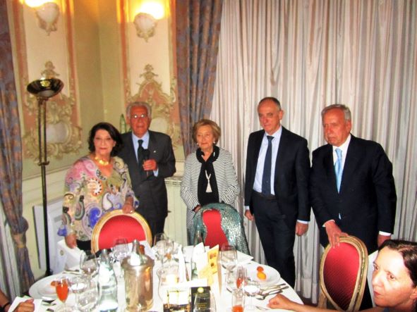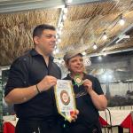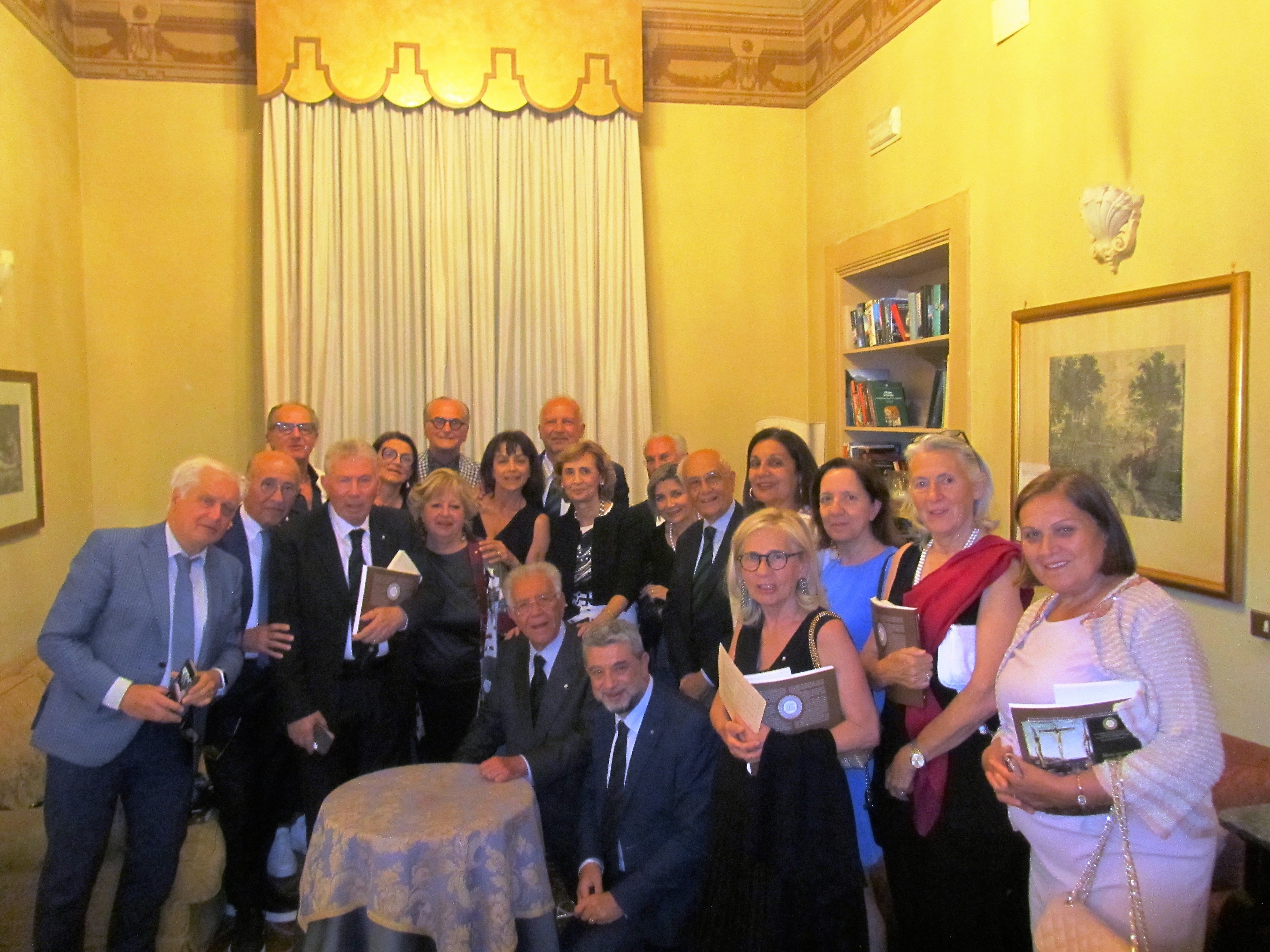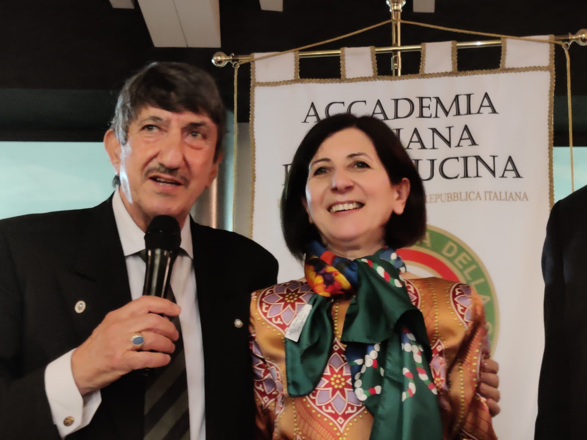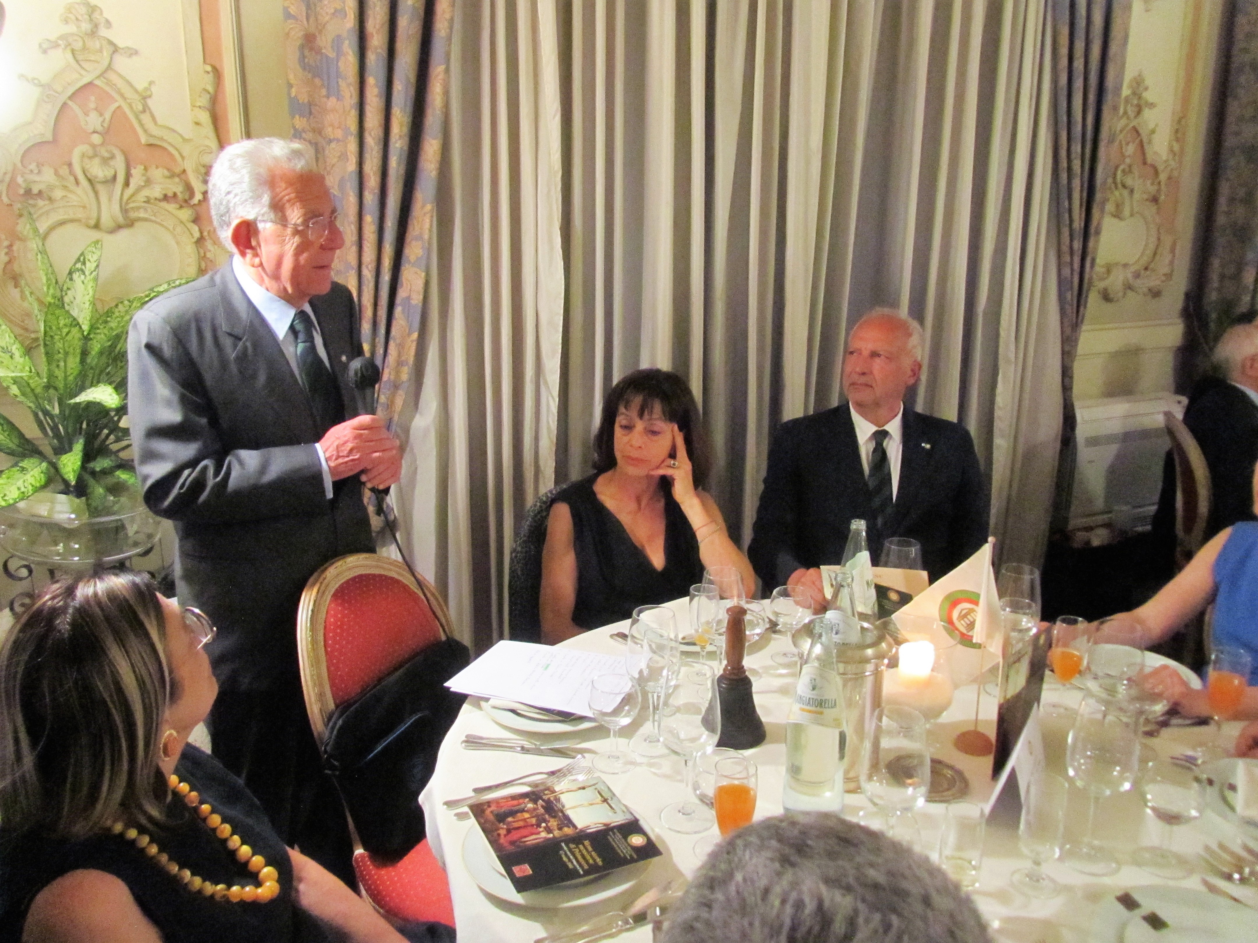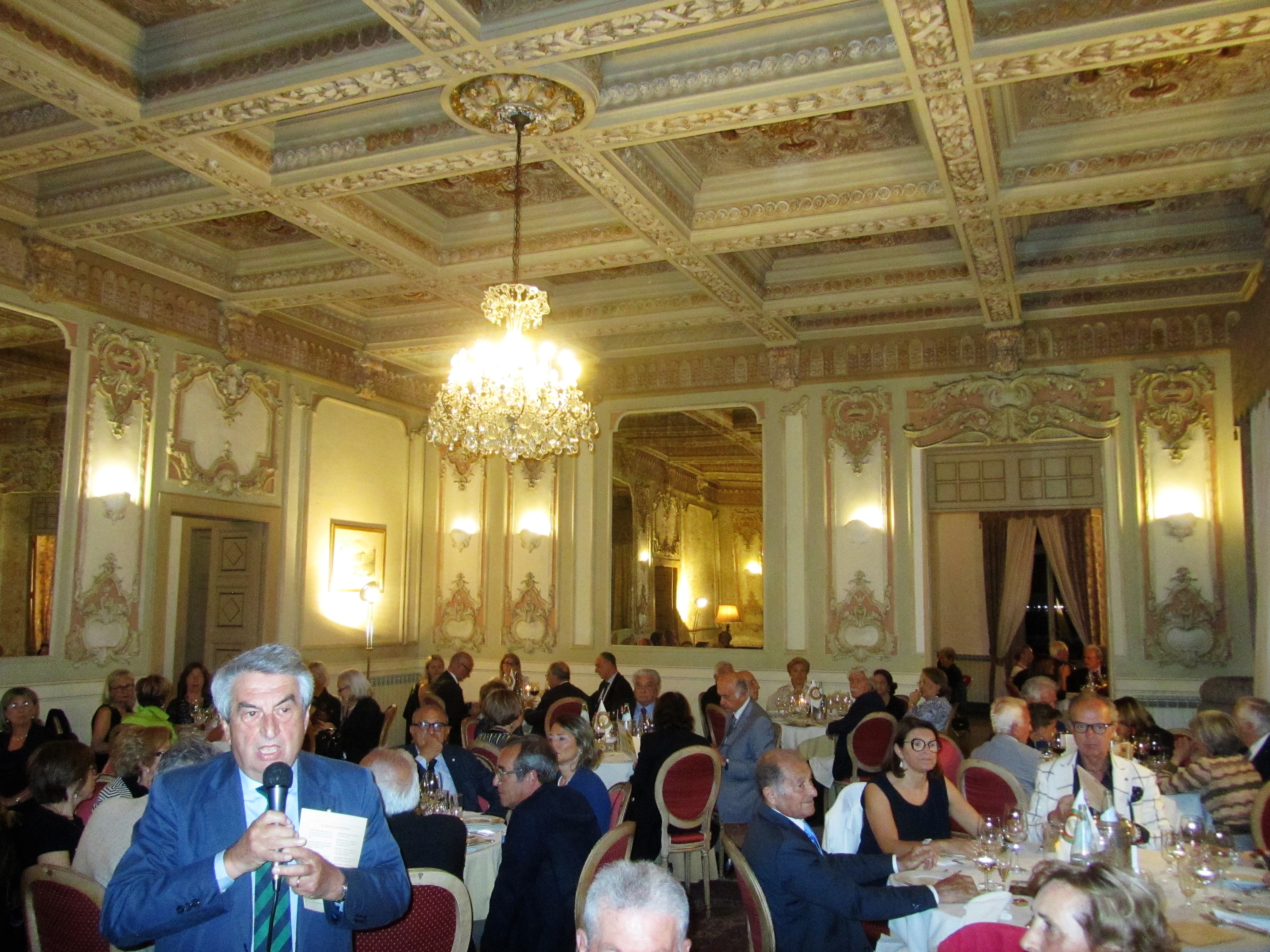 Gradita visita della Delegazione di Fermo ospitata dalla Delegazione messinese presso l’associazione “Il Circolo”. Il Delegato (Foto 1), dopo il caloroso benvenuto al Delegato Fabio Torresi e agli amici Accademici fermani (fra i quali era presente Cristofaro La Corte, già Questore di Messina), ha illustrato il menu, filologicamente basato sulla carta di un ristorante messinese del 1902. È stato il Simposiarca Attilio Borda Bossana, Consultore e Direttore del Centro Studi della Sicilia Orientale, a rappresentare ai numerosissimi commensali nel sontuoso salone d’epoca (Foto 2), l’ultra secolare storia delle pietanze servite, facendo anche riferimento al suo libro “Il Cibo Italiano negli Stati Uniti”, edito dalla Delegazione. Il Delegato ha quindi consegnato il materiale associativo ad alcuni dei nuovi Accademici (Foto 3, da sinistra Emilia Ciriaco, Marisa Renda, Natale Naccari e Luigi Hyerace). Unanime l’apprezzamento manifestato allo chef Massimiliano Usbergo e alla sua squadra di cucina e di sala da parte di tutti gli Accademici e dagli Accademici marchigiani, festosamente ritratti nella foto 4.