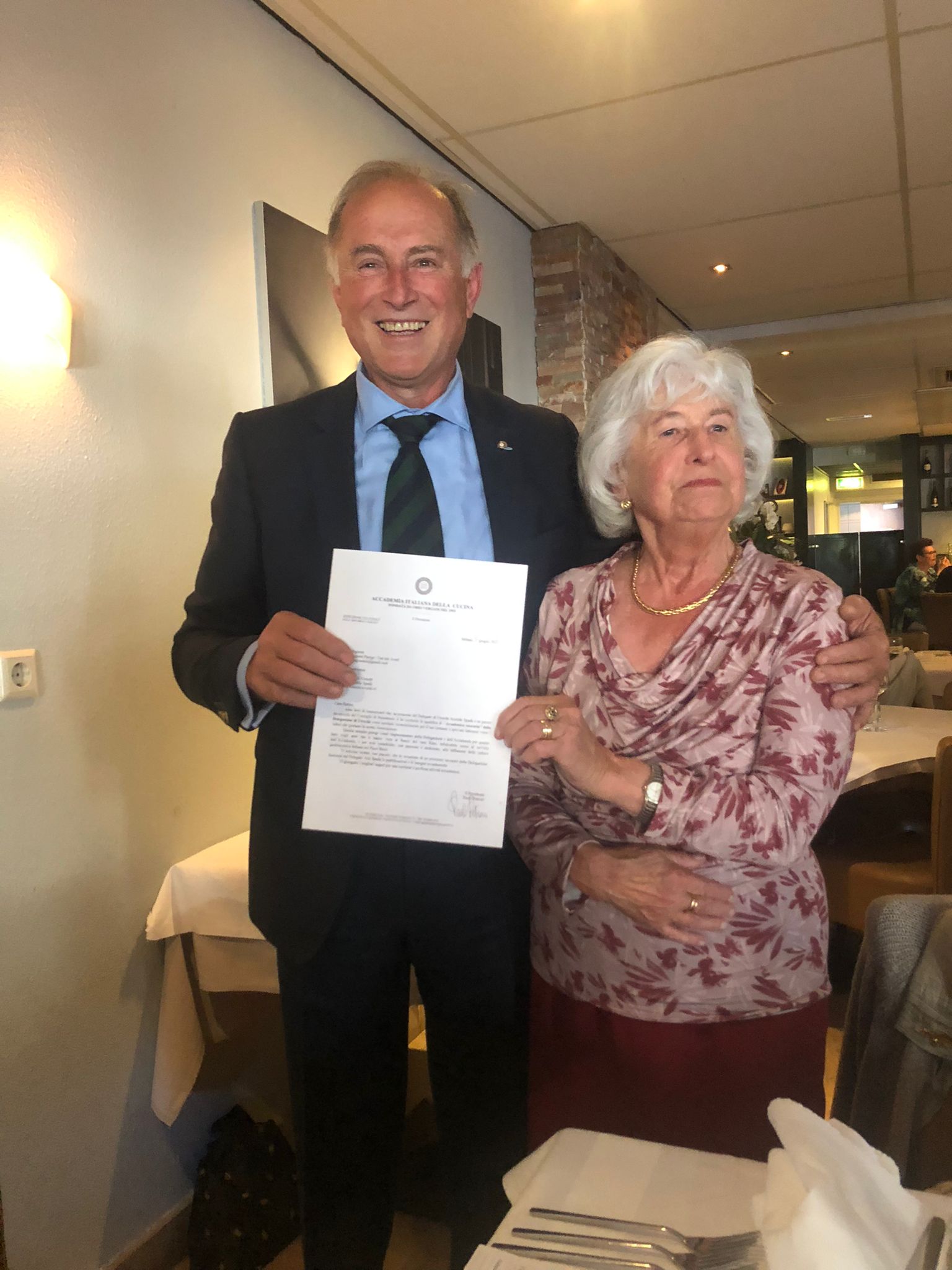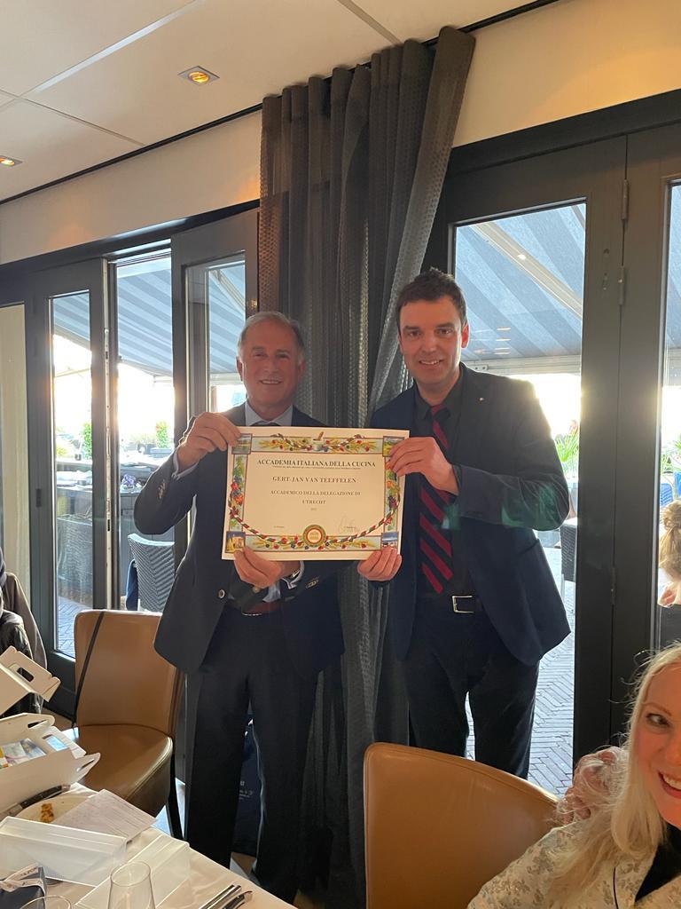 Nuovo appuntamento della Delegazione di Utrecht nel ristorante "Da Claudio" a Huissen sotto la guida del Simposiarca Luca Consoli anche in occasione della ricorrenza della scomparsa, poco più di un anno fa, del fondatore Luca Feboli. La figlia Andrea in sala e lo chef Raphael Renjaan (genero del compianto Feboli) offrono ai commensali un benvenuto caloroso e si impegnano al massimo per proporre un servizio e un livello di cucina al passo del loro padre e maestro. Per gli Accademici, In apertura, uno squisito tramezzino e un ottimo carpaccio di polipo seguiti da saporiti ravioli agli scampi cotti alla perfezione così come anche la migliore portata della serata, il Falsumagru, veramente eccellente. A chiudere, un tris di dolci fatti in casa. Un punto di merito ai vini, proposti in un riuscito abbinamento. La serata è stata allietata dalla investitura del nuovo Accademico Gert-Jan van Teeffelen (in foto 1 con il Delegato Aristide Spada) e l’annuncio della nomina ad Accademica onoraria per la signora Enrica van der Avort- Panigo (foto 2).