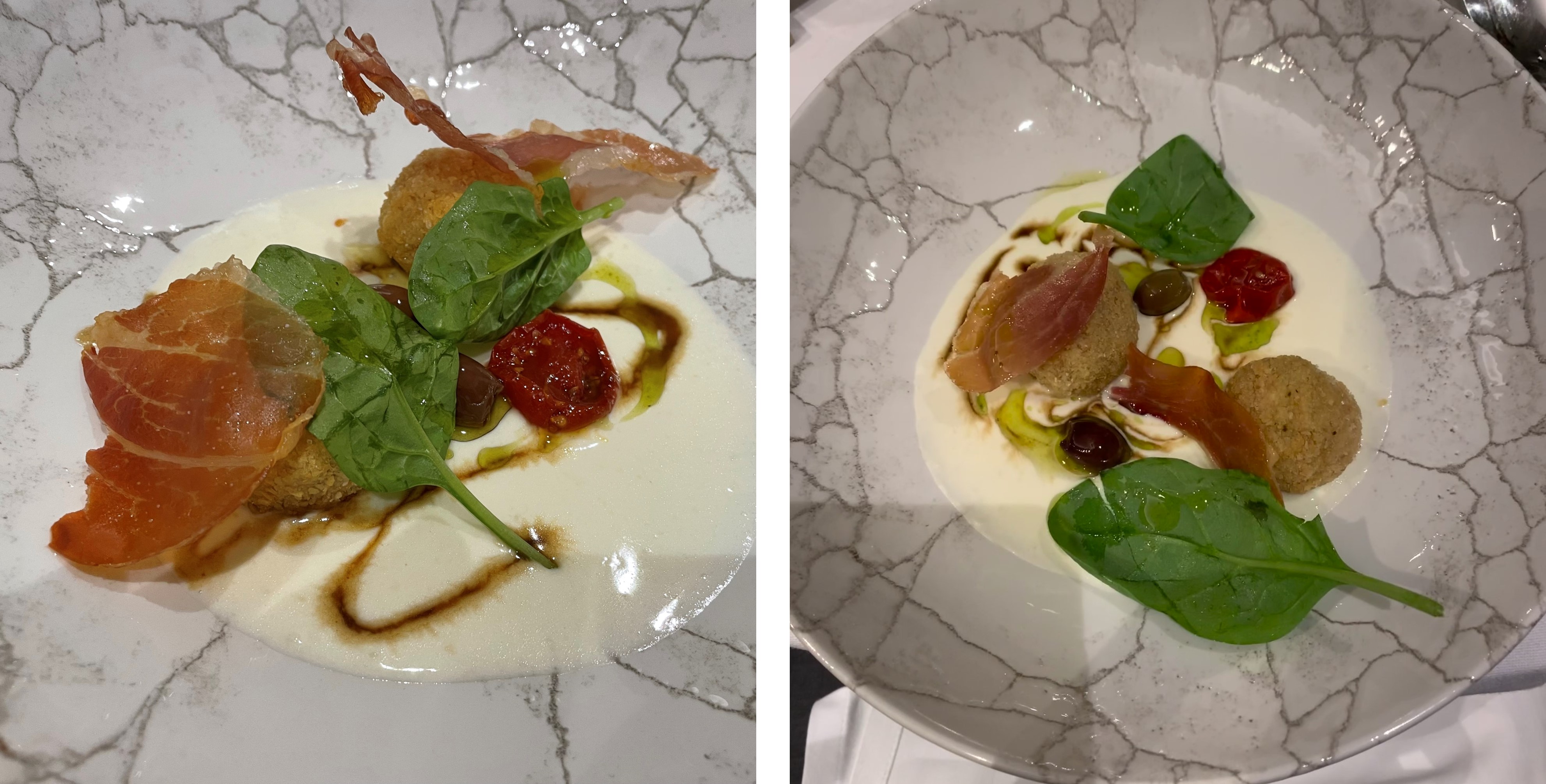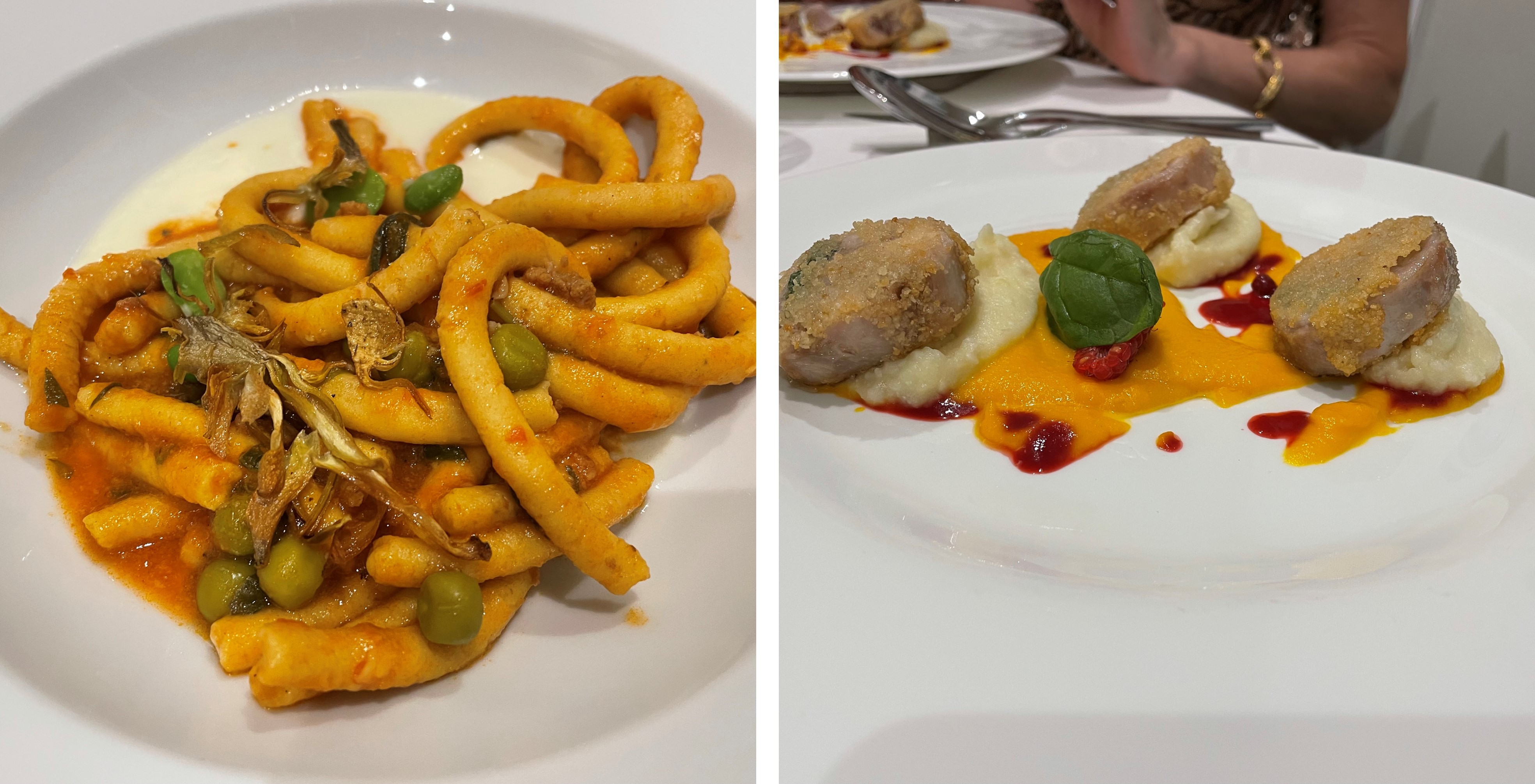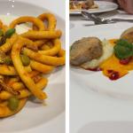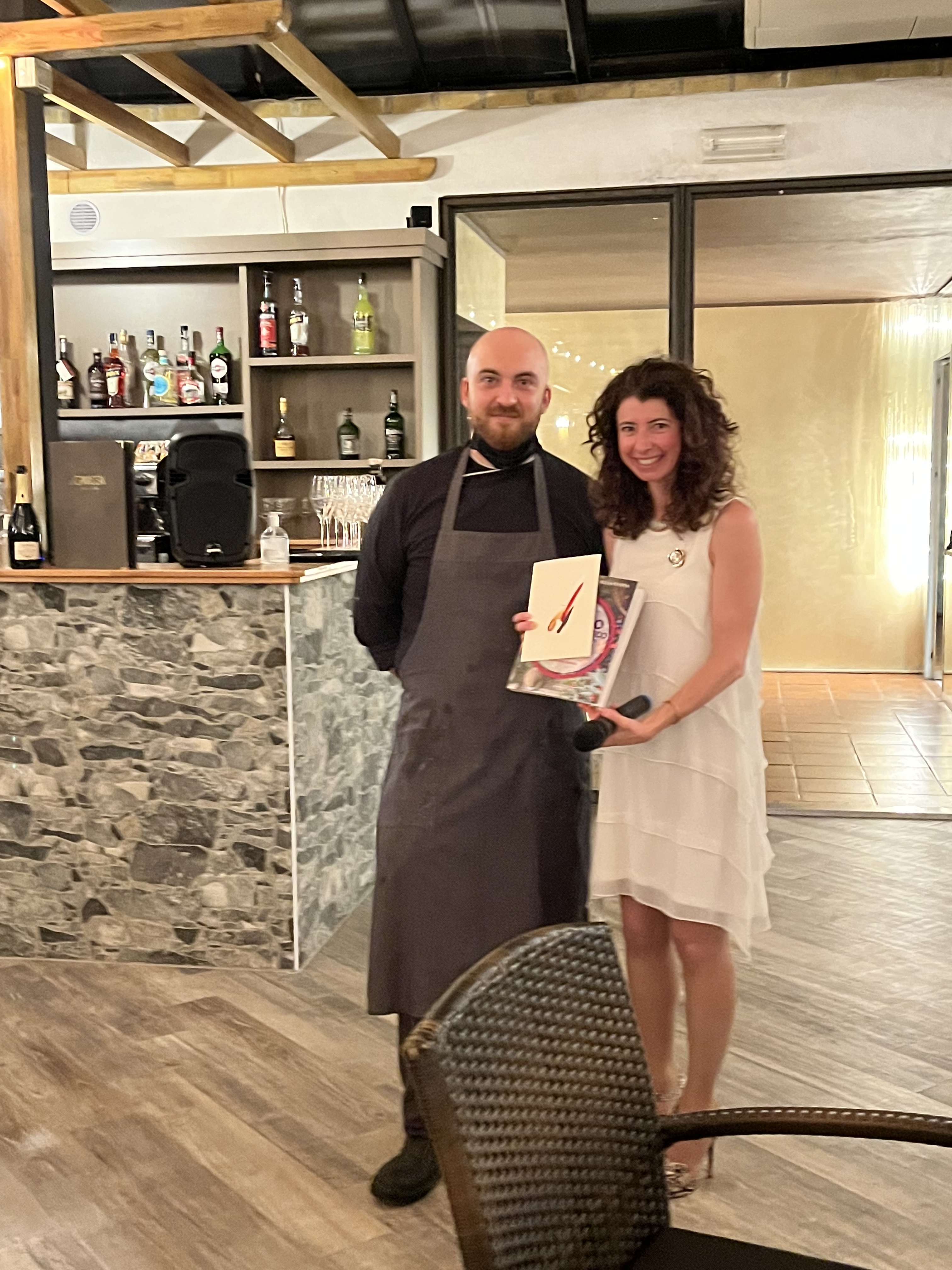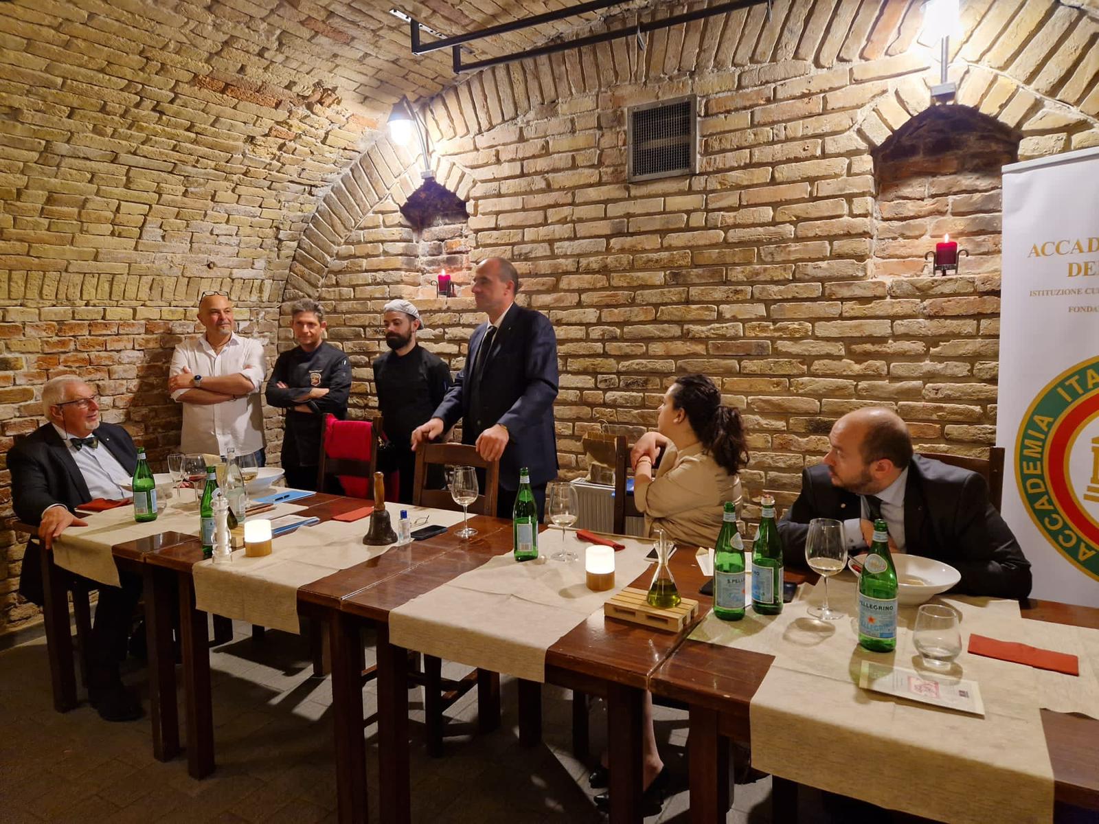 Per la riunione conviviale di giugno la Delegazione si è data appuntamento presso il ristorante agriturismo Terramare di Calisese, sulle prime colline di Cesena. Purtroppo, le sfavorevoli condizioni meteo non hanno consentito lo svolgimento del convivio all’aperto nella splendida terrazza panoramica. Per l’occasione, il Simposiarca Fabrizio Magrone ha proposto un interessante menu di terra, con piatti curati e ben presentati. Dopo un assaggio di benvenuto e l’antipasto “Umami”, tuorlo in tre cotture con crema di parmigiano, spinaci e olive taggiasche (Foto 3), sono stati serviti i passatelli asciutti con crema di pecorino, stridoli, carciofi fritti, fave, piselli e salsiccia e, di seguito, il coniglio ripieno alle erbe di campo, fritto e servito su crema di mandorle e caviale di lamponi (Foto 4). Nel corso della serata, il Delegato ha consegnato il diploma per i 25 anni di appartenenza all’accademica Ariella Severi Zani (Foto 1). La serata si è conclusa con la consegna del guidoncino della Delegazione allo chef Alessandro Di Furia e ai giovani componenti della brigata di cucina e del personale di sala (Foto 2).