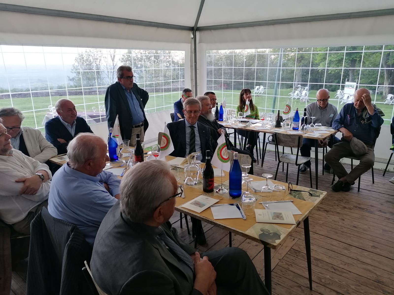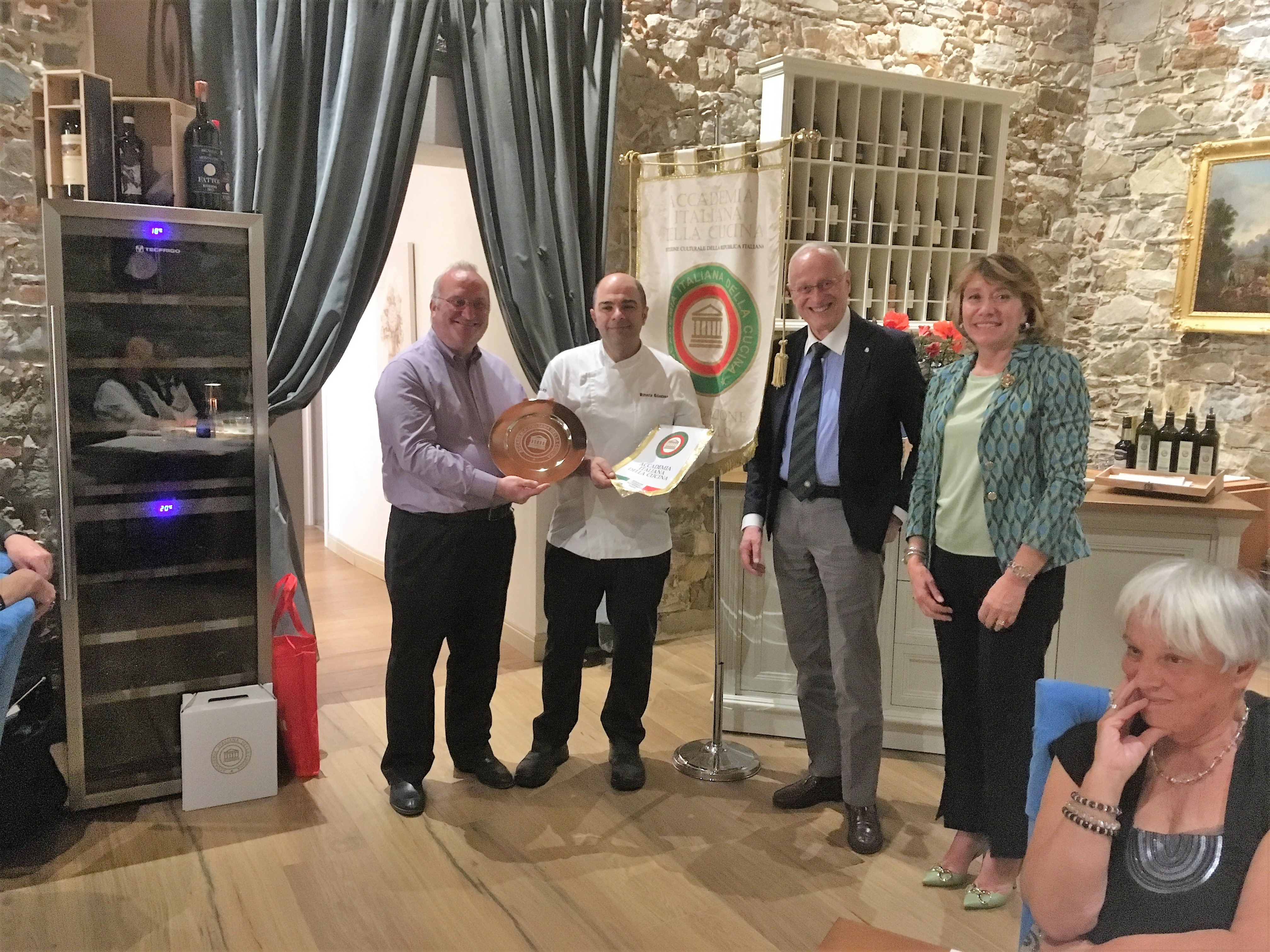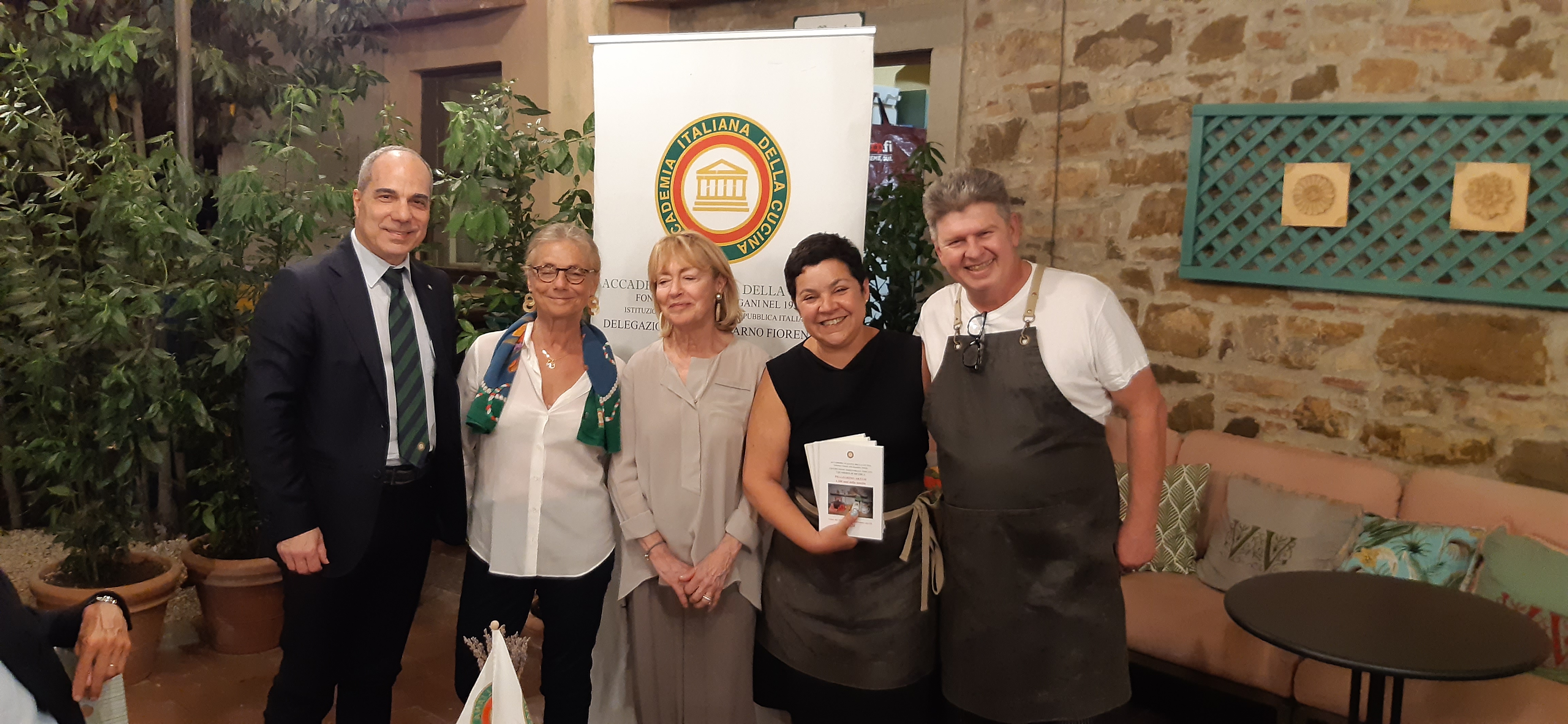 La Delegazione del Valdarno Fiorentino si è riunita presso il ristorante Il Vescovino a Panzano in Chianti. Il clima mite ha favorito la conviviale all'aperto, su una terrazza panoramica e in un contesto incantevole. I Simposiarchi Assia Olivieri e Paola Mainardi, con lo chef Sergio Roncaratti, hanno preparato un menu veramente gustoso, a partire da una delicata tartare di melanzane, condita con miele, lamponi, finocchietto e menta, proseguendo con deliziosi pici all'aglione, pollo del Valdarno o bavetta di manzo allo spiedo e finendo con un ottimo tiramisù (foto 2-3-4). Durante la serata il Delegato Sandro Fusari ha illustrato agli Accademici le principali novità in merito alla recente approvazione del nuovo Statuto e i Simposiarchi, coadiuvati dai proprietari e gestori del ristorante, Renata e Sergio Roncaratti, hanno raccontato, con dovizia di particolari e contagioso entusiasmo, i prodotti utilizzati, le ricette seguite, i piatti serviti e la storia del locale. I prodotti utilizzati sono tutti del territorio, l'abbinamento dei vini equilibrato, la cortesia e la disponibilità dei gestori a raccontare la loro esperienza è stata molto apprezzata. Al termine della serata sono stati consegnati a Renata e Sergio Roncaratti alcuni volumi dell'Accademia (foto 1).