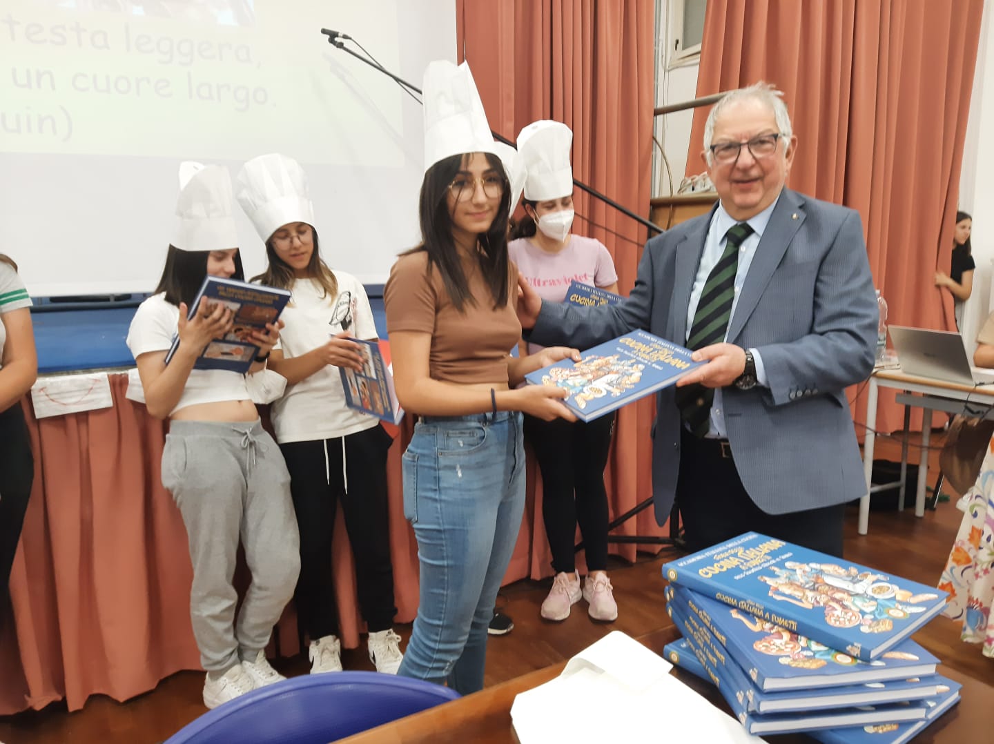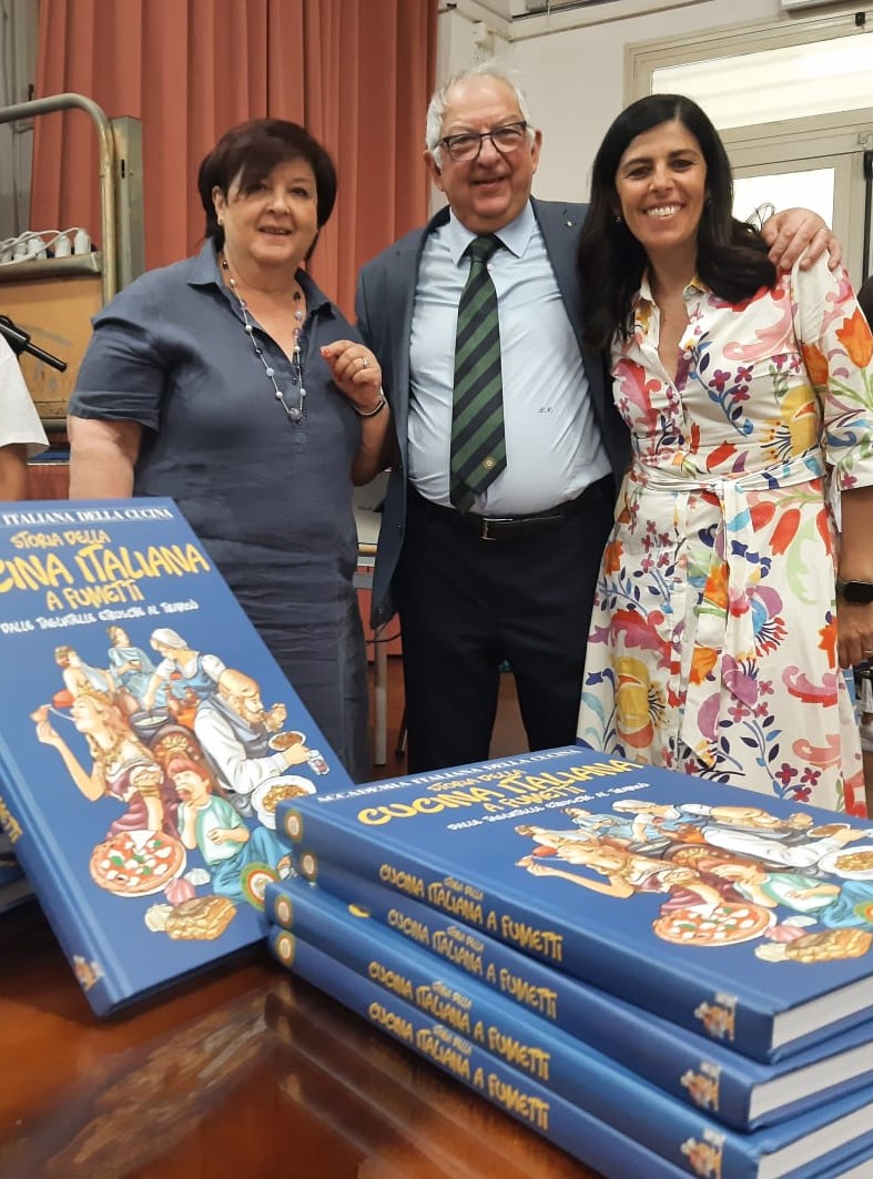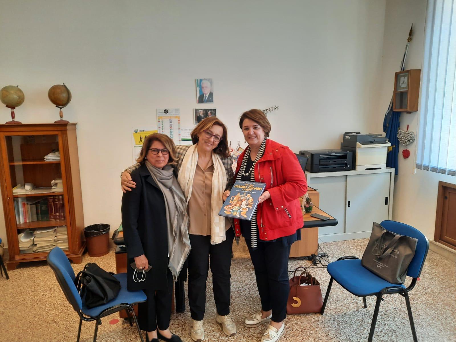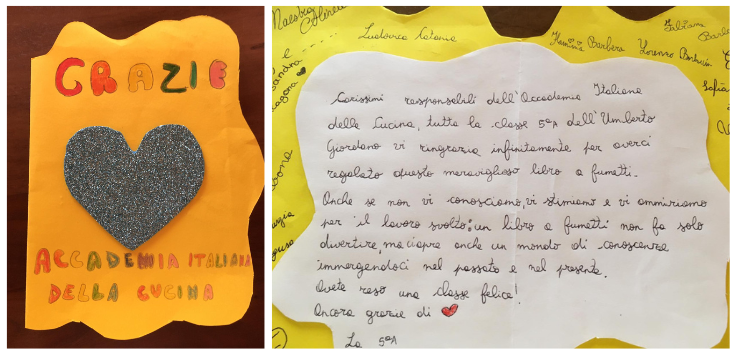 La gioia negli occhi dei bambini, emozionati ed incuriositi dal libro a fumetti sulla Storia della Cucina Italiana che hanno ricevuto in dono dalla Delegazione di Palermo. I bambini sono gli alunni delle classi quinte della scuola Umberto Giordano di Palermo che, sapientemente guidati dalle loro insegnanti, hanno iniziato questo viaggio attraverso le civiltà del passato: Etruschi, Arabi, Romani, i loro cibi, le usanze, i costumi, il linguaggio, origini e valenza multietnica della cucina italiana; i piatti tipici palermitani, i cibi provenienti dalla Americhe come la patata e la fava di cacao. Attraverso alcuni lapbook da loro progettati e realizzati (foto 1-2), hanno visivamente sintetizzato con immagini e testi, ciò che hanno appreso. Una emozionante dedica di gratitudine per questa opportunità è stata rivolta ai responsabili dell’Accademia “perché un libro a fumetti non solo fa divertire, ma apre anche un mondo di conoscenze” (foto 3). I ringraziamenti della Delegazione ai bambini per l’entusiasmo con cui hanno lavorato e alle loro insegnanti, in particolare alla maestra Maria Rosa Marino che ha guidato i bambini con passione e alla Preside Vincenza Piscitello che ha creduto, fin da subito, in questo progetto (in foto 4 con la Delegata di Palermo Daniela Nifosì).
