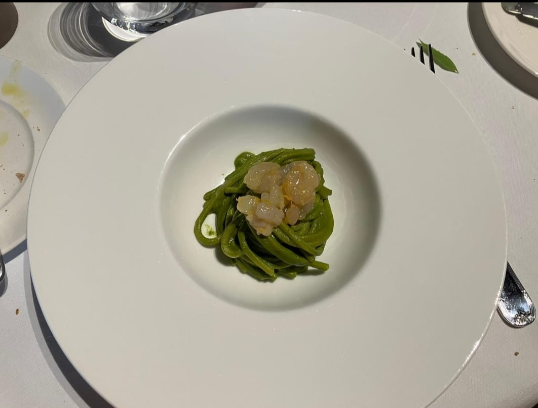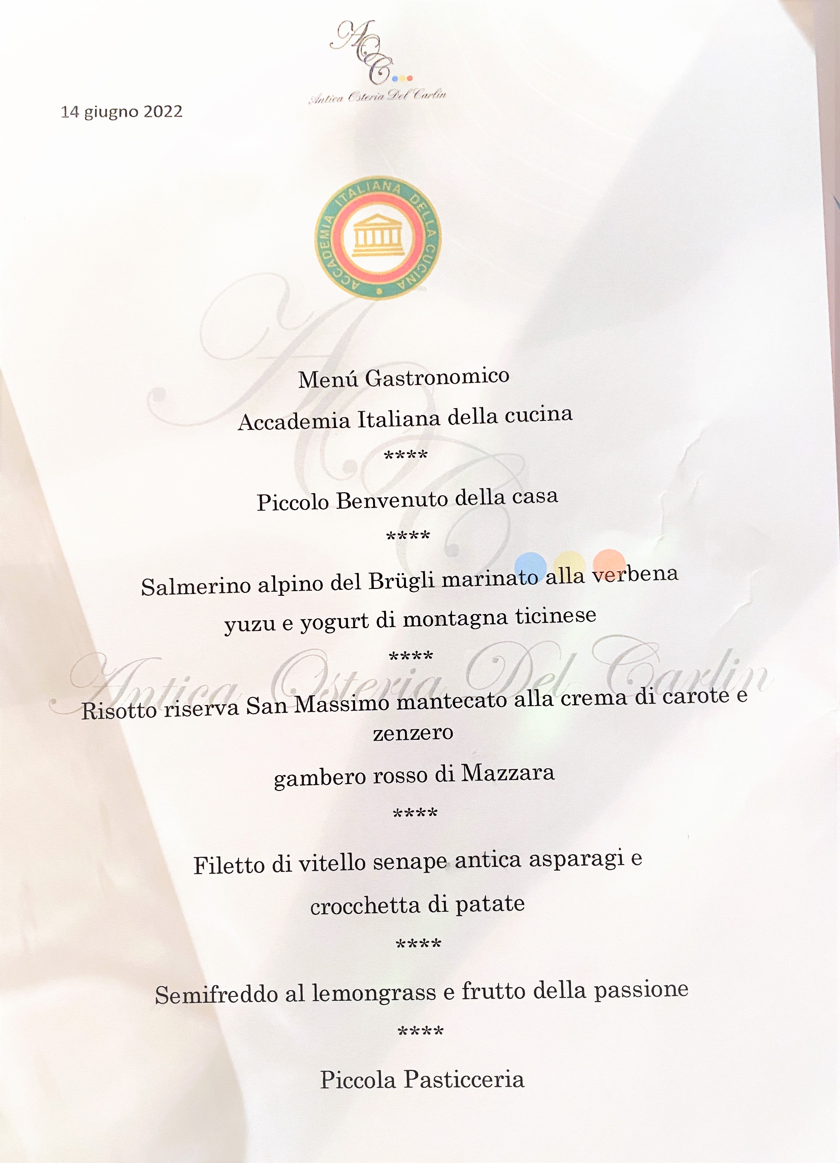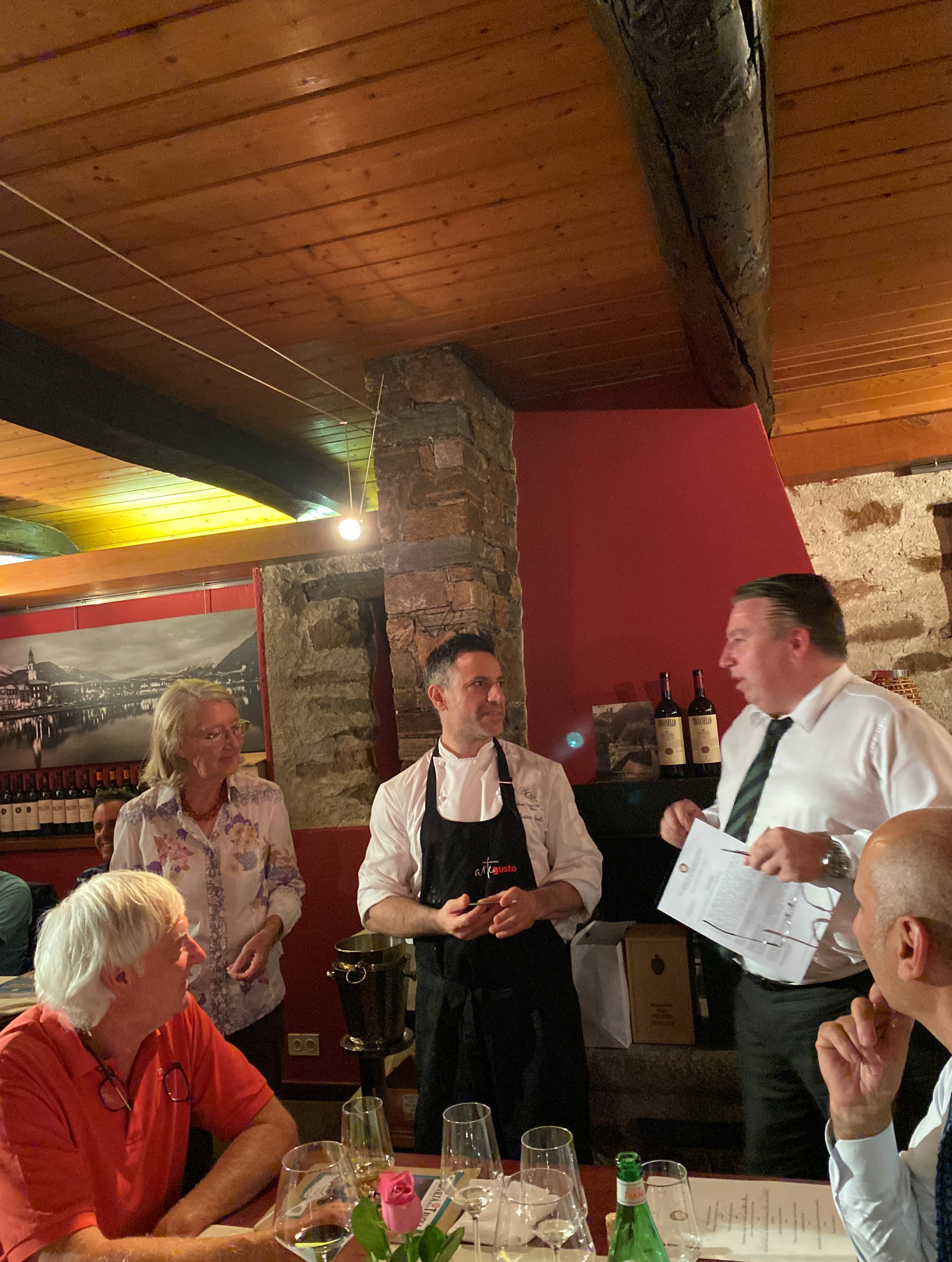 La Delegazione della Svizzera Italiana si è ritrovata presso l’Antica Osteria del Carlin a Claro per una serata conviviale pre-estiva dove lo chef Salvatore Squillante ha deliziato i presenti con un ottimo menu. Ospiti della serata: Davide Delorenzi (foto 1), membro del consiglio direttivo dell’associazione “Amici del Monastero” - che promuove e valorizza la vita del Monastero - che ha raccontato la vita della Comunità Benedettina del Monastero di Claro; Vincenzo Meroni, viticoltore e proprietario dell’Azienda Meroni di Biasca che ha commentato tutti i vini in abbinamento. Presente anche l’Accademico di Singapore-Malaysia-Indonesia Alberto Martinelli. Foto 1. Davide Delorenzi. Foto 2. Da sinistra, il Vice Delegato Francesca Bonifaccio Meschini, lo chef Salvatore Squillante e il Delegato Emilio Casati. Foto 3. Il menu. Foto 4. Risotto riserva San Massimo mantecato alla crema di carote e zenzero e gambero rosso di Mazara.