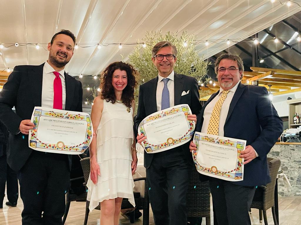 “La tradizione e il territorio. I neo Accademici si raccontano” è stato il tema della conviviale che si è svolta fra gli ulivi di una terrazza meneghina (foto 1) per festeggiare tre nuovi ingressi nella Delegazione Milano Navigli: Alessandro Furlan, Cesare Invitti di Conca, Francesco Zappone (tutti in foto 2 con la Delegata Cristina Ciusa). E raccontare la contaminazione tra culture del territorio ha portato gli Accademici a scoprire la cucina di El Ganassin, ristorante nella zona residenziale Washington Solari in una Milano quasi nascosta. Nato un anno fa dalla sinergia di due anime, una milanese con Giorgio Gibelli e una cinese con Feng Ye, da vent’anni nel settore della ristorazione urbana. In cucina Bruno Manganaro (in foto 3 con la Delegata), che attraverso le ricette di tradizione lombarda esplora nuove forme di espressione culinaria con preparazioni e ingredienti orientali. Nell’incontro dei sapori la scelta enologica, descritta per ogni portata, li ha condotto sulle colline milanesi, a San Colombano al Lambro nella cantina Nettare dei Santi. In tavola la Valtellina con una spuma di Casera in un cannolo di pasta wanton ripieno di brunoise di verdure a contrasto con lo yozucosho. E la bergamasca, con una versione più delicata di Casoncello servito su una zuppa di dashi tiepida con alga wakame, particolarmente apprezzati dagli Accademici. Carrè di agnello cotto a bassa temperatura, affiancato da un morbido di zucca, terrina di patate sfogliate e salsa alla pechinese servito con Pinot nero. Torta paesana, dolce tipico brianzolo, rivisitata e scomposta in una forma di bavarese con evidenza degli ingredienti madre, magistralmente decorata (foto 4). Cotture impeccabili e attenzione al dettaglio della forma estetica.