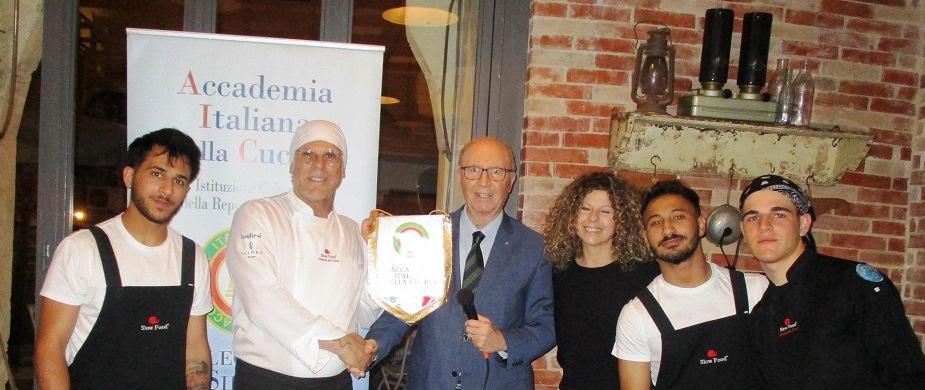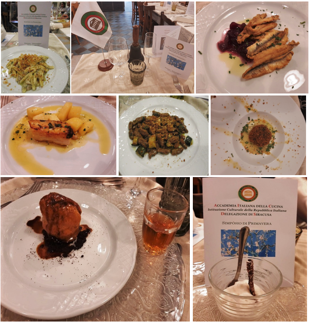 La Delegazione di Siracusa ha visitato il Ristorante “Mammaiabica” dove gli Accademici hanno condiviso il convivio ad un unico tavolo (foto 1). Simposiarca il Delegato Tamburini (foto 2) che, dopo il brindisi di benvenuto, ha poi relazionato sul tema molto apprezzato “Viaggiare cucinando e gustando anche con i cibi che ci rendono felici”. È stata poi servita in tavola la cena, una sequenza di pietanze gustose e gradevoli realizzate dallo staff di cucina del maestro Gianni Cavallaro utilizzando le materie prime del territorio. Il menu (foto 4): arancinetta con nero di seppia e ricotta di buccheri su patata novella di Siracusa; frittura di alici con cipolla rossa caramellata; lolli con ragù bianco di cernia; cavati con farina di carrube con zucchine, menta, buccia di limone e bottarga; trancio di ombrina con zafferano e limone con contorno di patate; scurzunera; bignè con crema di nocciola dei Nebrodi. In buon abbinamento i vini della cantina Colosi delle Isole Eolie-Me: “Salina” Igt bianco e rosso; e Malvasia delle Lipari DOC “Najh”, proposti in tavola dalla maestra di sala Laura Foti. Gli Accademici hanno potuto assistere alla preparazione delle pietanze, data la cucina completamente a vista. Infine la consegna del guidoncino e della vetrofania dell’Accademia allo staff di cucina e di sala (foto 3) con un lungo applauso di gradimento degli Accademici.