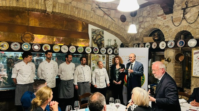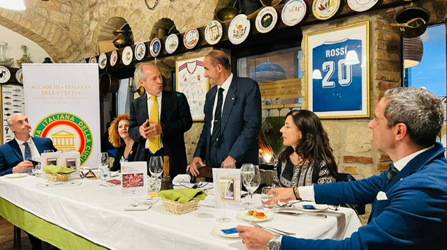 Incontro conviviale della Delegazione di Budapest al ristorante Pomo d’Oro, con altissima soddisfazione dei presenti. Una vera e propria degustazione del pesce azzurro declinato nelle sue varie tipologie e gusti, il tutto condito dalla abilità indiscussa dello chef Rosario Simeoli, poderosa freccia all’arco della ristorazione italiana d’eccellenza a Budapest. Il menu, concordato tra Simposiarca e chef, ha brillato per raffinatezza e sapiente combinazione di gusti e sapori, esaltando i palati della folta schiera di Accademici presenti e suscitando il plauso di S.E. Ambasciatore Manuel Jacoangeli, gradita presenza della serata. Il Delegato Michele Fasciano ha relazionato sui principali aspetti del Nuovo Statuto e del Nuovo Regolamento recentemente approvati.