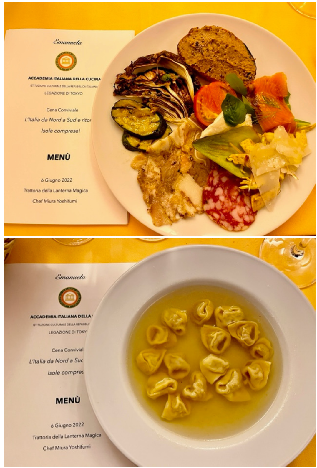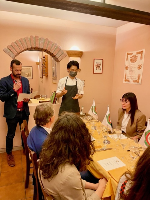 La Legazione di Tokyo (foto 1 e 2) si è ritrovata il presso la Trattoria della Lanterna Magica a Shinagawa, ristorante di lunga tradizione con una brigata di cucina appassionata di cucina italiana tradizionale. Simposiarca Lorenzo Grimaldi che, supportato dalla Legata Emanuela Orighi e dallo chef Miura Yoshifumi, ha illustrato il menu della serata che, sulla scia dei recenti festeggiamenti del 2 giugno, si è ispirato a un viaggio ideale da nord a sud nella nostra bella Penisola. Lorenzo ha dedicato parte della sua presentazione alla Cipolla di Tropea, ingrediente principale di una molto apprezzata pasta del nostro menu, evidenziando la storia, le peculiarità e gli aspetti nutrizionali di questo prodotto IGP italiano di grande pregio. Oltre alla qualità dei piatti degustati merita una menzione il servizio molto attento e puntuale oltre che la disponibilità di tutta la brigata di cucina e del personale di sala. Un ristorante visitato con grande soddisfazione. La Conviviale è stata anche l’occasione per consegnare allo stesso Lorenzo Grimaldi le Insegne accademiche (foto 3).