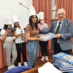Premiati tutti gli alunni di una classe di 2’ media dell’Istituto Bagolino di Alcamo con le copie del libro “Storia della Cucina Italiana a fumetti” donate dalla Delegazione di Alcamo-Castellammare del Golfo. Gli alunni hanno partecipato con profitto e interesse all’attività didattica di laboratorio di cucina coordinata dalla prof.ssa Anna Scandariato e dalla prof.ssa Fiorenza Provenzano. Durante il percorso dell’attività, di durata semestrale e svoltasi nell’orario continuato della scuola, gli alunni si sono distinti nella preparazione di dolci tipici della tradizione del territorio e nelle varie preparazioni di pasta fresca, acquisendo manualità ed esperienza. Foto 1. Da sinistra la prof.ssa Anna Scandariato, il Delegato Liborio Cruciata, la prof.ssa Fiorenza Provenzano. Foto 2 e 3 momenti della premiazione.
