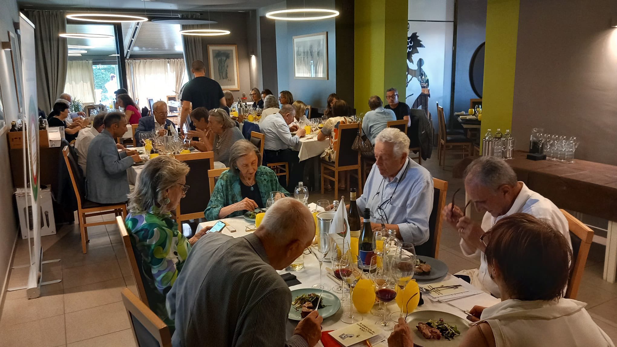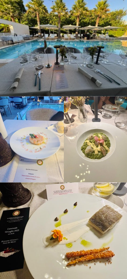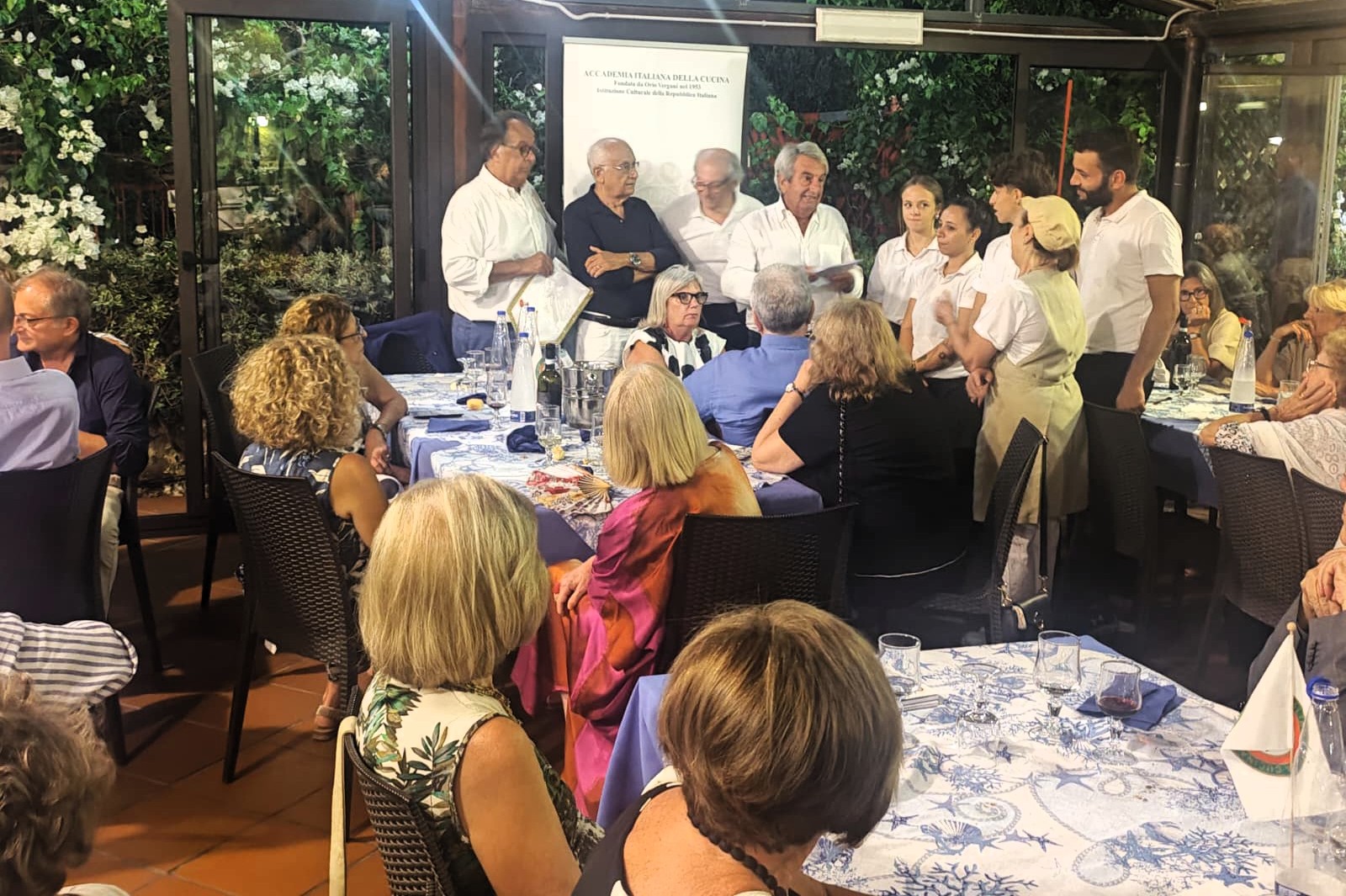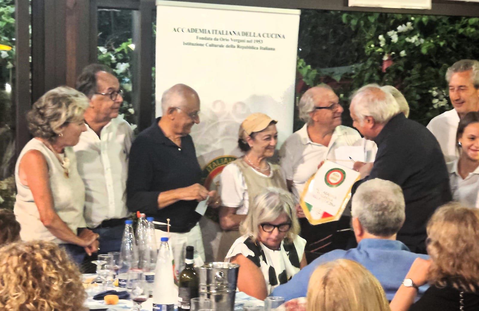Presso il ristorante “Il Cristallo”, all’interno del Resort Miramonti di Forte dei Marmi, nella quiete della prestigiosa zona di Roma Imperiale, si è svolta la riunione conviviale di luglio. Accademici e ospiti sono stati accolti in una suggestiva location con tavoli a bordo piscina e accompagnamento di musica leggera dal vivo. Dopo i saluti iniziali, la Delegata Anna Ricci ha conferito il distintivo al nuovo Accademico Augusto Neri, che, emozionato, ha ringraziato e ricevuto il materiale associativo. Il menù, semplice ma curato, ha proposto piatti equilibrati anche nel gusto. L’antipasto ha valorizzato l’ottimo crudo di pesce proposto nel locale, con tartare di dentice, seguito da un risotto arricchito da sashimi di mazzancolle. Il secondo piatto ha introdotto un tocco fusion: baccalà con sesamo e kimchi coreano, dal piacevole sentore speziato. In chiusura, il dessert “lingotto caramellato salato” ha conquistato i presenti per cremosità e raffinatezza, completando un menù delicato e ben costruito. A fine serata, la Delegata, prima di salutare i presenti, ha chiamato la brigata di cucina con lo chef Giuseppe De Rang e la maître Deborah Morelli, ringraziandoli vivamente della gradevole accoglienza ricevuta.