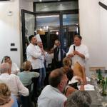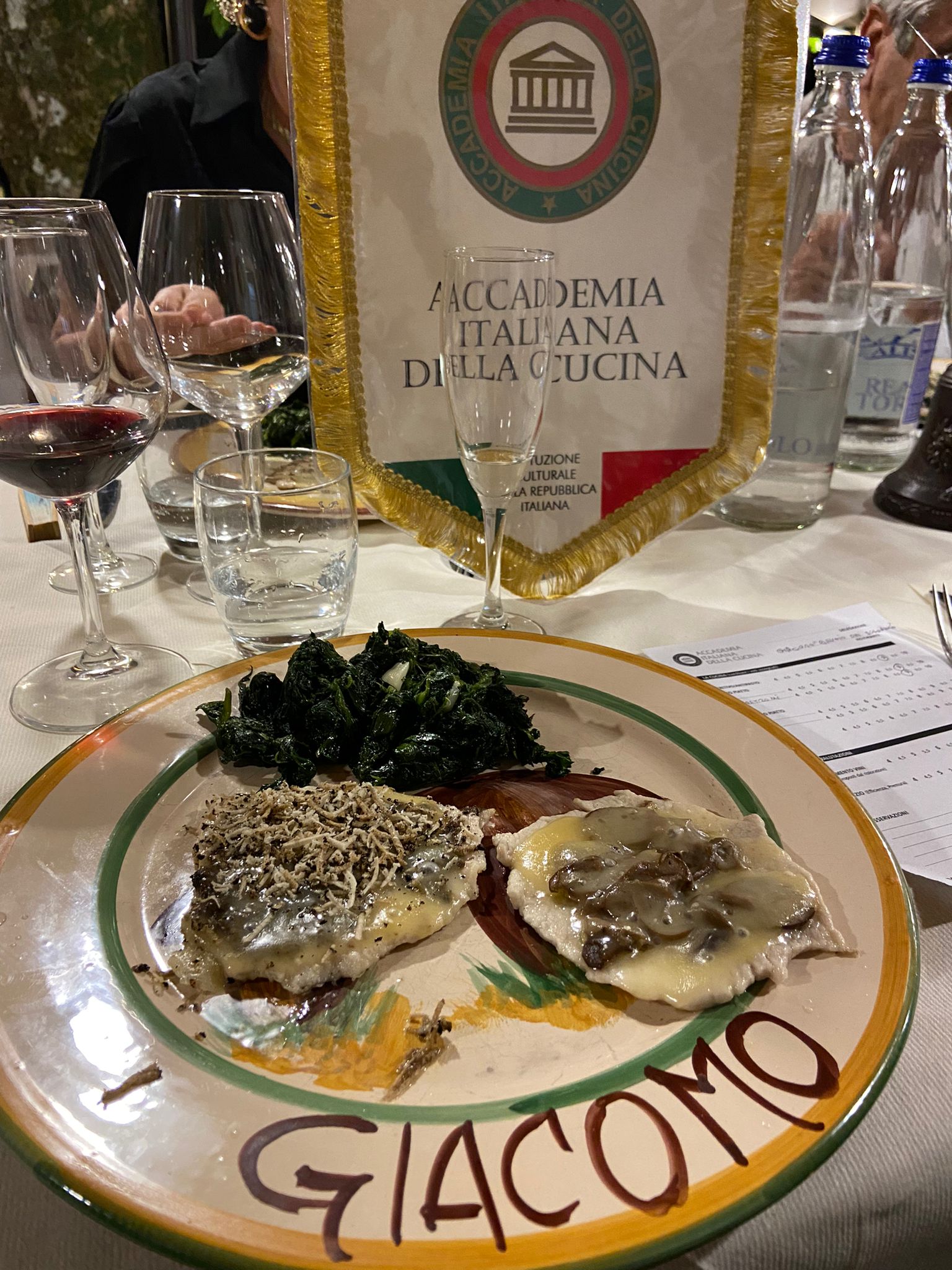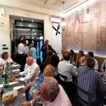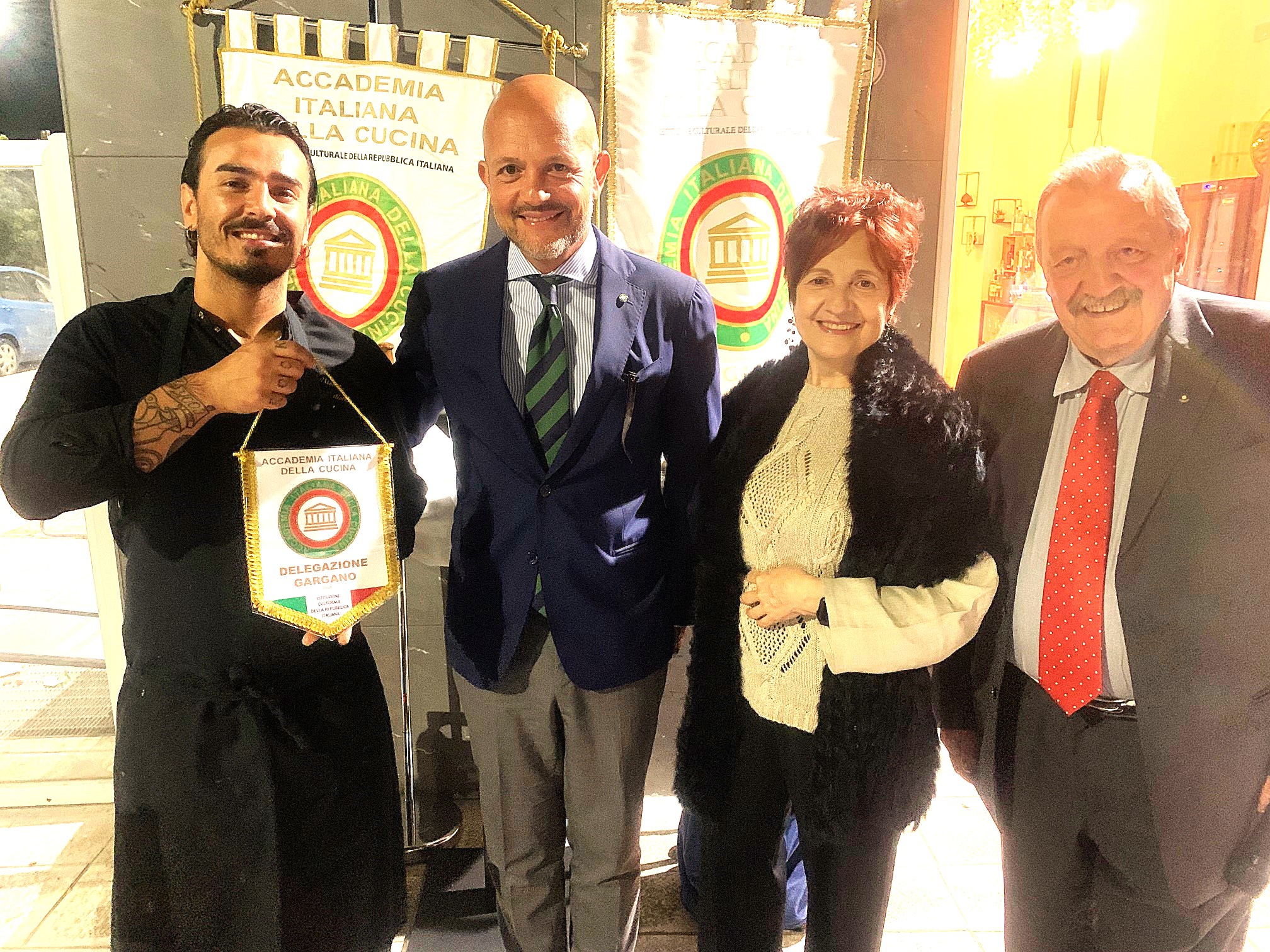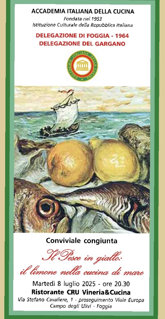 Per la riunione conviviale congiunta con la Delegazione del Gargano, la Simposiarca Carmen D’Intino ha scelto il ristorante “CRU Vineria&Cucina” di Michele Impagnatiello, alla periferia della città, dove già si era svolta la conviviale degli Auguri con un apprezzato menù a base di carne. La cena, questa volta a base di pesce, si è svolta all’esterno, nell’elegante dehors. Il tema affidato allo chef è stato “Il Pesce in giallo: il limone nella cucina di mare”. Michele ha confermato la sua maestria e inventiva con questo menù: aperitivo di benvenuto con focaccia “home made”, macaron al pistacchio con ricotta e tartare di tonno; mousse di ricotta al limone, gambero rosso, insalatina di piselli e capocollo di Martina Franca; tubetto selezione “Vallillo”, in crema di zucchine, fiori di zucca, vongole e zest di limone; scaloppina di branzino al limone e mousse di patate. In abbinamento, spumante e vini delle Tenute Sannella di San Severo, presentati dall’enologo Cosimo Morfeo. In chiusura, crumble salato con lemon curd e meringa flambata, accompagnato da limoncello al cardamomo fatto in casa. Dopo l’introduzione e i saluti dei Delegati, Valerio Antonio Vinelli di Foggia e Giuseppe Trincucci del Gargano, è stato presentato il menù da parte della Simposiarca e dello chef. Affissa alla vetrina del locale la vetrofania 2025 dell’Accademia Italiana della Cucina.