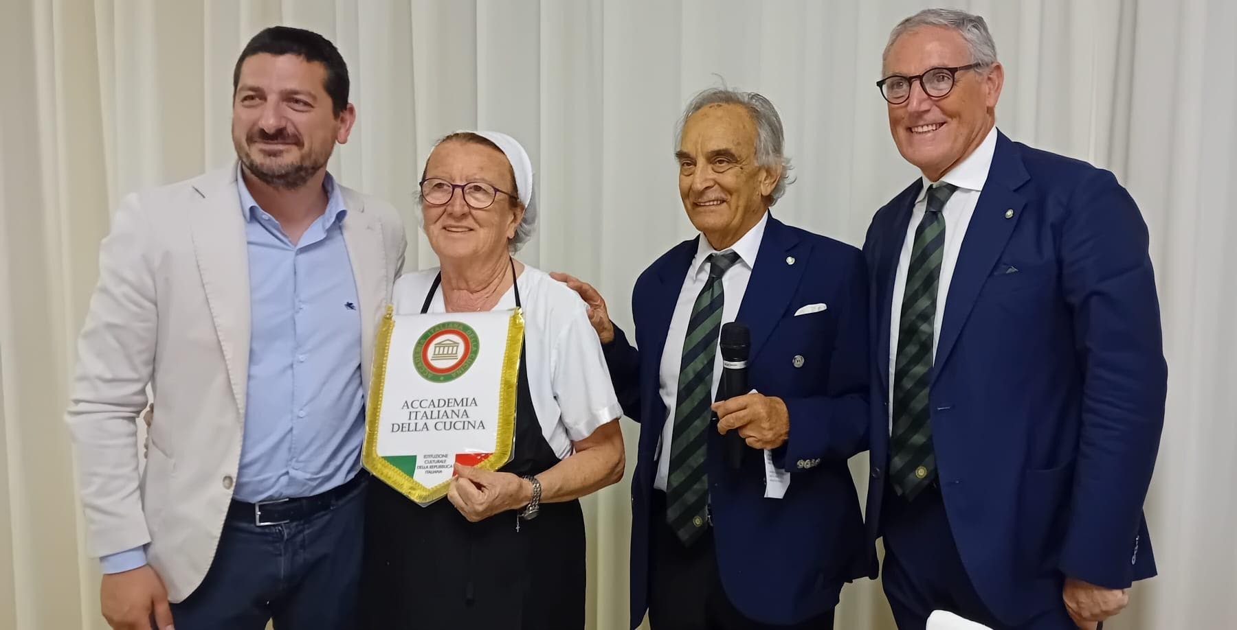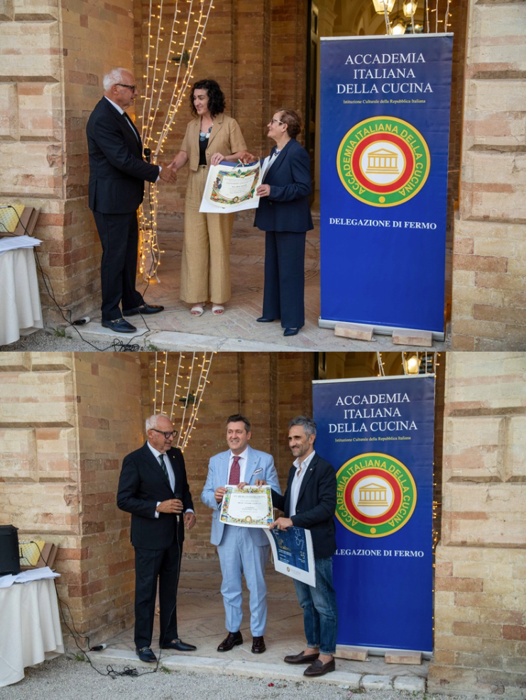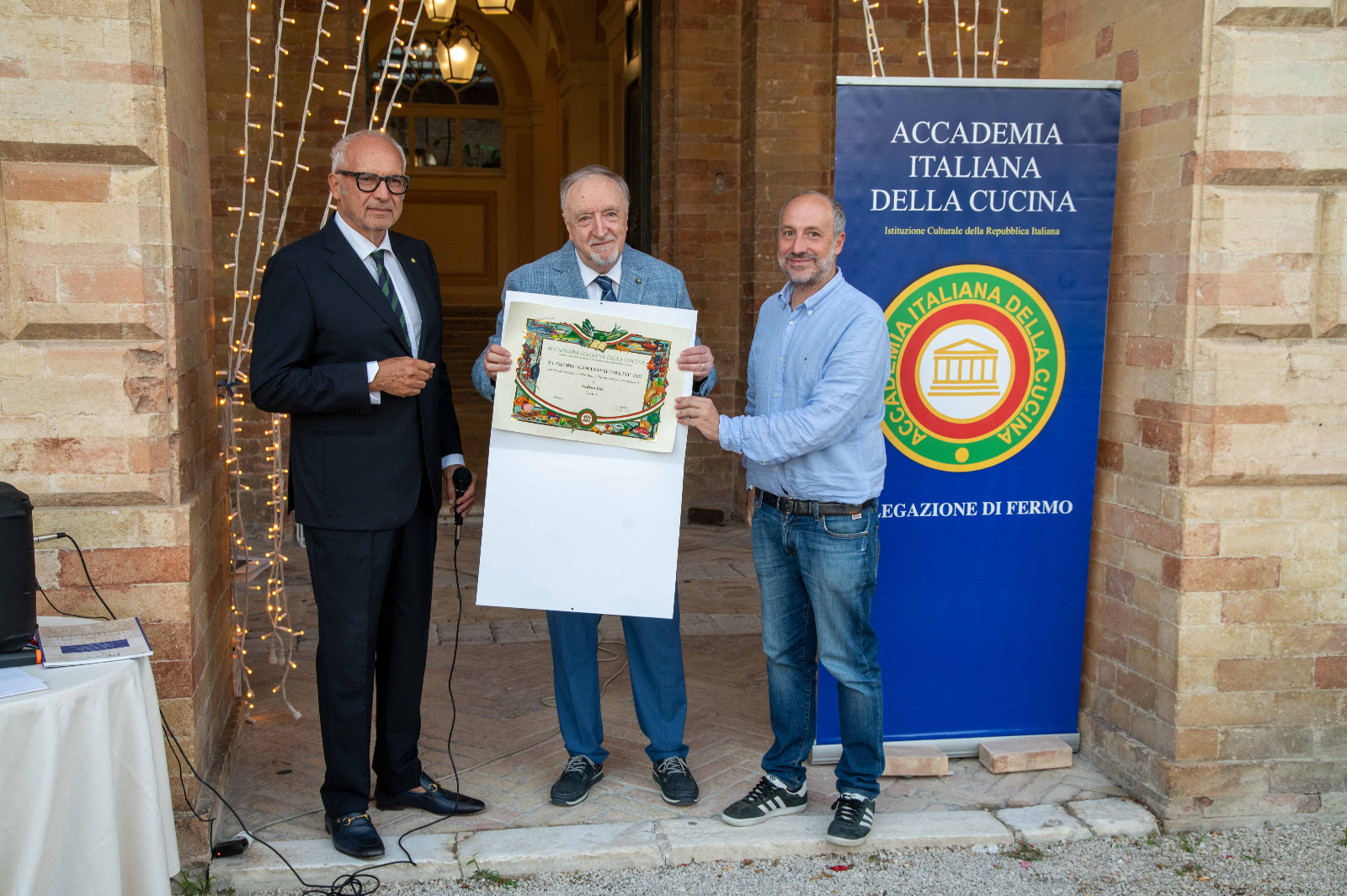 A Porto San Giorgio, nella splendida cornice di Villa Bonaparte, si è svolto uno degli eventi più prestigiosi organizzati annualmente dalla Delegazione di Fermo: “Le stelle dell'Accademia”. In questa occasione sono stati consegnati i premi annuali, assegnati sulla base delle valutazioni oggettive della Consulta, che considera qualità, tradizione e capacità di rappresentare l’identità del territorio fermano. I riconoscimenti sono andati ad Andrea Livi, che ha ricevuto il Premio “Giovanni Nuvoletti”; alla gelateria La Cremeria di Porto San Giorgio, insignita del Premio “Massimo Alberini”; alla Pasta all’uovo Santa Rosa di Falerone, premiata con il “Dino Villani”; e al ristorante Emilio di Fermo, a cui è stato conferito il Diploma di Buona Cucina dell’Accademia. L’evento, patrocinato dalla Provincia di Fermo, dal Comune di Fermo e dai Comuni di Porto San Giorgio e Falerone, ha voluto dare il giusto riconoscimento a realtà che con la loro opera contribuiscono in modo significativo al Turismo e al Commercio locale. La serata è proseguita con una cena conviviale nei giardini della villa, curata da Top Catering di Gianni Lamponi. In degustazione, un piatto iconico del ristorante Emilio, la torta San Giorgio di Sandro Marangoni (La Cremeria) e “lu serpe” di Falerone, preparato da Anna Maria Antonelli (Pasta all’uovo Santa Rosa). Andrea Livi ha omaggiato i presenti con una sua pubblicazione su Villa Bonaparte. Organizzazione impeccabile delle Simposiarche Anna Maria Ciciretti, Maura Raccichini e Nadia Zacchi.