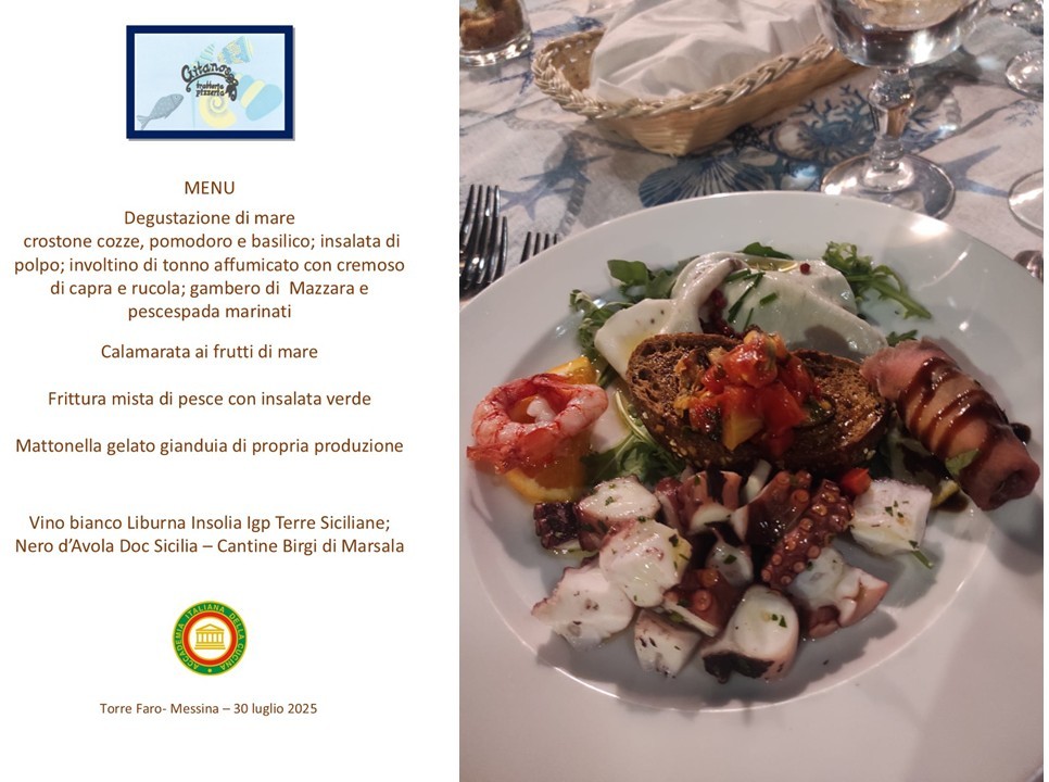 Da un’idea dei fratelli Gaetano e Giovanna Pispisa, nel 1999 nasce la pizzeria-trattoria Gitano’s – acronimo dei due nomi – che gode di un’affascinante posizione, in un punto ricco di storia marinara e bellezza naturale. Posizionato sul lungomare, nella secolare vicenda dell’attraversamento dello Stretto – la più controversa della storia di Messina – si annota la preoccupazione per le sorti di uno dei locali più longevi del litorale di Torre Faro, con ormai quasi trent’anni di attività, e tra i più consolidati della gastronomia ittica locale, che offre piatti della tradizione in un ambiente accogliente. Tanti i prodotti tipici del territorio utilizzati, peculiarità di una cucina dai profumi e sapori mediterranei, per ricette che evocano i piatti della tradizione siciliana, e anche per le pizze, preparate con ingredienti di qualità. Gli Accademici, degustando un assortimento di antipasti di mare, una calamarata ai frutti di mare e una frittura mista, hanno apprezzato l’impegno di Giovanna e Pasquale anche nei dessert. Alcune criticità sono emerse nella presentazione della calamarata e nel servizio di sala. L’incontro si è concluso con la consegna del guidoncino e della vetrofania dell'Accademia.