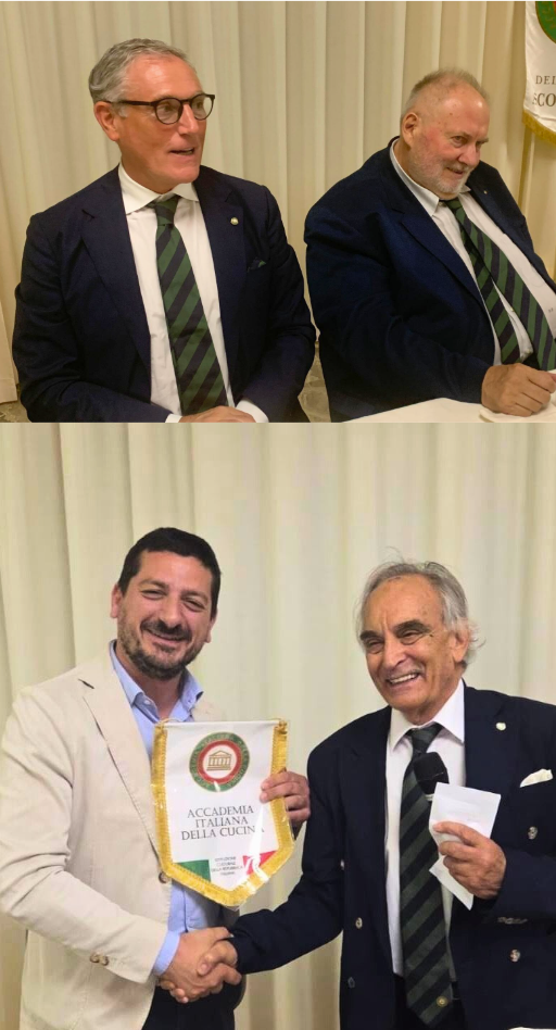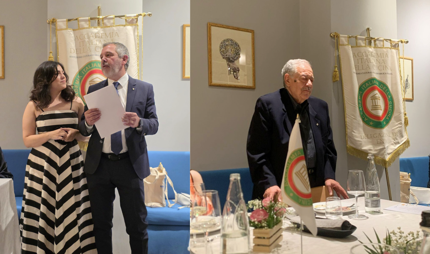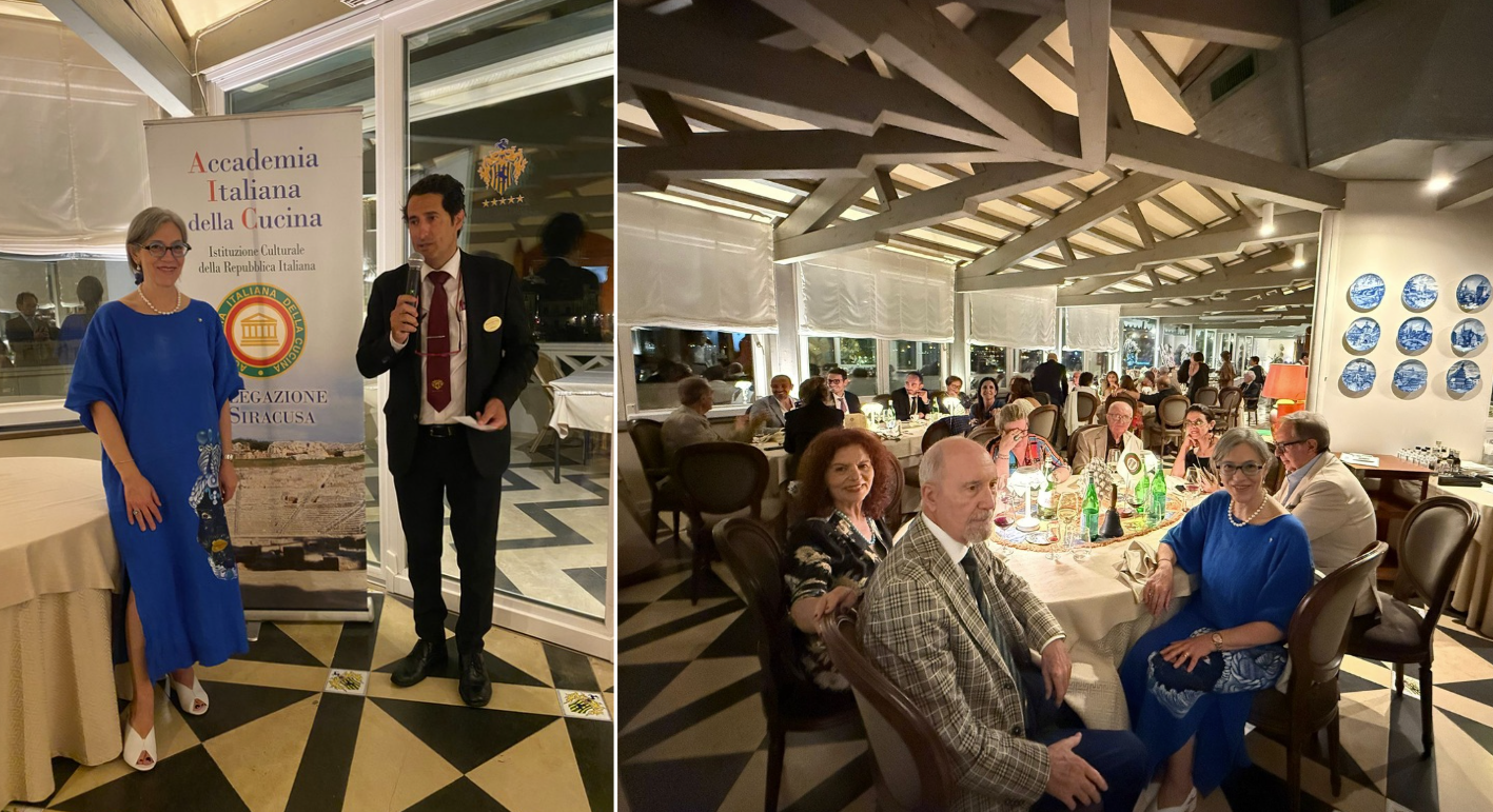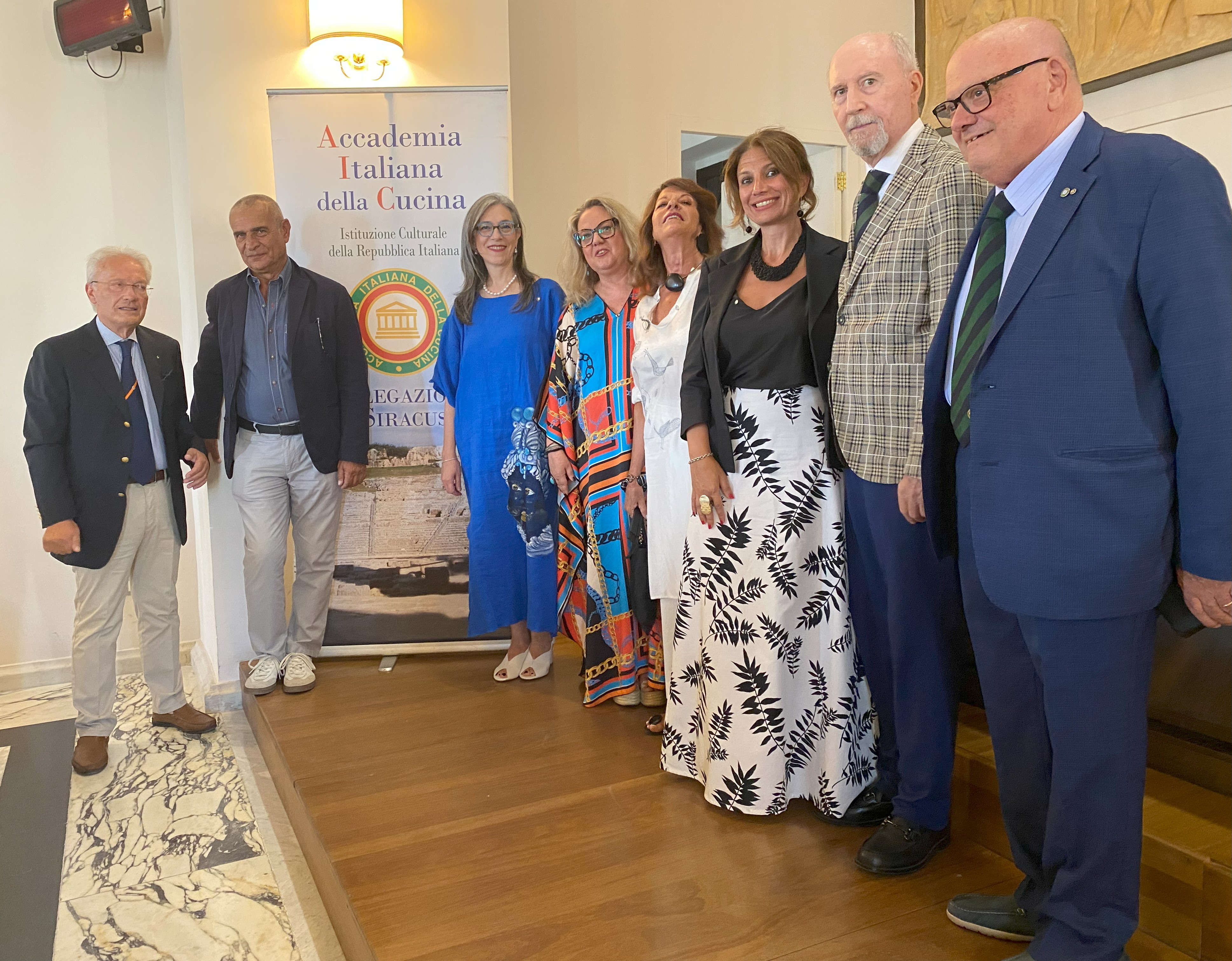 La Delegazione di Siracusa ha consegnato due premi per l’anno 2025. Il Premio Giovanni Nuvoletti al Professor Giovanni Fichera, docente ordinario di laboratorio, organizzazione e gestione dei servizi ristorativi presso l’IPSSART di Siracusa, per il suo impegno nella valorizzazione della buona tavola tradizionale. Il Premio Massimo Alberini è stato invece assegnato ai fratelli Concetto e Pino Burgio. Insieme alle mogli e ai nipoti, ripropongono il gusto dei sapori smarriti. Dal 1978 racchiudono in un barattolo tradizioni, ricordi di feste, domeniche in famiglia, profumi e rumori della campagna di Solarino. Dal laboratorio all’antico mercato di Ortigia, dove hanno aperto la loro salumeria, offrono delizie di verdure fresche, lavorate nel rispetto della stagionalità, della genuinità (senza conservanti) e della tradizione, seguendo l’esempio del padre. La cerimonia si è svolta presso la Camera di Commercio di Siracusa ed ha preceduto la riunione conviviale d’estate presso l’adiacente ristorante “La terrazza del Grand Hotel Ortigia”. Prima della cena i fratelli Burgio hanno gentilmente offerto la possibilità a tutti i presenti di degustare i loro prodotti tipici. Numerosa la partecipazione degli Accademici, di ospiti e delle Autorità locali.
