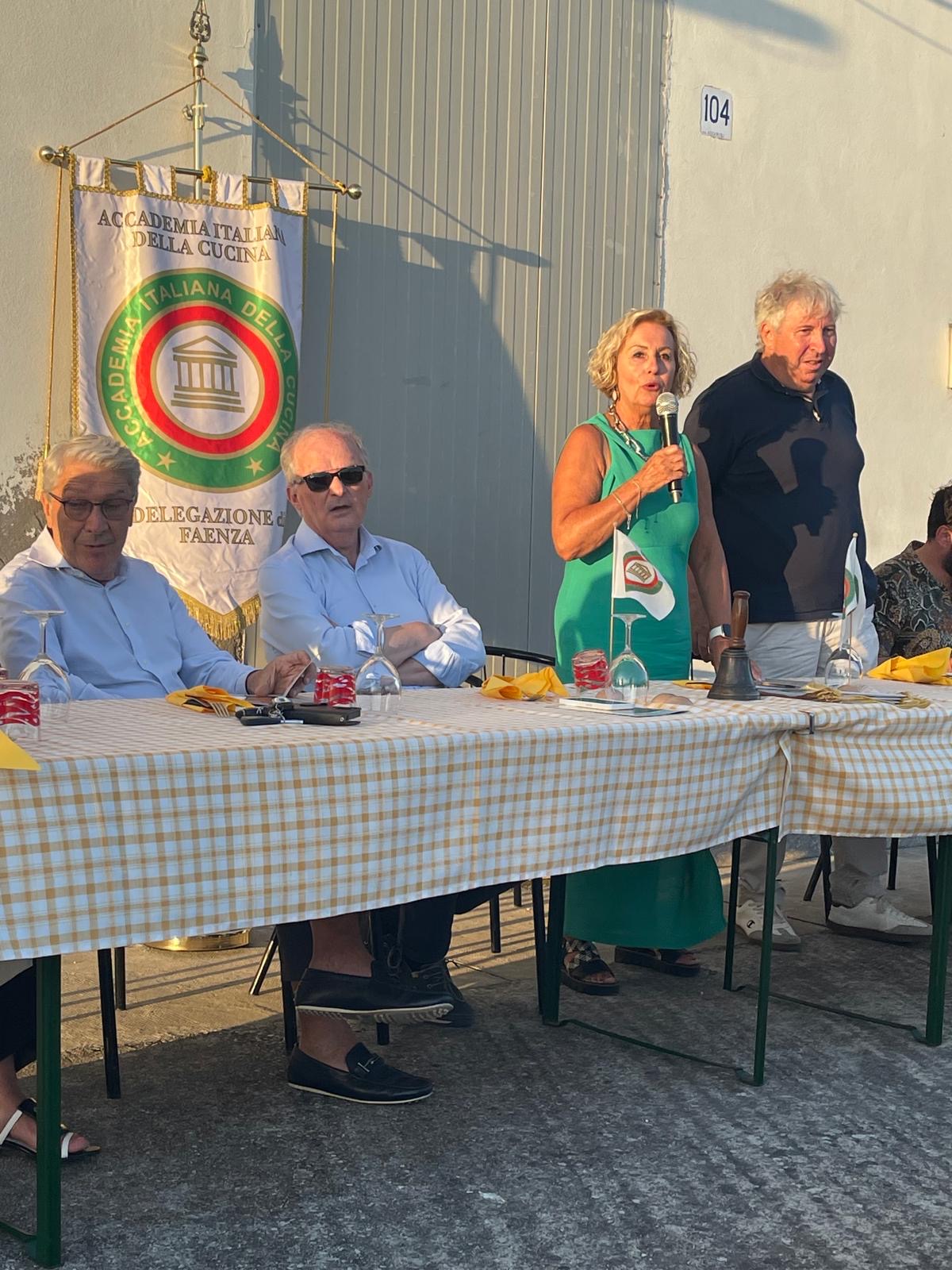 L’ultima conviviale estiva della Delegazione si è svolta presso il Circolo Campagnolo di Pieve Cesato, incentrata sul tema: “Mondo blu, quanto è buono?”, confronto tra granchio blu e astice blu. A guidare la serata il Simposiarca Tiziano Rondinini, con interventi della biologa marina Carlotta Santolini, di Adriano Maestri (coltivatore di lime caviale) e di Carlo Pirazzoli, Direttore del Centro Studi Territoriale Romagna. L’incontro ha stimolato riflessioni e approfondimenti tra i numerosi Accademici presenti. La cena all’aperto ha proposto tagliolini fatti a mano con granchio e astice blu, cozze selvagge di Marina di Ravenna, frittura di paranza e pesce azzurro alla griglia, sotto la guida di Pierangelo Orselli, cuoco della Condotta Slow Food di Ravenna. In chiusura, un "provocatorio" sorbetto alla salicornia con lime caviale, realizzato da “Sbrino” (Francesco Bendandi). Serata partecipata, tra convivialità, sapori e un suggestivo tramonto faentino.