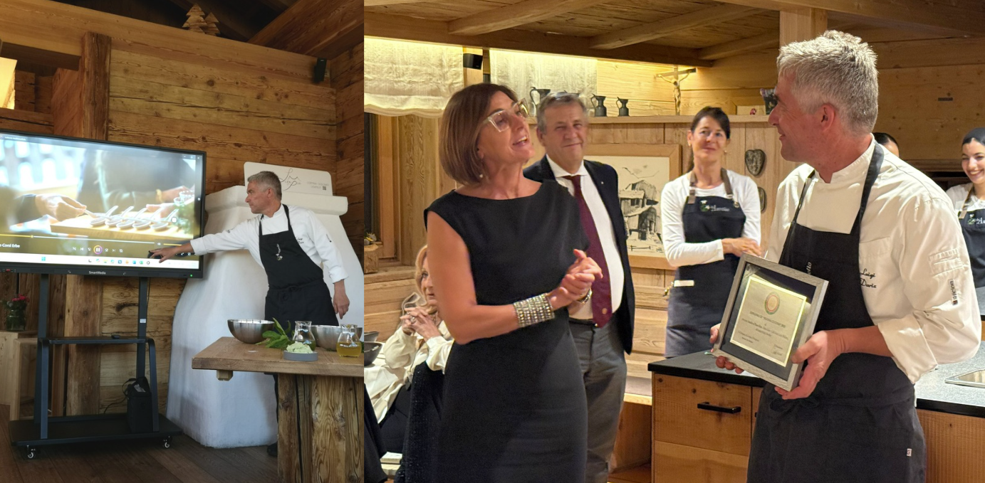 Nel corso della riunione conviviale “Il percorso dei fiori e delle erbe” presso il ristorante “Da Aurelio al Passo Giau”, la Delegazione di Cortina d’Ampezzo ha avuto il grande piacere, per mezzo della Delegata Monica De Mattia, di consegnare due importanti riconoscimenti a figure significative della ristorazione e della produzione artigianale ampezzana. A Luigi Dariz, titolare del ristorante che ospitava l’evento, è andato il meritato Diploma di Buona Cucina: egli infatti ha seguito le orme del padre Aurelio, che ha reso famoso il locale per la sua squisita cucina. Gigi, appassionato ed esperto conoscitore dei fiori e delle erbe del territorio circostante, ha creato una cucina innovativa pur mantenendo il filo della tradizione: in una breve lezione introduttiva ha mostrato olii, distillati, burri da lui stesso preparati ed usati nei piatti in tavola. A Davide Santer, dell’omonima Azienda Agricola, è andato invece il Premio Dino Villani per il prodotto di punta dell’azienda, il “GranAmpezzo”, formaggio stagionato dal sapore intenso dovuto al foraggio di montagna di cui si cibano le bovine Santer, che producono un latte genuino e naturalmente buono, perché vengono alimentate con erba, legumi, cereali e fieno, senza la somministrazione di concentrati e insilati. Accompagnata dagli interventi delle Simposiarche Paola Franco e Monica Sardonini Hirschstein, la serata si è svolta in un’atmosfera festosa e di serena convivialità, cui si è aggiunto il piacere di potere meritatamente premiare Gigi Dariz e Davide Santer.