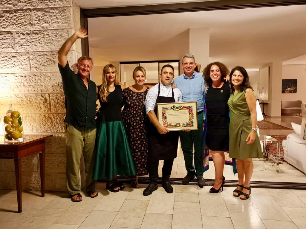 Presso la residenza dell'Ambasciatore d'Italia in Israele S.E. Gianluigi Benedetti è avvenuta la consegna del premio nazionale "Giovanni Nuvoletti" allo chef Michele Bozzetto e del premio "Massimo Alberini" assegnato dalla Delegazione alla Gelateria"Arte" di Marco Camorali e Sissi Padani. Lo chef Bozzetto ha curato il menu per gli Accademici e ospiti presenti alla cena di gala (foto 3). Foto 1. La Delegata Cinzia Klein e l'Ambasciatore S.E. Benedetti durante il discorso di benvenuto. Foto 2 (da sinistra). Marco Camorali (Arte), la Delegata Cinzia Klein, l'Accademica onoraria e Simposiarca Sabina d'Antonio Benedetti, lo chef Michele Bozzetto, S.E. l'Ambasciatore Gianluigi Benedetti, la Vice Delegata Sabrina Fadlun, Sissi Padani ( Arte). Foto 4. Gelato della Gelateria "Arte".