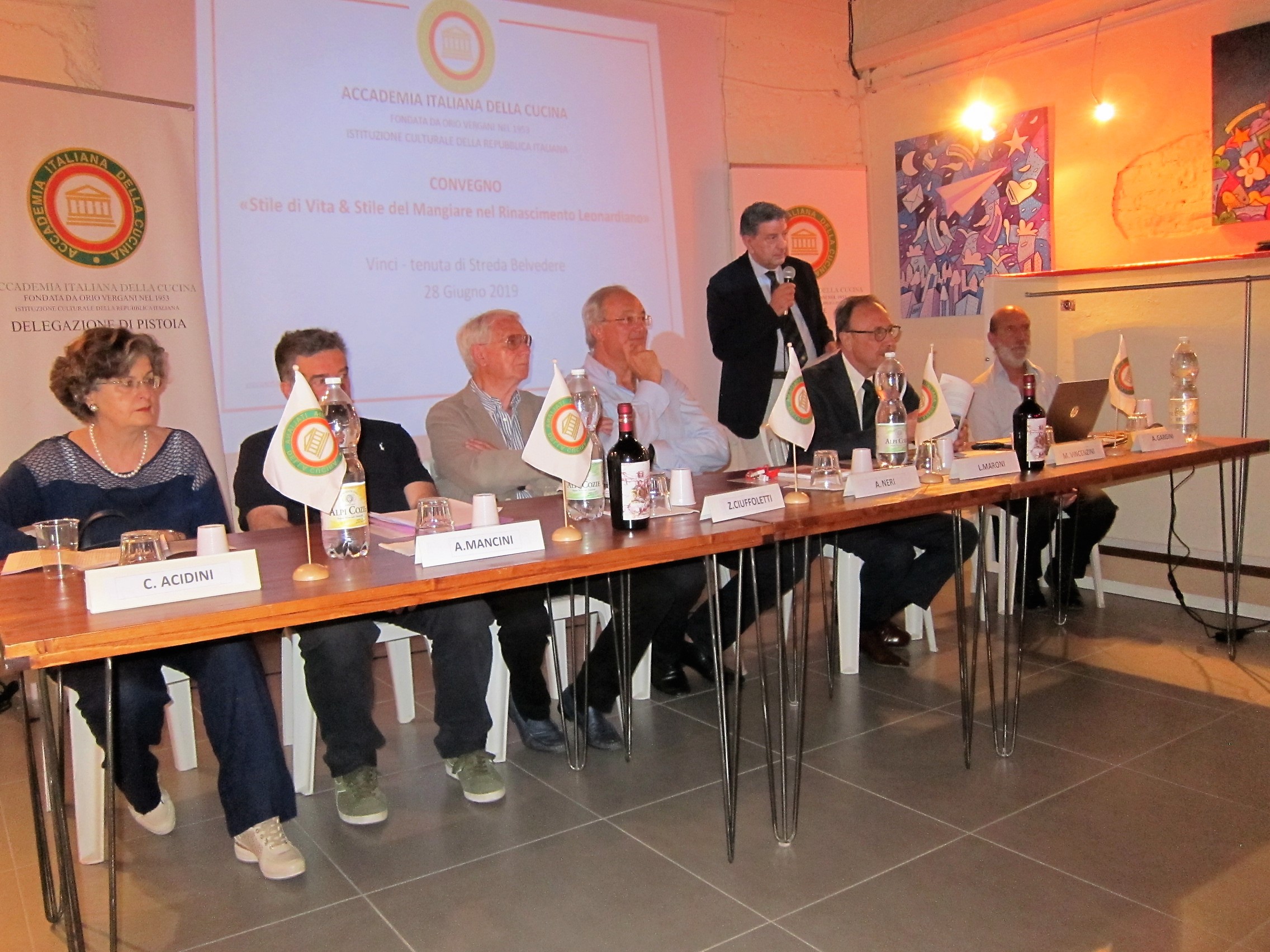 La Delegazioni di Pistoia, in collaborazione con la Delegazione di Empoli e Kiwanis Club Prato e, con il patrocinio del Comune di Vinci, ha organizzato il convegno "Stile di Vita & Stile del Mangiare nel Rinascimento Leonardiano" presso la Tenuta Streda Belvedere a Vinci con ospiti e relatori di eccezione. Tra i relatori: la storica dell'arte e Presidente dell’Accademia delle Arti e del Disegno di Firenze Cristina Acidini; il regista Andrea Mancini; il prof. Alessandro Vezzosi, Direttore Museo Ideale Leonardo Da Vinci; il prof. Zeffiro Ciuffoletti dell'Accademia dei Georgofili; l'arch. Andrea Neri curatore della mostra "Le macchine di Leonardo e i modelli storici". Durante il convegno l'analista sensoriale Luca Maroni è stato intervistato dal giornalista Stefano Coppini per Kiwanis International Prato sul suo libro "Leonardo e il Vino" e l'artista Skim ha realizzato, sul momento, un'opera donata alla Fondazione Firenze Radioterapia Oncologica Onlus (foto 4). L'evento si è concluso con una partecipata riunione conviviale presso la tenuta Streda (foto 3). Foto 1. I relatori. Foto 2. Partecipanti al convegno.