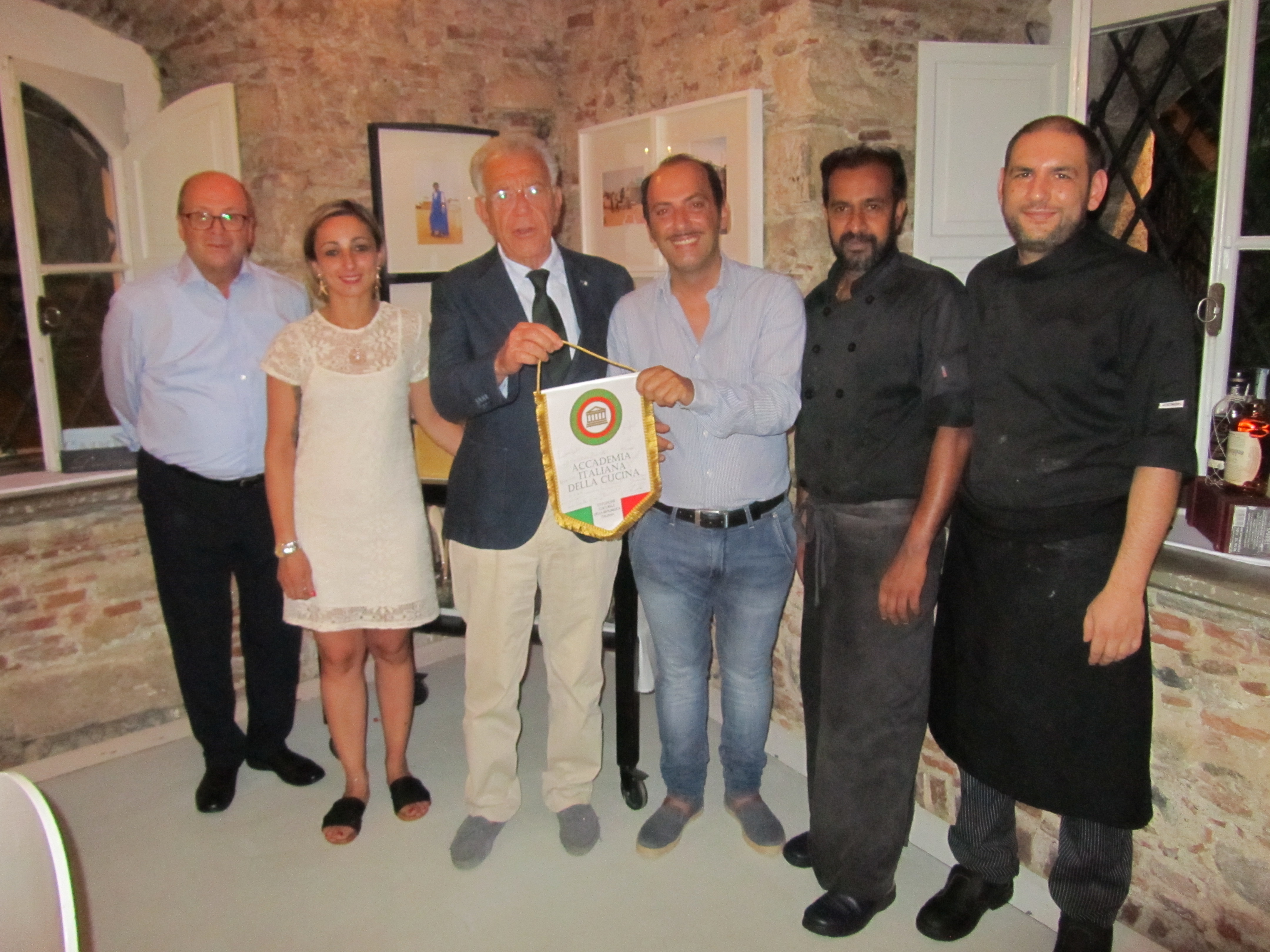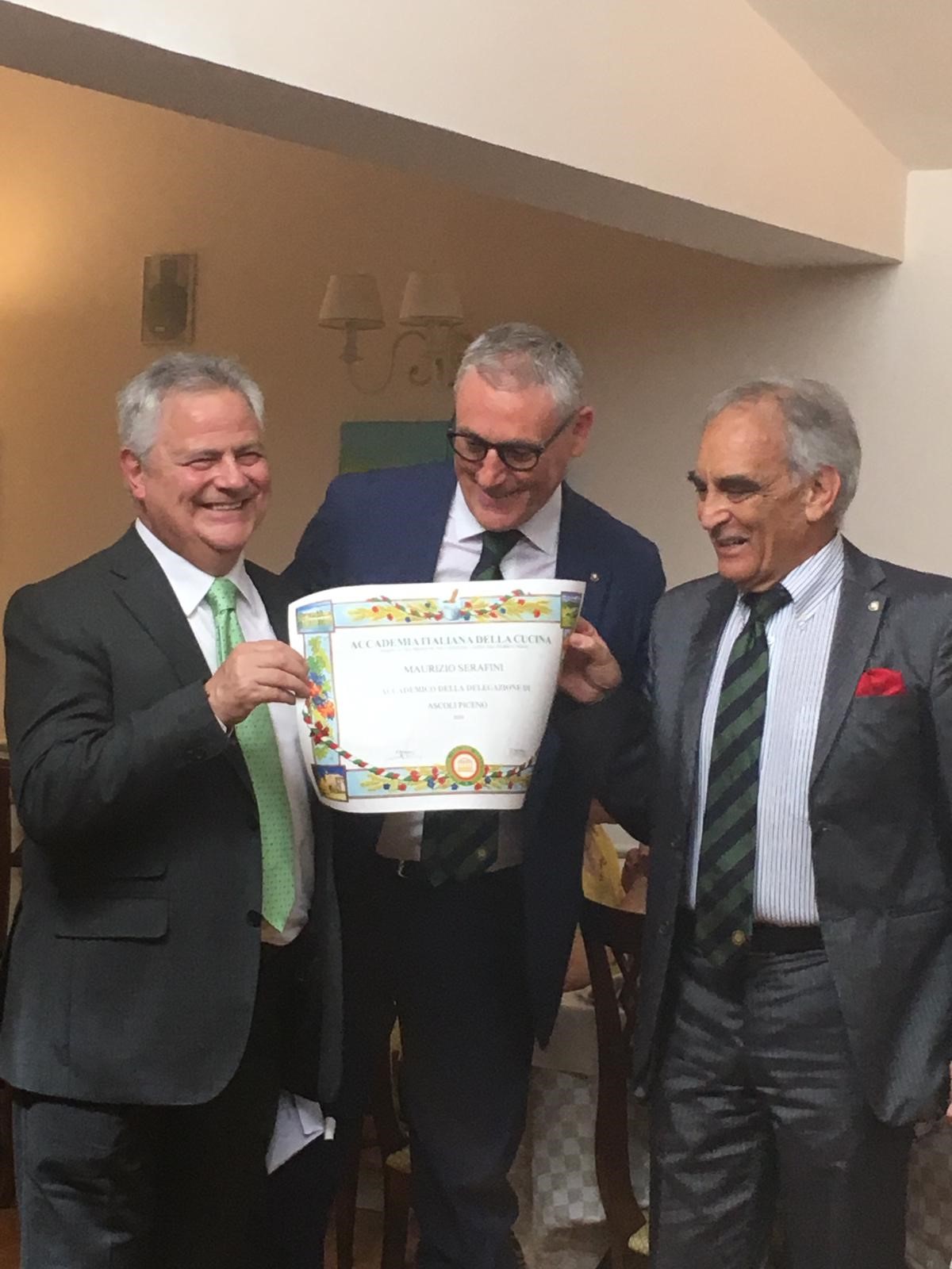 La Delegazione di Ascoli Piceno ha visitato il ristorante "Il Ruspante" trasferitosi da Roccafluvione, paesino dell'Ascolano, al centro di Ascoli Piceno. Il titolare "Giggi" Argira e il figlio Quirino hanno dislocato in città la rinomata cucina elaborata dalla chef Anna Maria Orsini (moglie di Gigi Argira) riproponendo fedelmente la cucina casereccia pedemontana tipica del ristorante. Foto 1. In piedi, il Delegato di Ascoli Piceno Vittorio Ricci tra il Coordinatore Territoriale Marche Sandro Marani, il Consultore e Simposiarca Costantino Gullì, il Delegato di Fermo Fabio Torresi. Foto 2. Marani e Ricci consegnano l'attestato di appartenenza al neo Accademico Maurizio Serafini. Foto 3. Il Delegato Ricci presenta ai commensali la famiglia Argira: da sinistra Quirino, “Giggi” Argira e la chef Anna Maria Orsini.