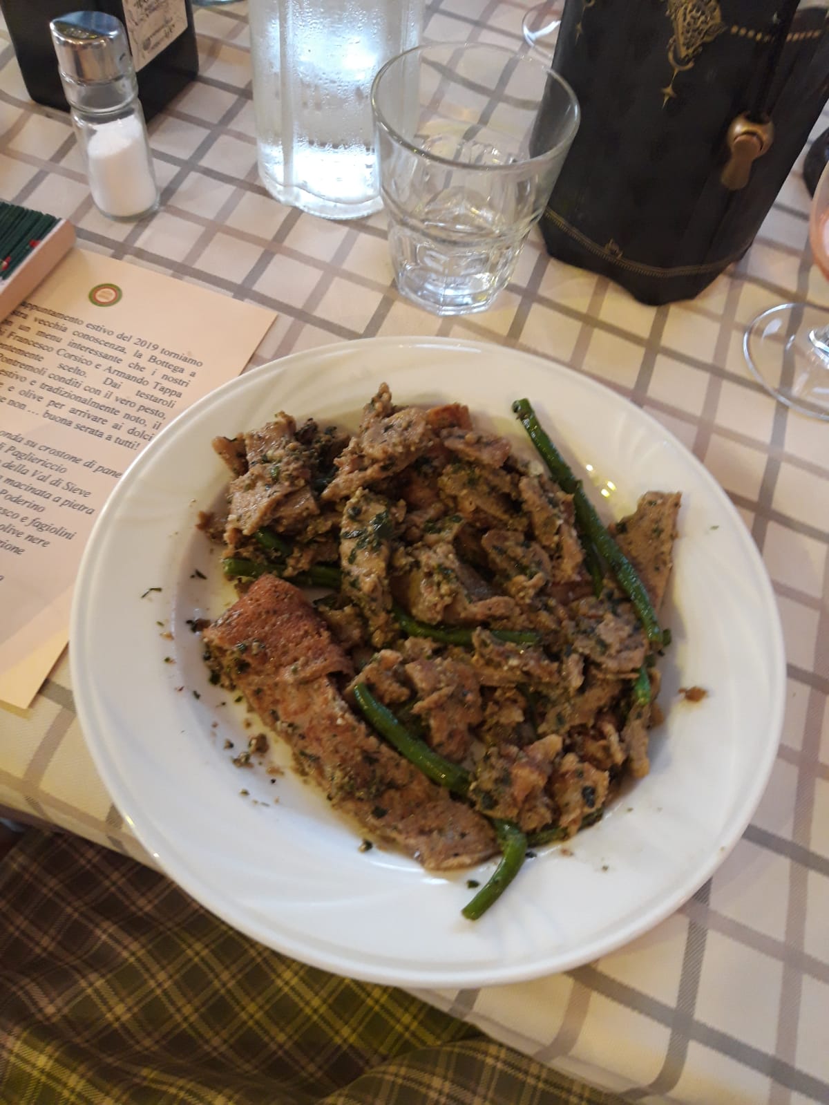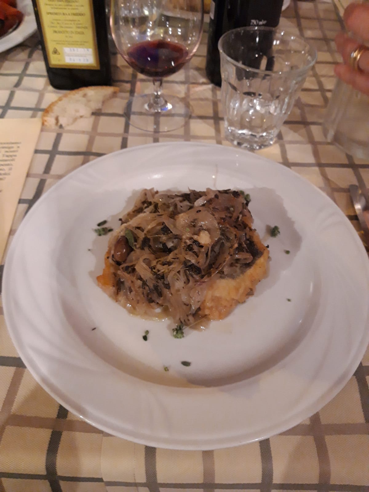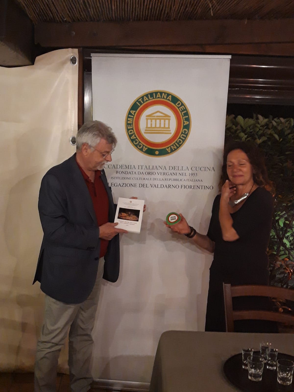 La Delegazione del Valdarno Fiorentino si è ritrovata presso la "Bottega a Rosano", Loc. Rosano, Rignano sull'Arno (FI) per la riunione conviviale d'estate. Foto 1. Accademici a tavola. Foto 2. Il Delegato Ruggero Larco consegna la vetrofania dell'Accademia e un omaggio alla Signora Lorella. Foto 3. Testaroli al pesto. Foto 4. Baccalà con cipolle ed erbe aromatiche.