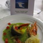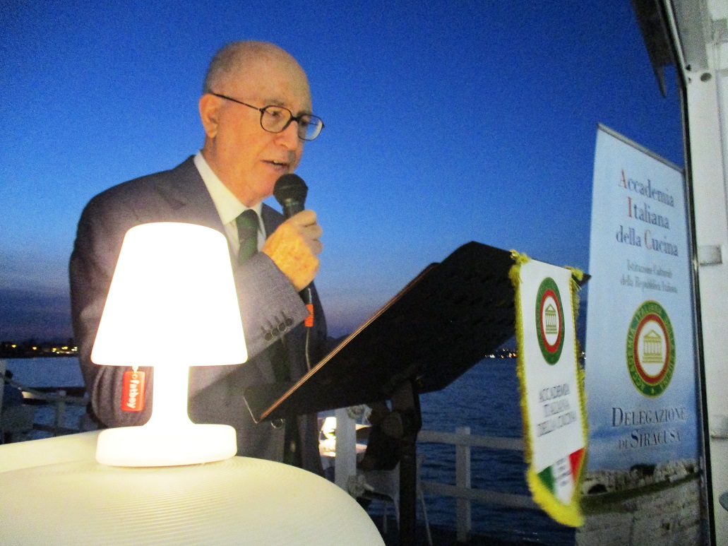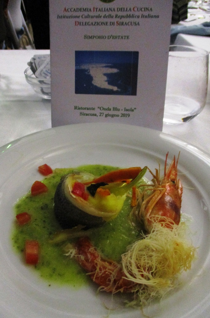 La Delegazione di Siracusa ha visitato il Ristorante "Onda Blu-Isola" per la riunione conviviale d'estate. Il Delegato Angelo Tamburini ha relazionato sul tema "Le specie ittiche, i crostacei ed i frutti del Mare Jonio in Cucina" (foto 1). Per l'occasione sono state servite in tavola solo pietanze di mare. Foto 2. Accademici a tavola. Foto 3. Il Delegato ha consegnato la vetrofania accademica 2019 e il guidoncino al maestro di cucina Francesco Veneziano e al maestro di sala Cristian Terranova. Foto 4. Turbante di spigola e gamberone in pasta kataifi.