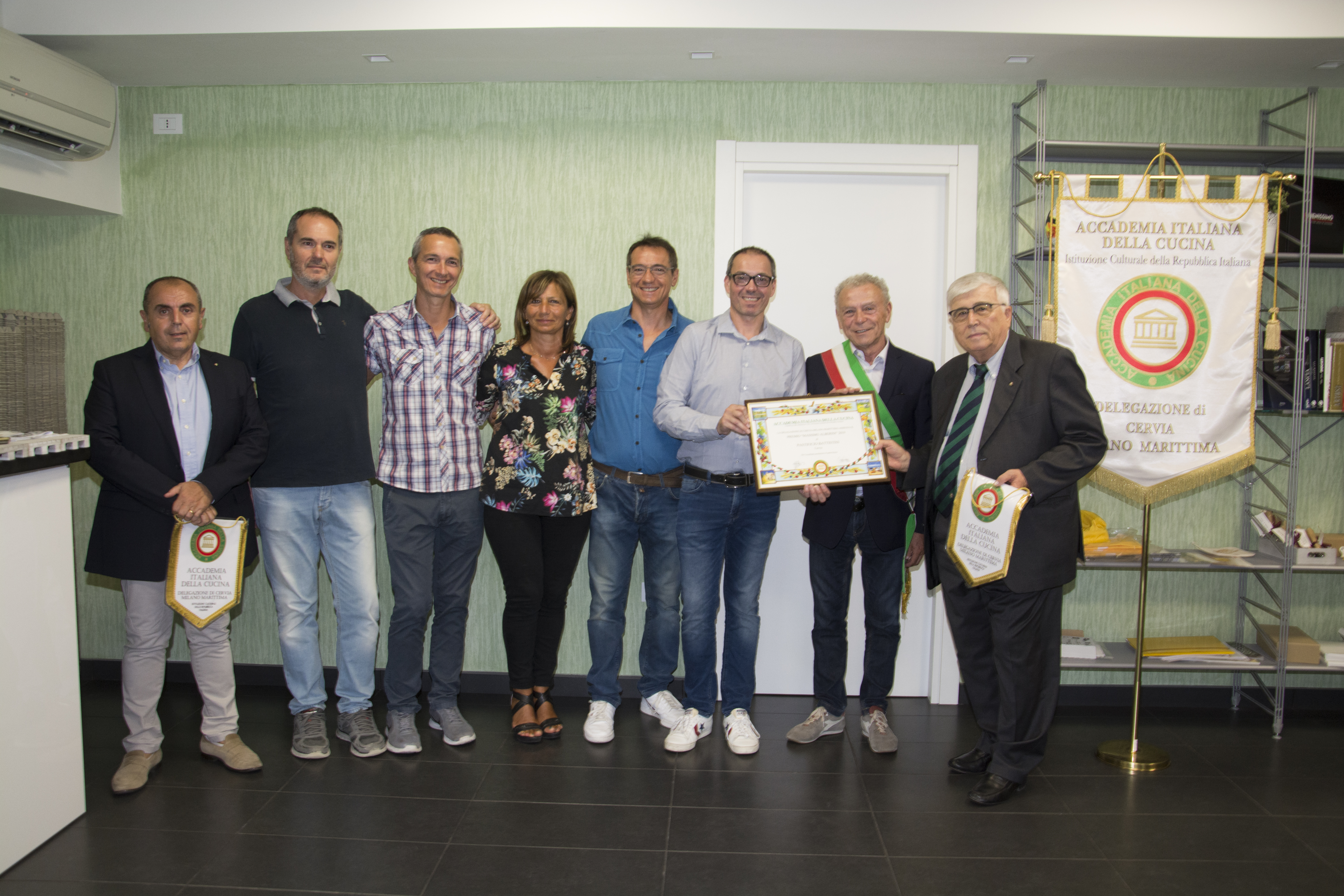 La Delegazione di Cervia-Milano Marittima ha consegnato il Premio "Massimo Alberini" al Pastificio Battistini di Pinarella di Cervia per l'eccelente produzione di pasta fresca. Foto 1 (da destra). La consegna del riconoscimento da parte del Delegato Gian Bruno Pollini, alla presenza del Sindaco di Cervia Massimo Medri, ai cinque soci del Pastificio: Carlo, Stefano, Cinzia (moglie di Stefano), Gianni e Giacomo Battistini. All'evento era presente anche il Tesoriere della Delegazione Roberto Veliati (primo a sinistra).