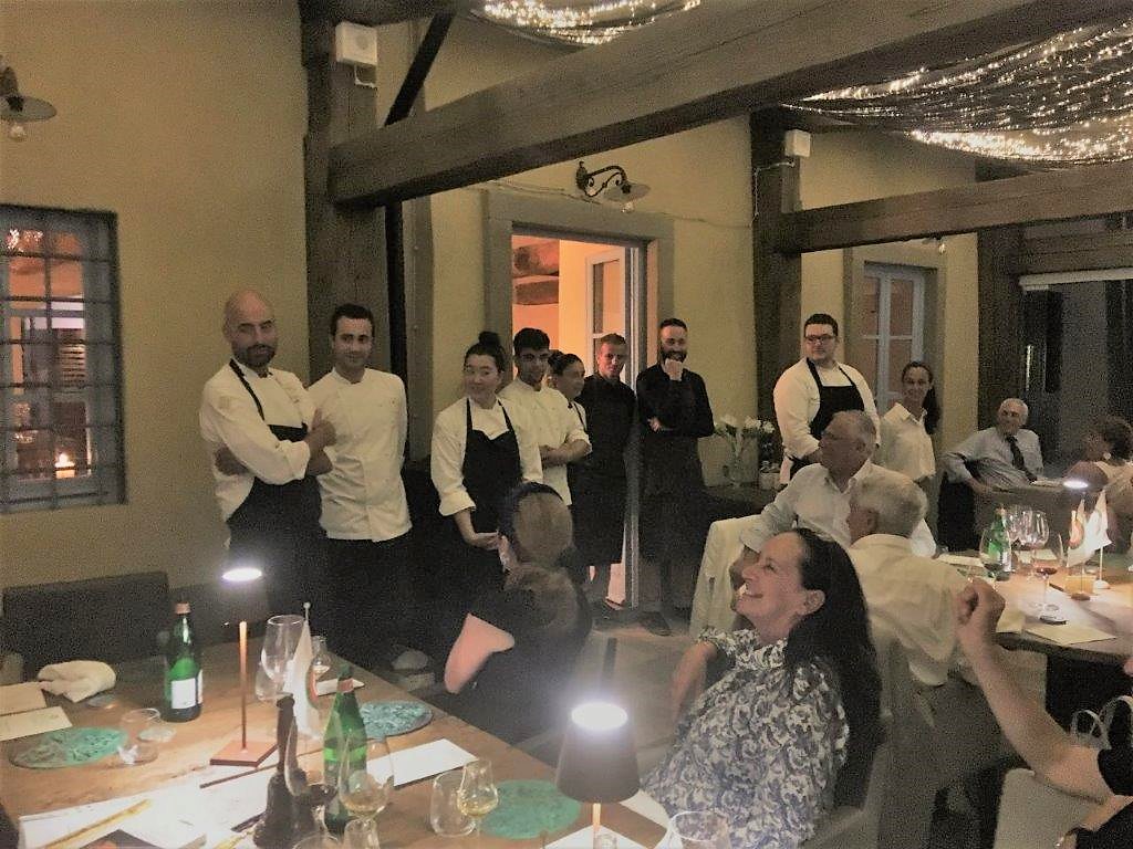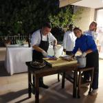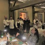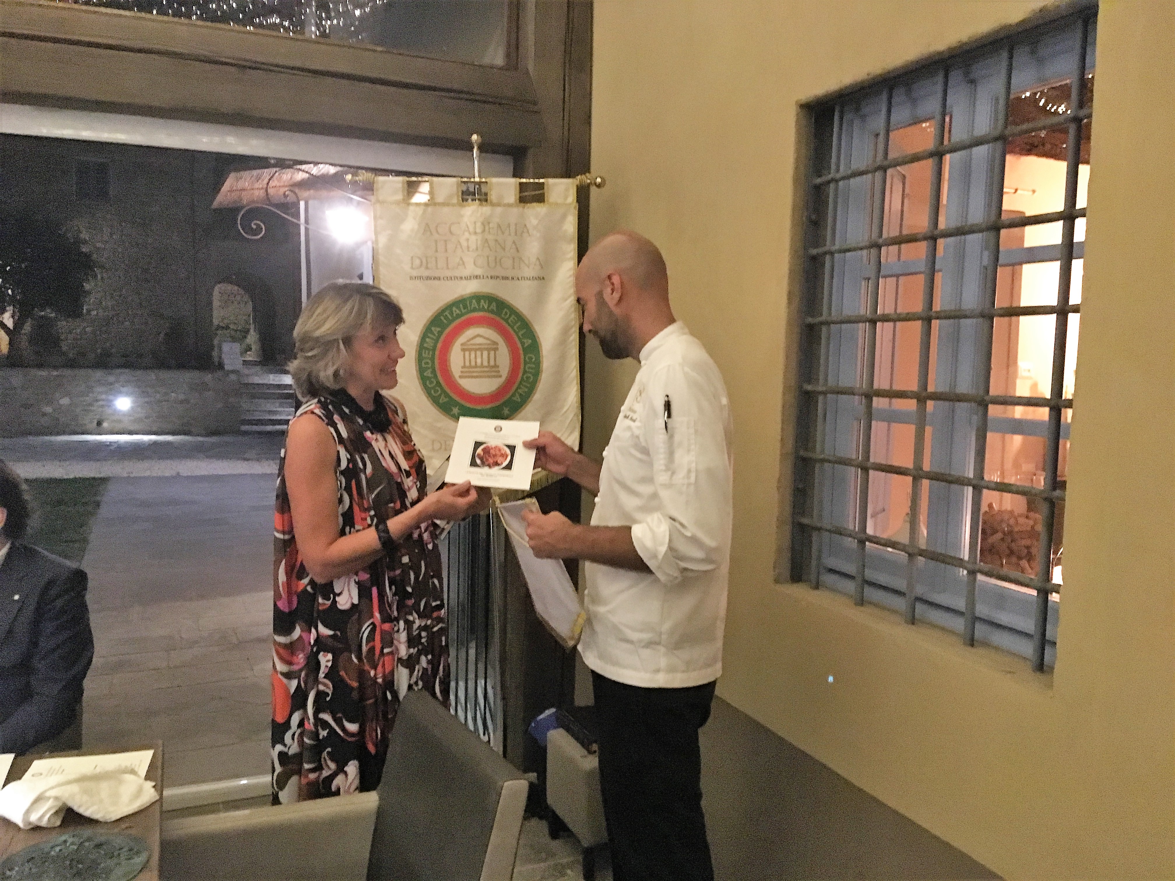 La Delegazione del Mugello si è ritrovata al ristorante "Virtuoso" all'interno della Tenuta Le Tre Virtù, un agriturismo di charme a Scarperia e San Piero (FI). In foto 1. Un momento della serata. Foto 2. La Delegata Monica Sforzini consegna al cuoco Antonello Sardi il guidoncino e alcune pubblicazioni dell'Accademia. Foto 3. Il cuoco Antonello Sardi (a sinistra) e la sua brigata. Foto 4. Cheese cake.