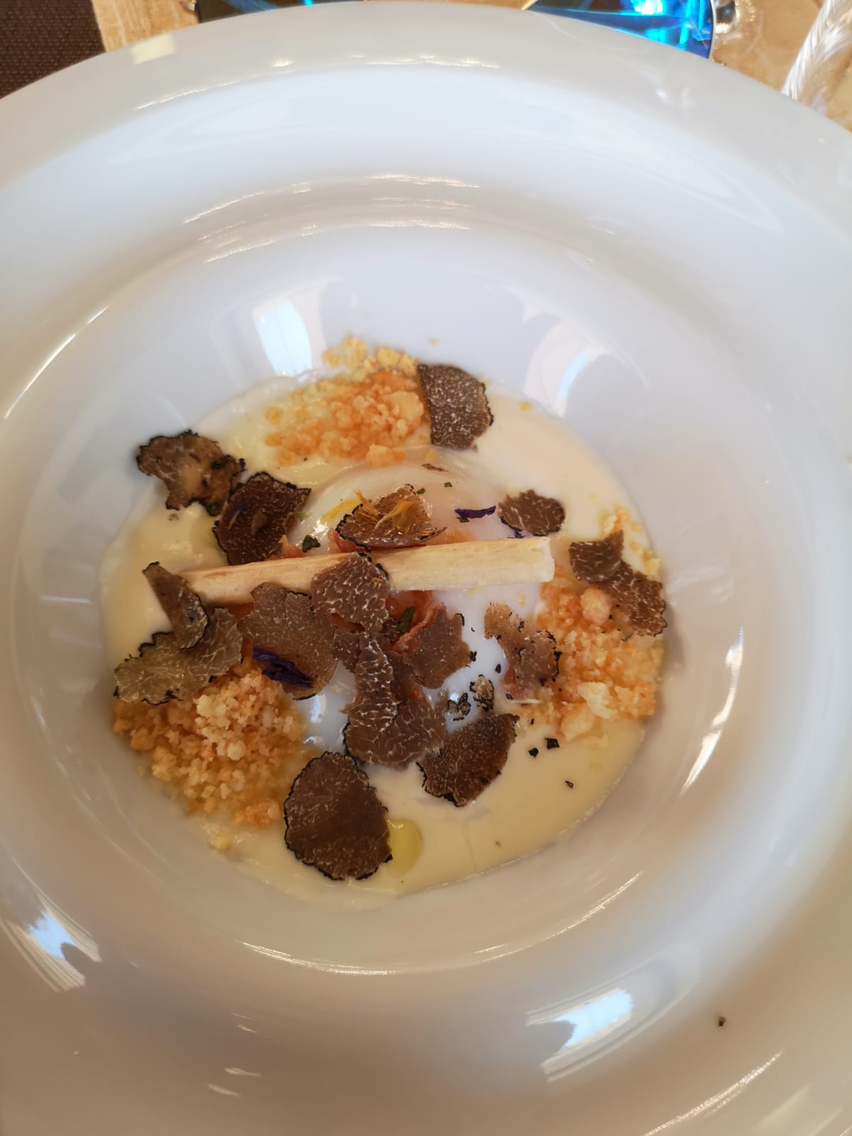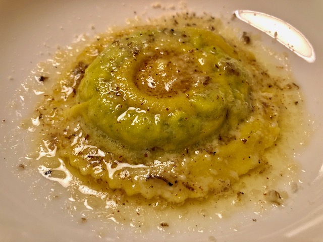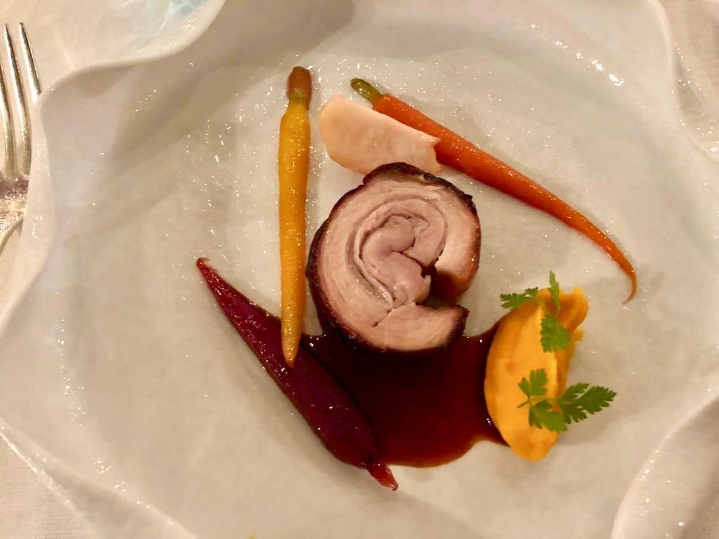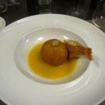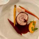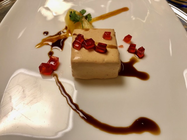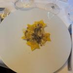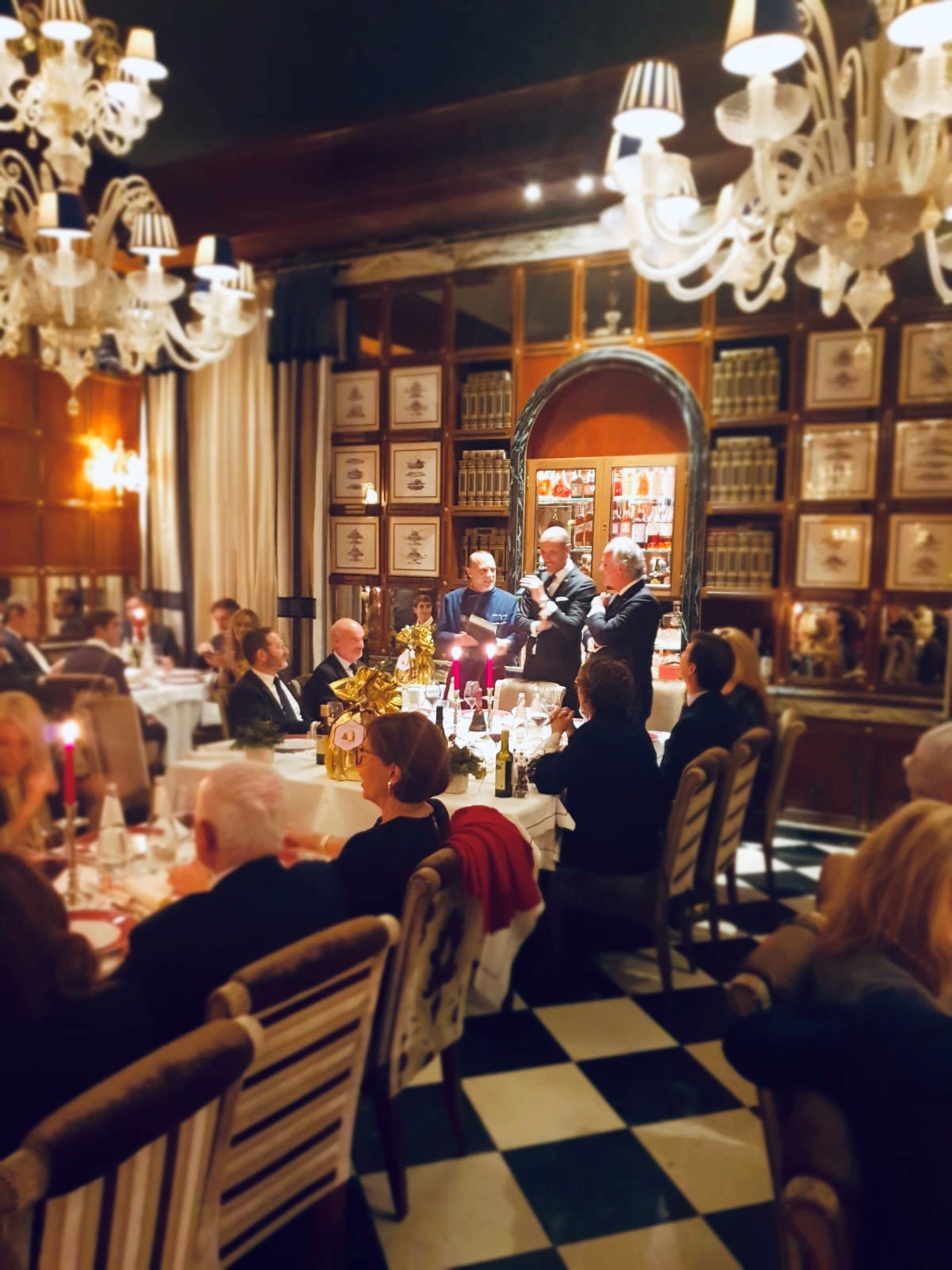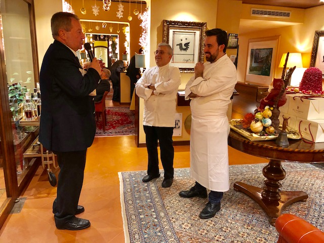 La Delegazione di Imola si è riunita presso il ristorante "San Domenico", Magnifico del Presidente, in occasione della riunione conviviale degli auguri. Foto 1: un momento della serata, in primo piano a destra il Vice Presidente dell'Accademia Severino Sani e alla sua sinistra il Delegato di Imola Antonio Gaddoni. Foto 2: il pluaso finale alla brigata di cucina guidata dagli chef Valentino Mercattilii e Massimiliano Mascia. Foto 3: millefoglie di fagiano e fegato d'oca con purea di mele golden e gelatina al Porto. Foto 4: uovo in raviolo "San Domenico" con burro di malga, parmigiano dolce e tartufo di stagione.