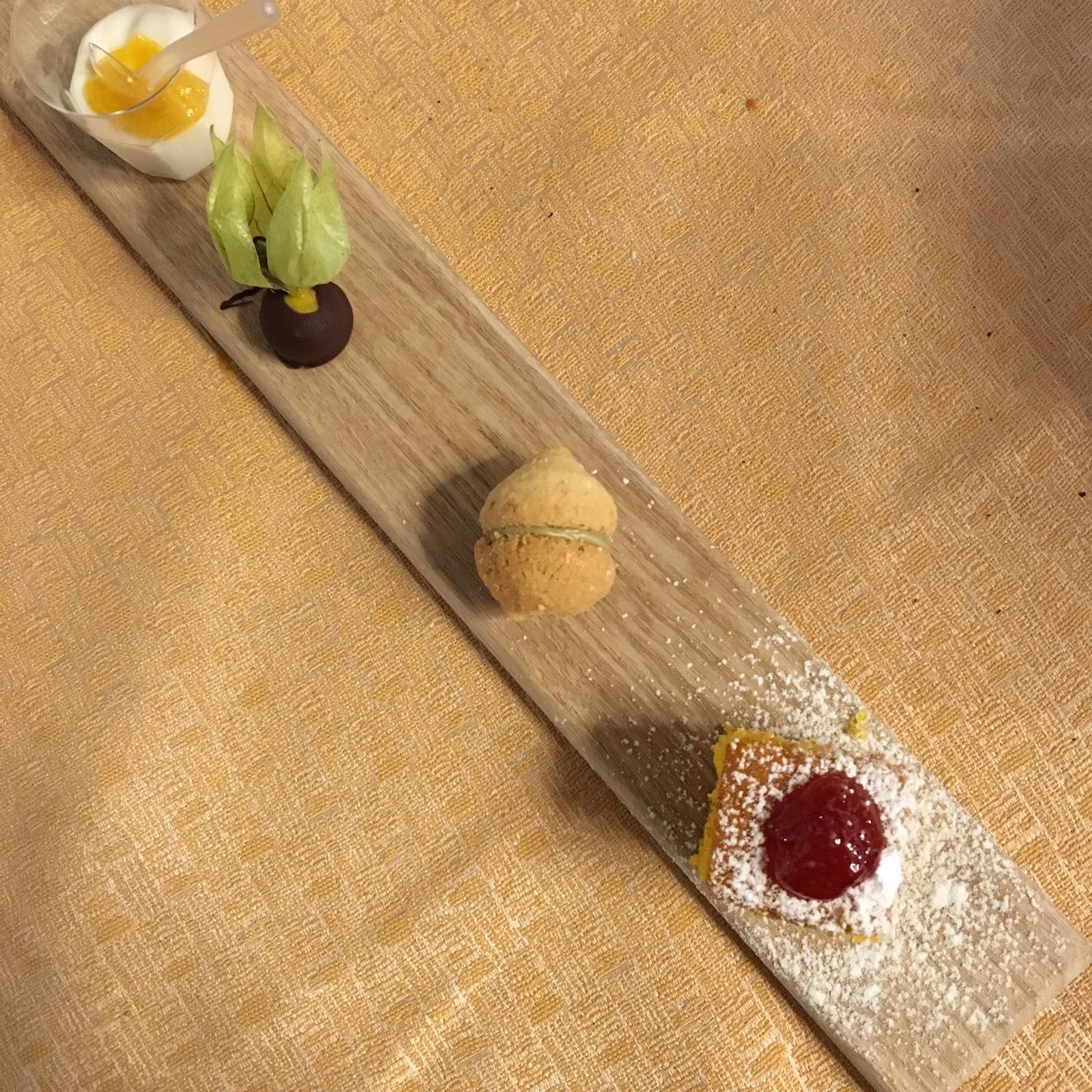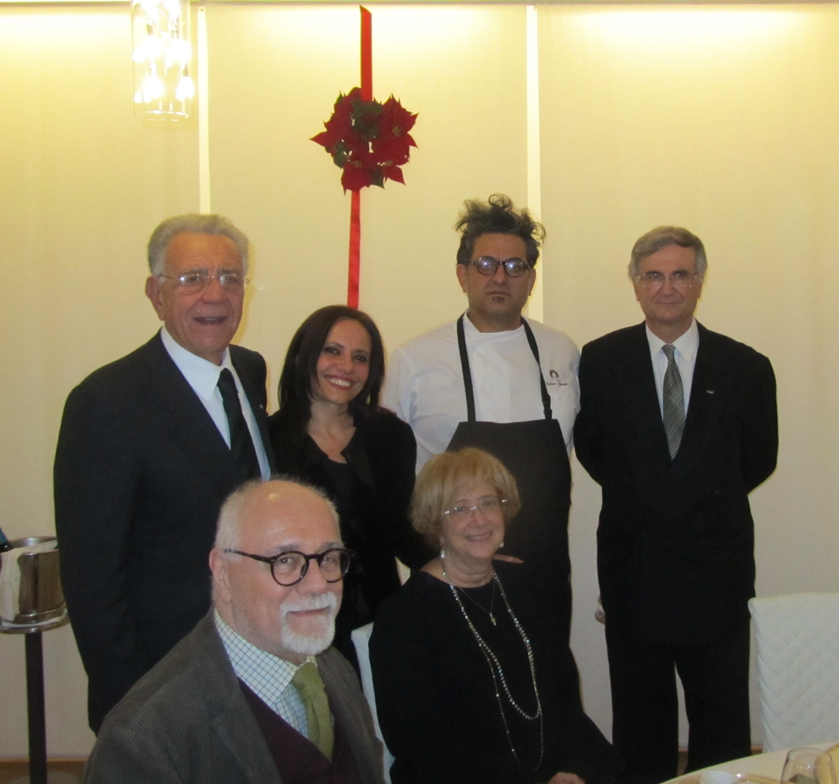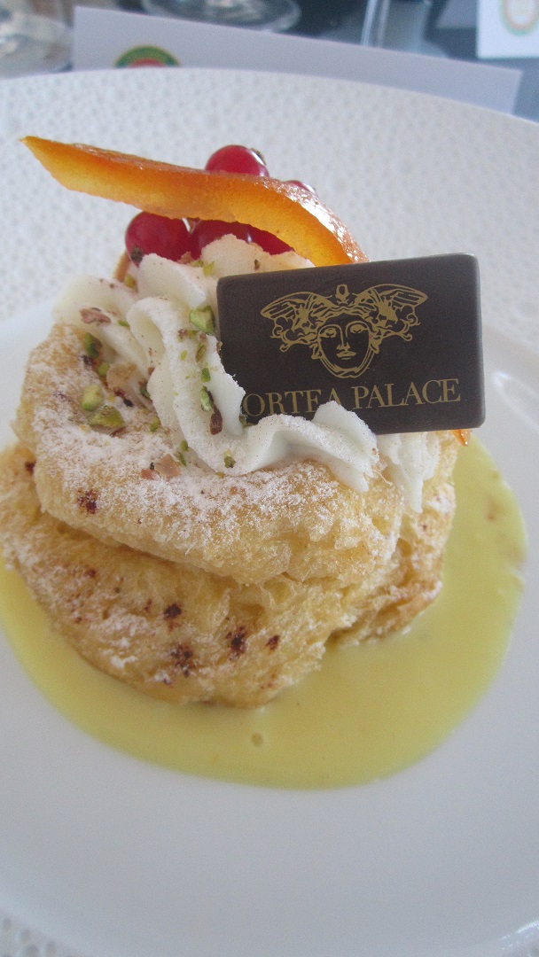 La Delegazione di Siracusa si è riunita per gli auguri di Natale presso il ristorante "Incanto" del Luxury Hotel "Ortea Palace" in Ortigia. Foto 1: (da sinistra) Dott. Carmelo Frittitta Direttore Generale dell'Assessorato all'Agricoltura della Regione Sicilia, Cettina Pipitone Voza Direttore CST - Sicilia Orientale, Angelo Tamburini Delegato di Siracusa e Vittorio Sartorio Delegato di Ragusa. Foto 2: Carmelo Frittitta che ha relazionato su"Il ruolo del Cibo per l'Agro-Alimentare Regionale" e Angelo Tamburini. Foto 3: il Delegato Angelo Tamburini consegna il guidoncino al Mâitre sommelier Marco Torrisi e all'executive chef Salvatore Barbara. Foto 4: sfinci di ricotta zucchero e cannella.