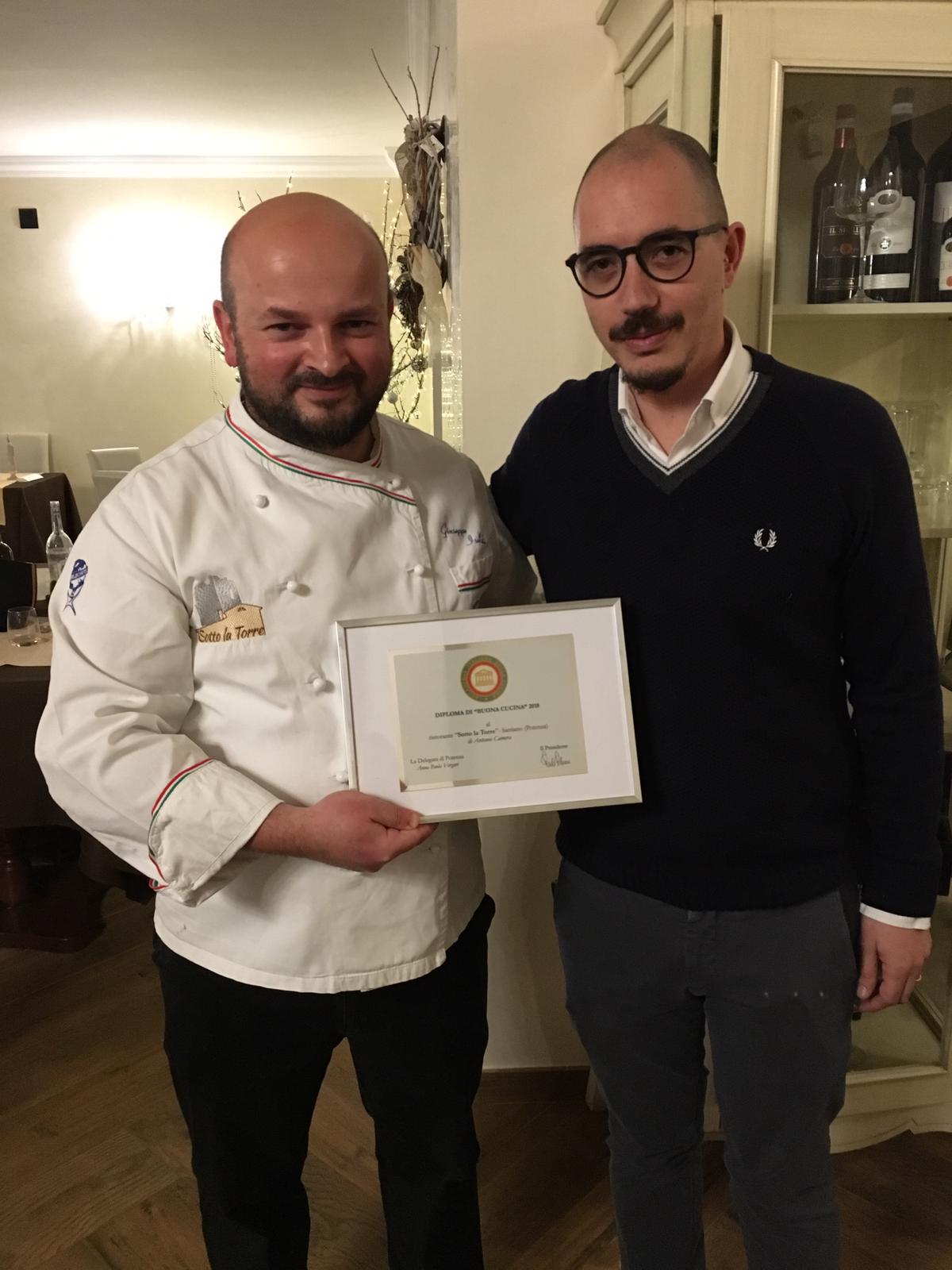 La Delegazione di Potenza si è riunita presso il ristorante "Sotto la Torre" in occasione della riunione conviviale degli auguri. Foto 1: la Delegata Anna Paola Vergari e il Vice Delegato Giudo Bonifacio consegnano il Diploma di Buona cucina allo chef Giuseppe Isoldi. Foto 2: il proprietario e lo chef con la targa. Foto 3 e 4: alcuni piatto presentati dallo chef.